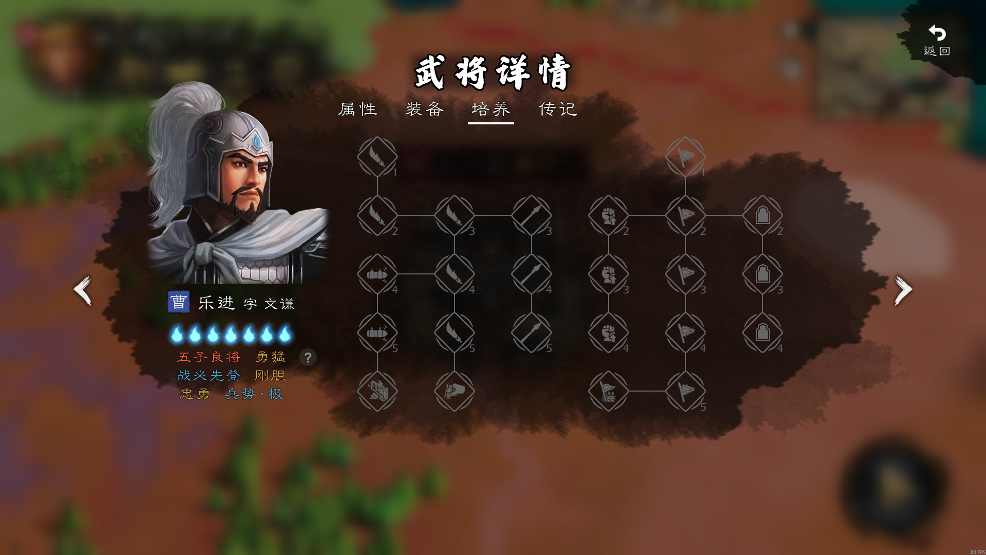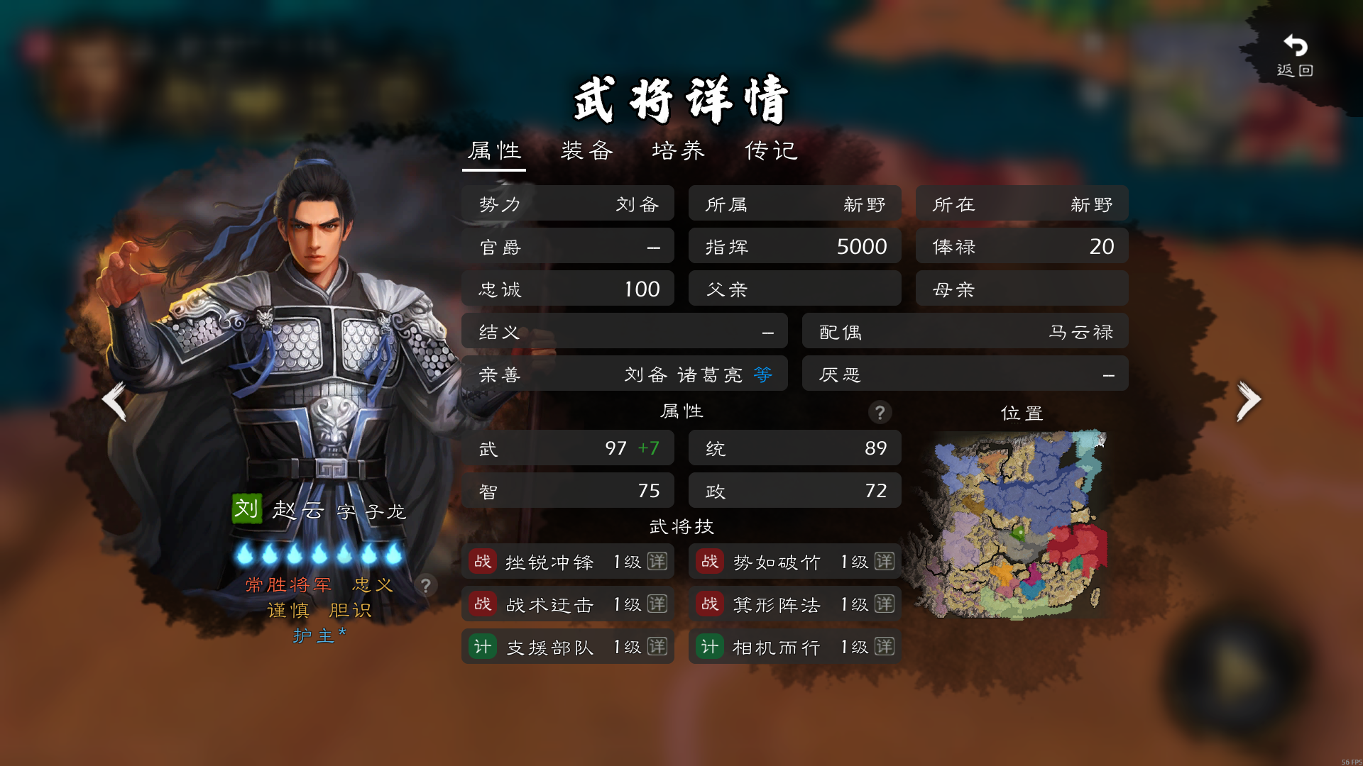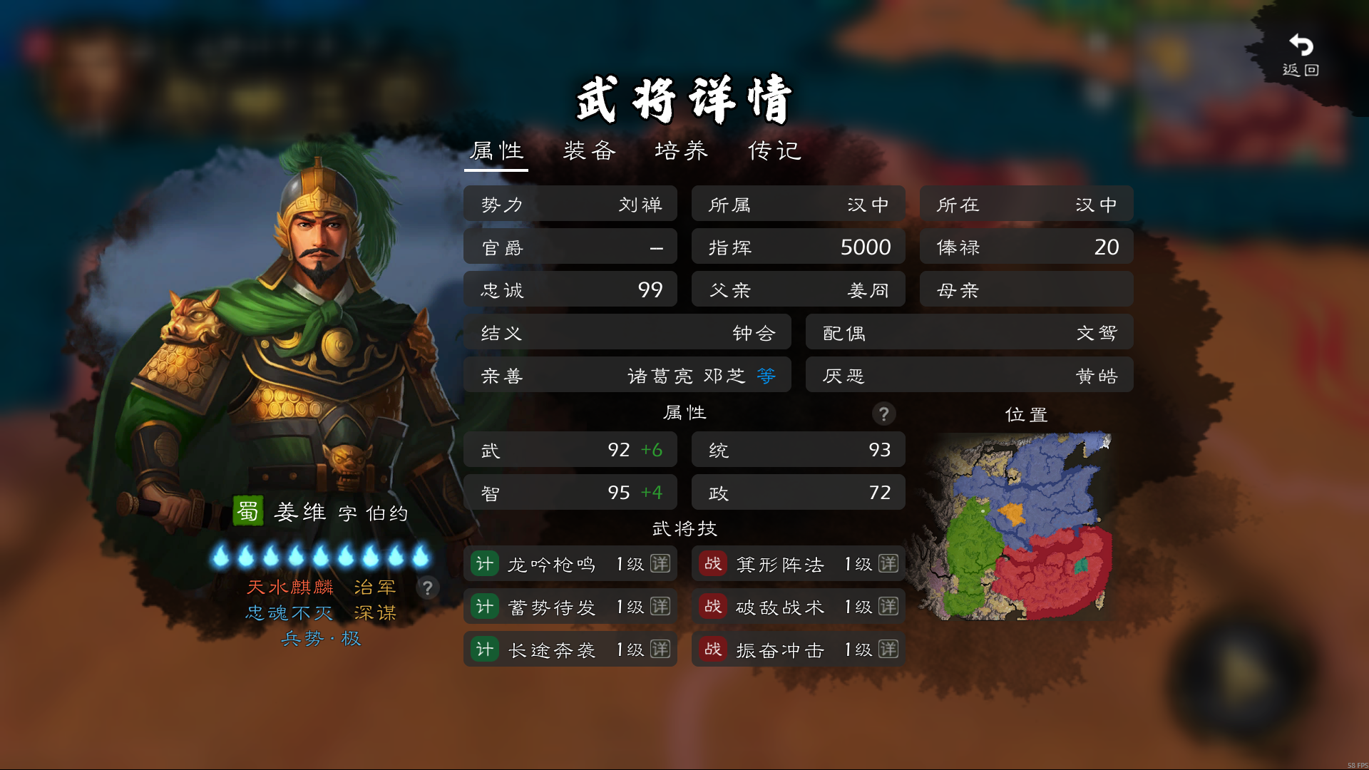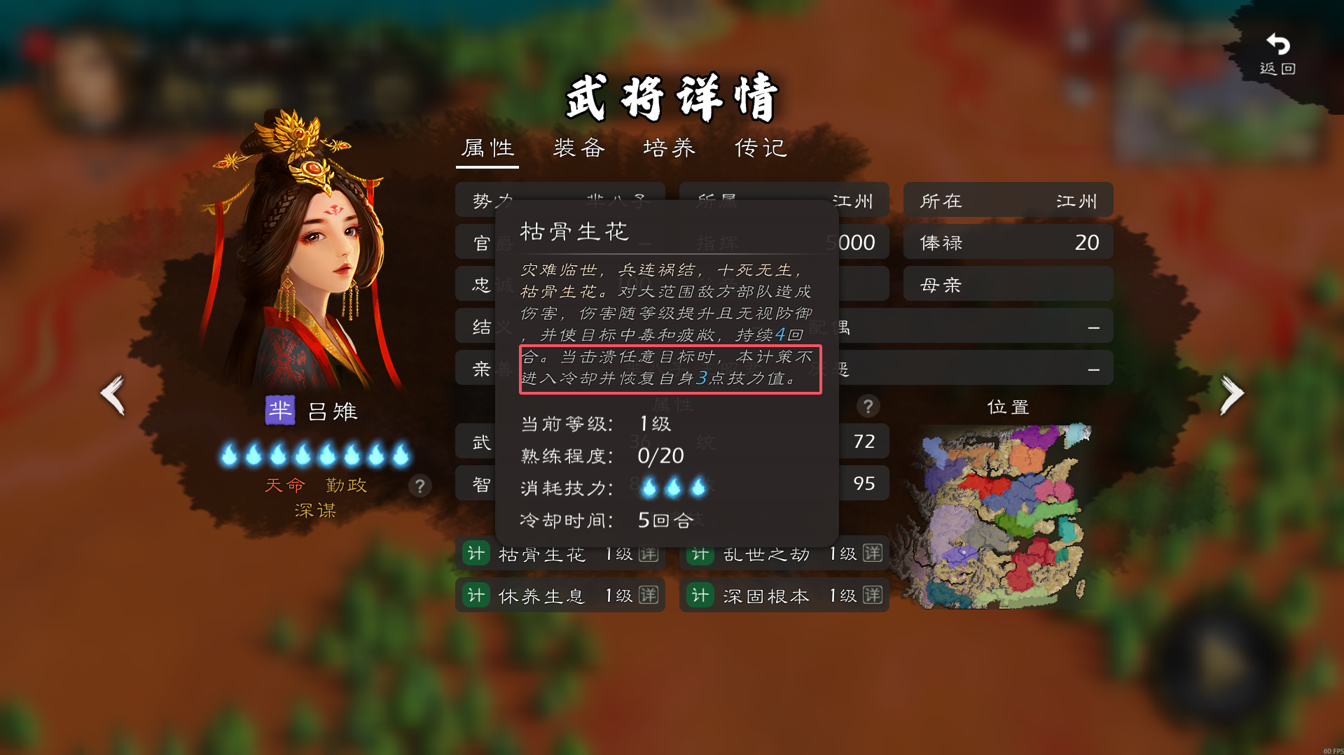 1.新特性-万法归宗(蓝):自身位于【张鲁】、【张盛】周围两圈范围内时,造成的伤害提高;主动发起攻击并击溃敌军部队时,有几率恢复1点技力值。