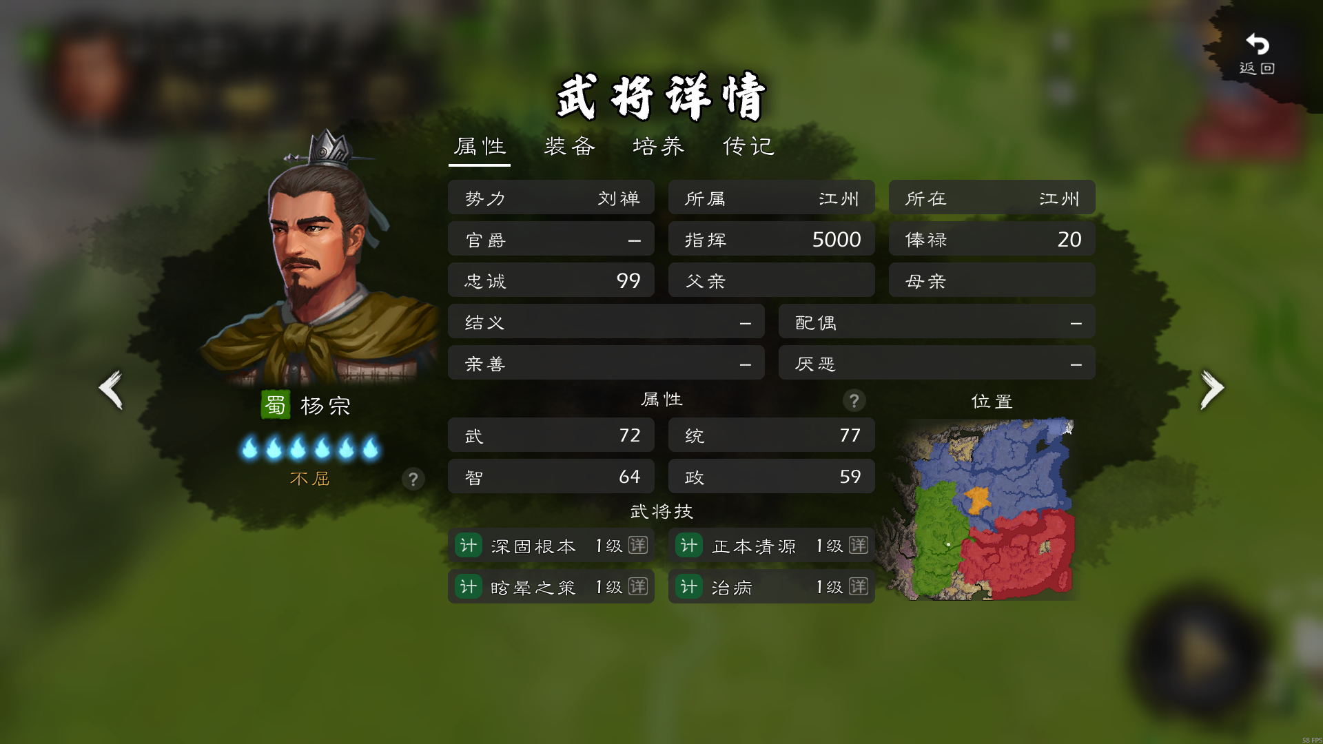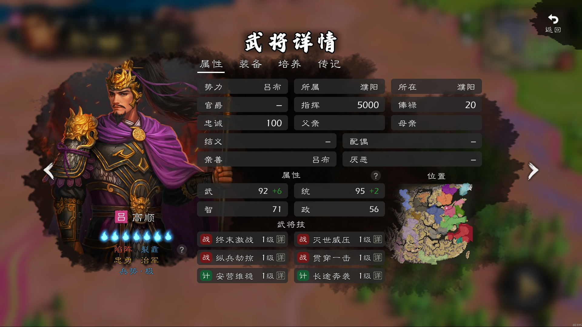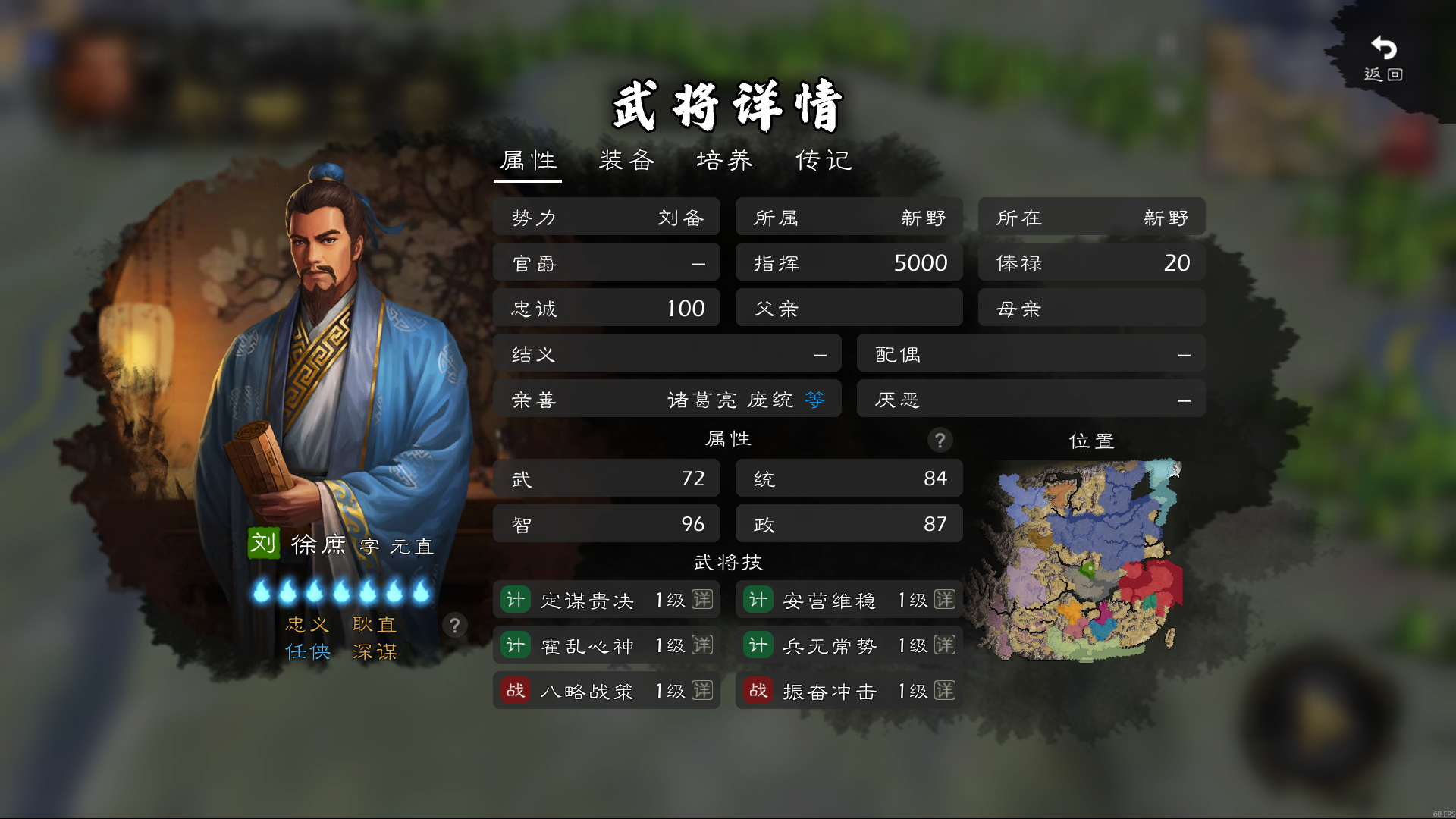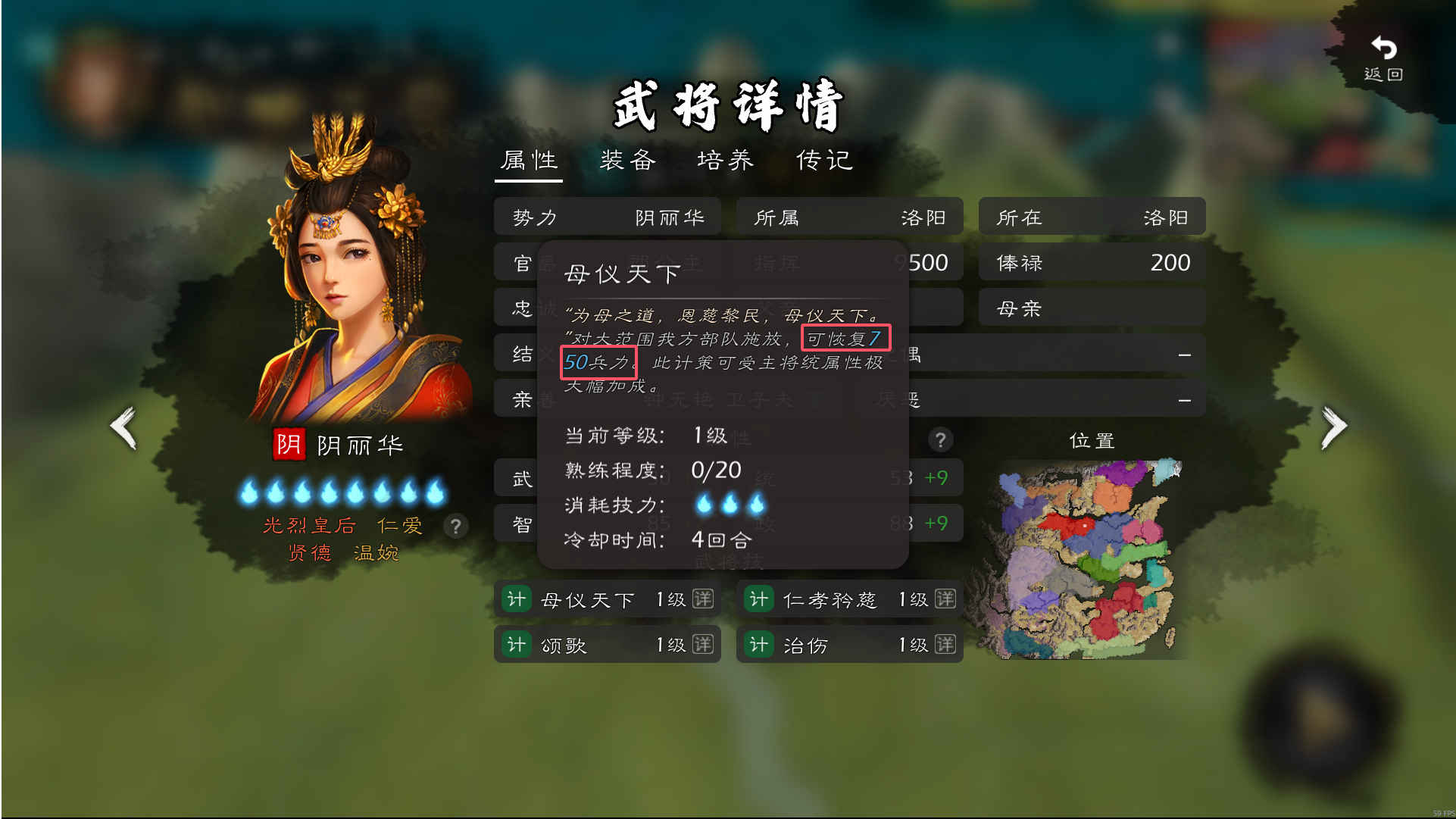 1.新特性-万法归宗(蓝):自身位于【张鲁】、【张盛】周围两圈范围内时,造成的伤害提高;主动发起攻击并击溃敌军部队时,有几率恢复1点技力值。