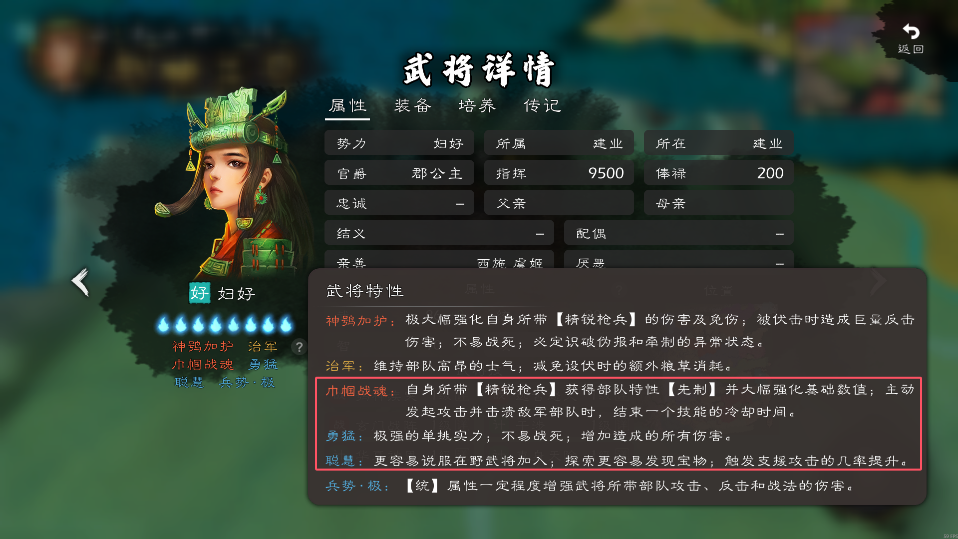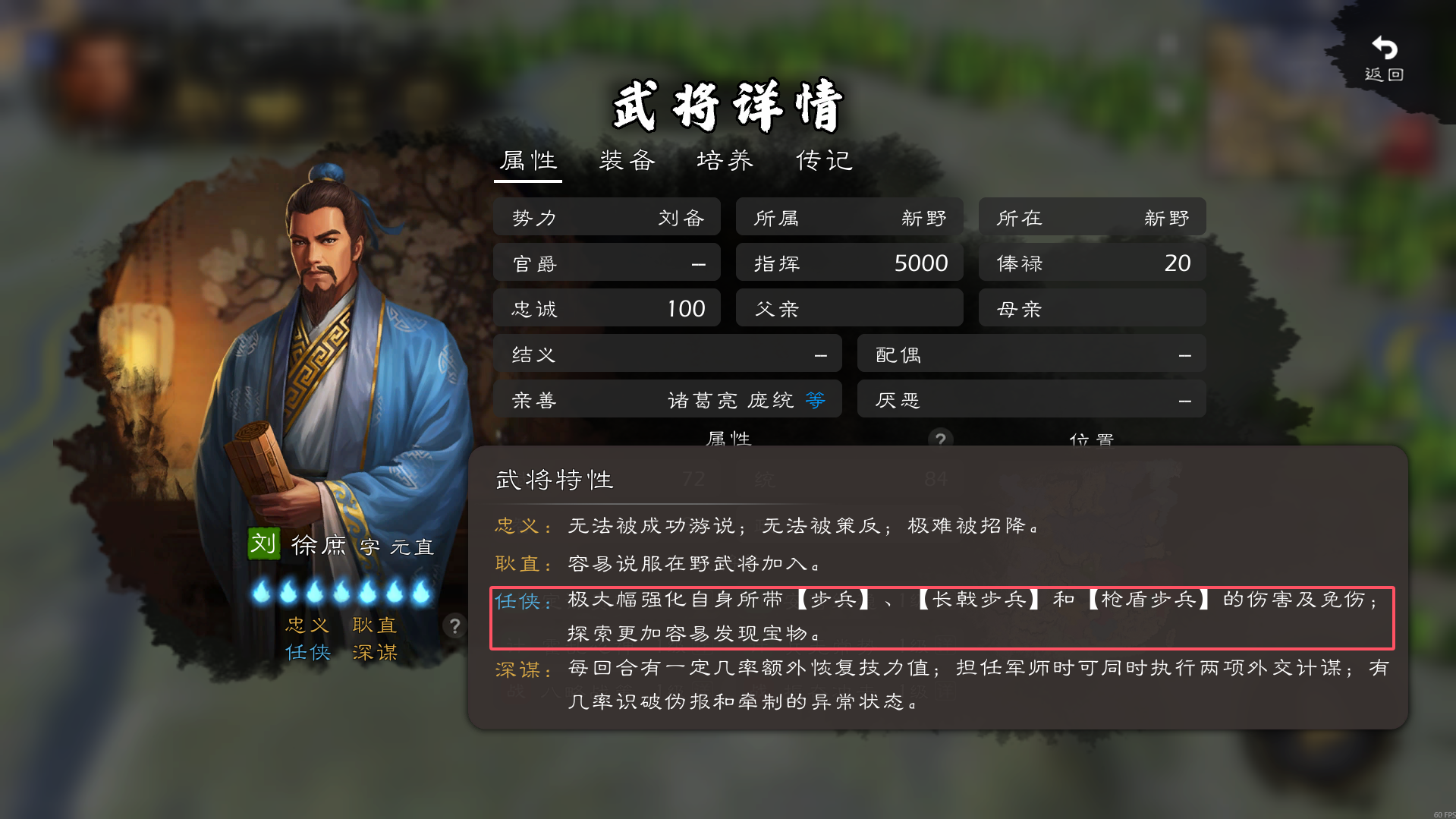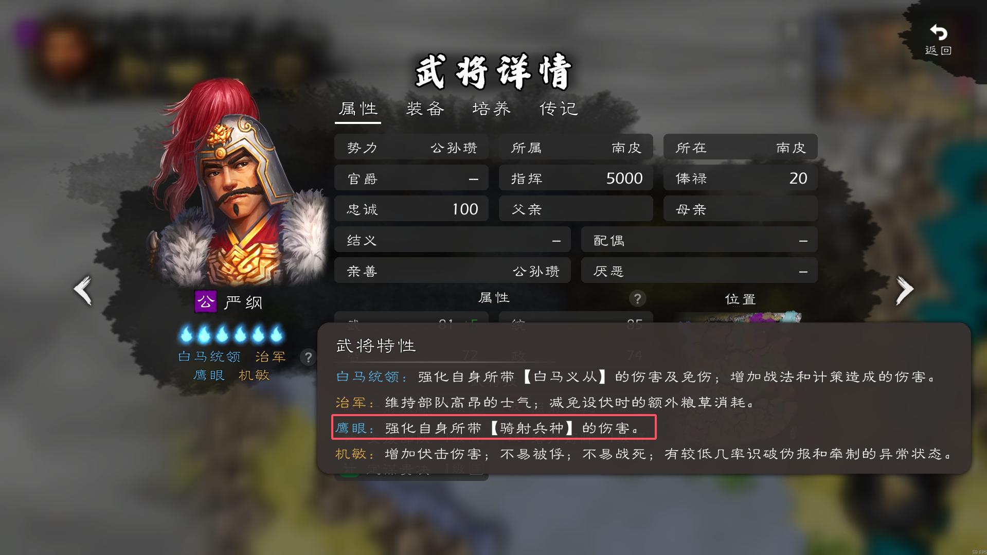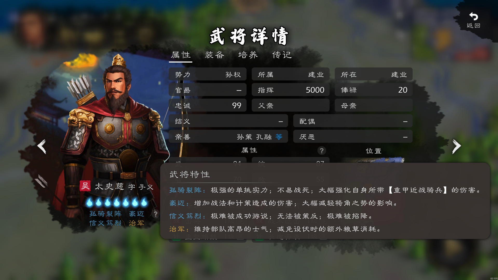 增加特性【治军】(黄):维持部队高昂的士气;减免设伏时的额外粮草消耗;