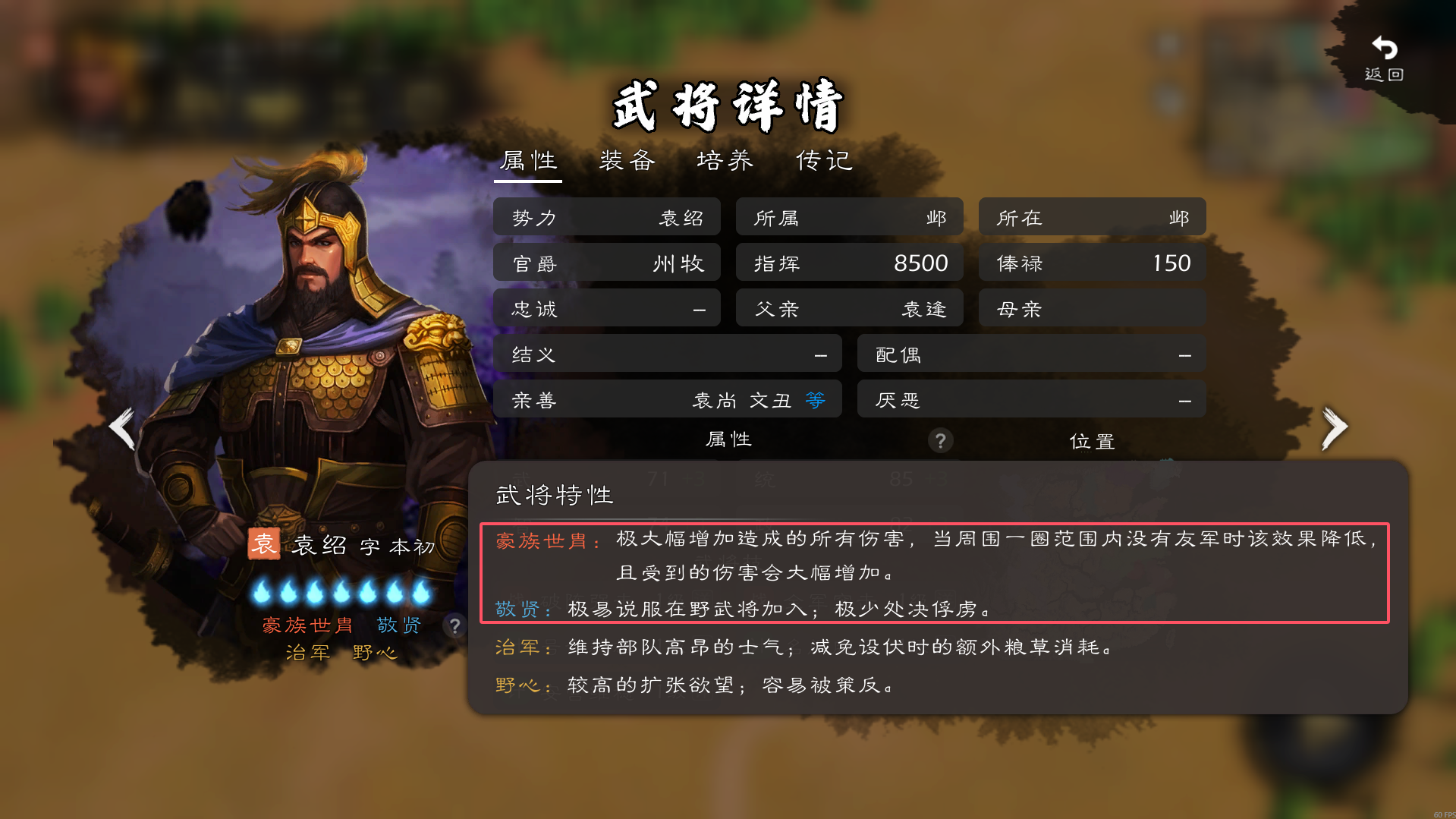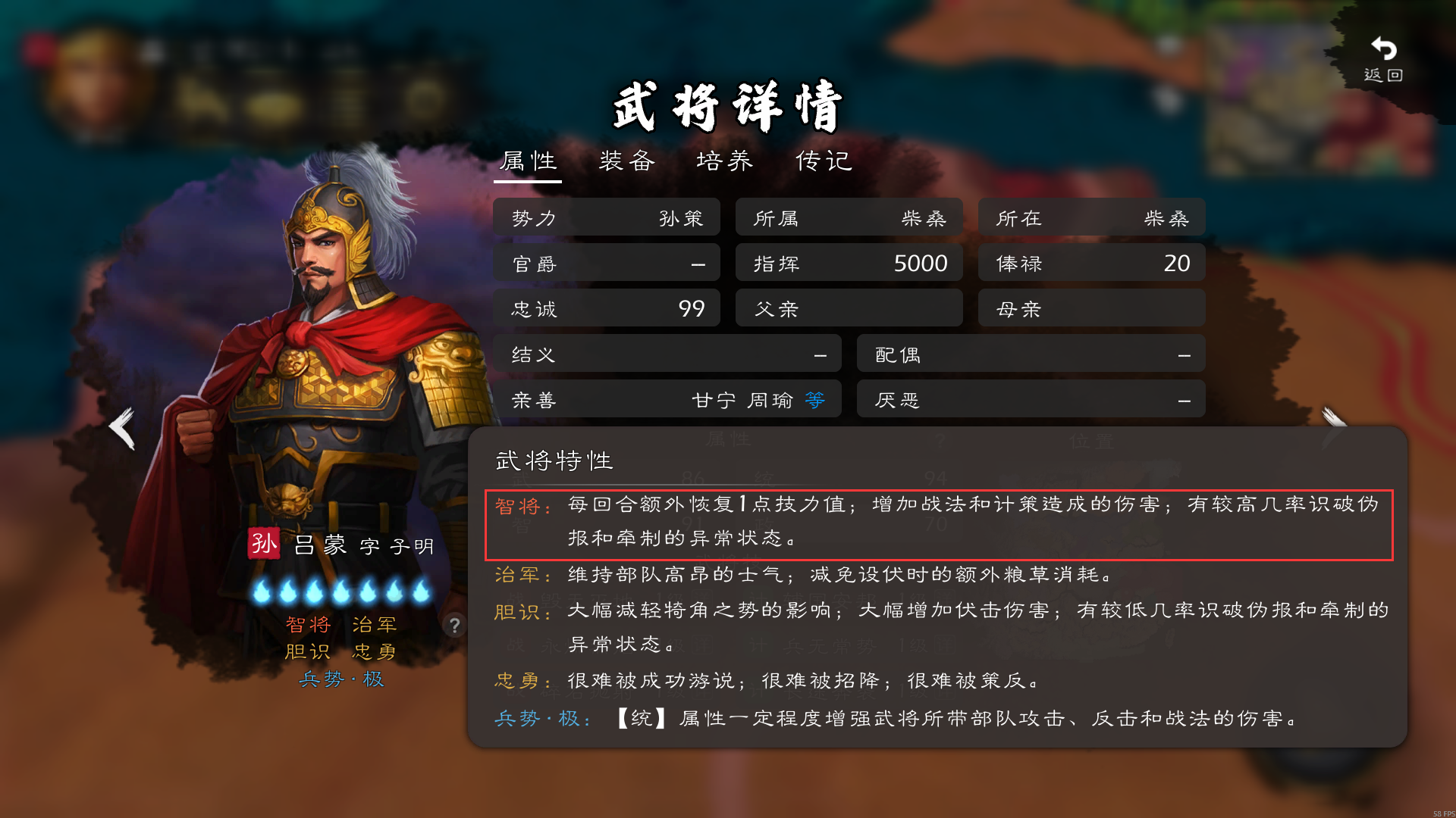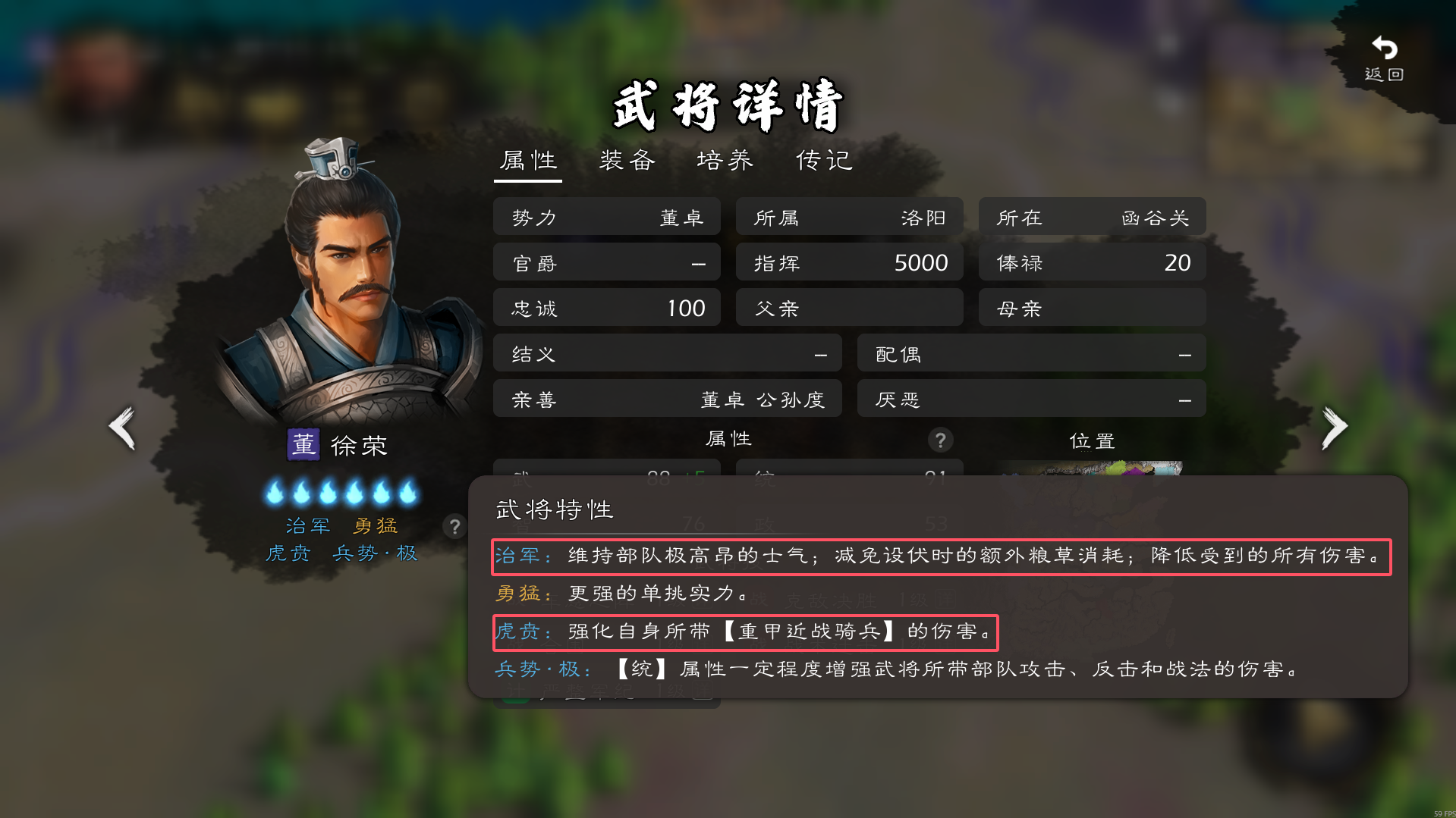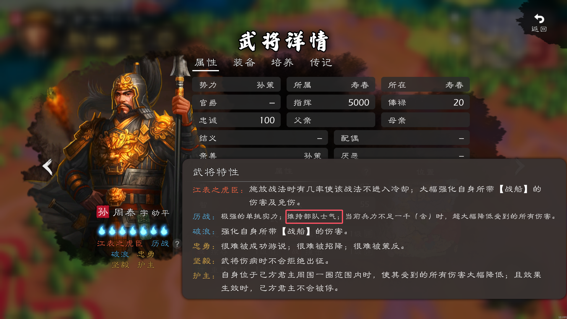 增加特性【治军】(黄):维持部队高昂的士气;减免设伏时的额外粮草消耗;