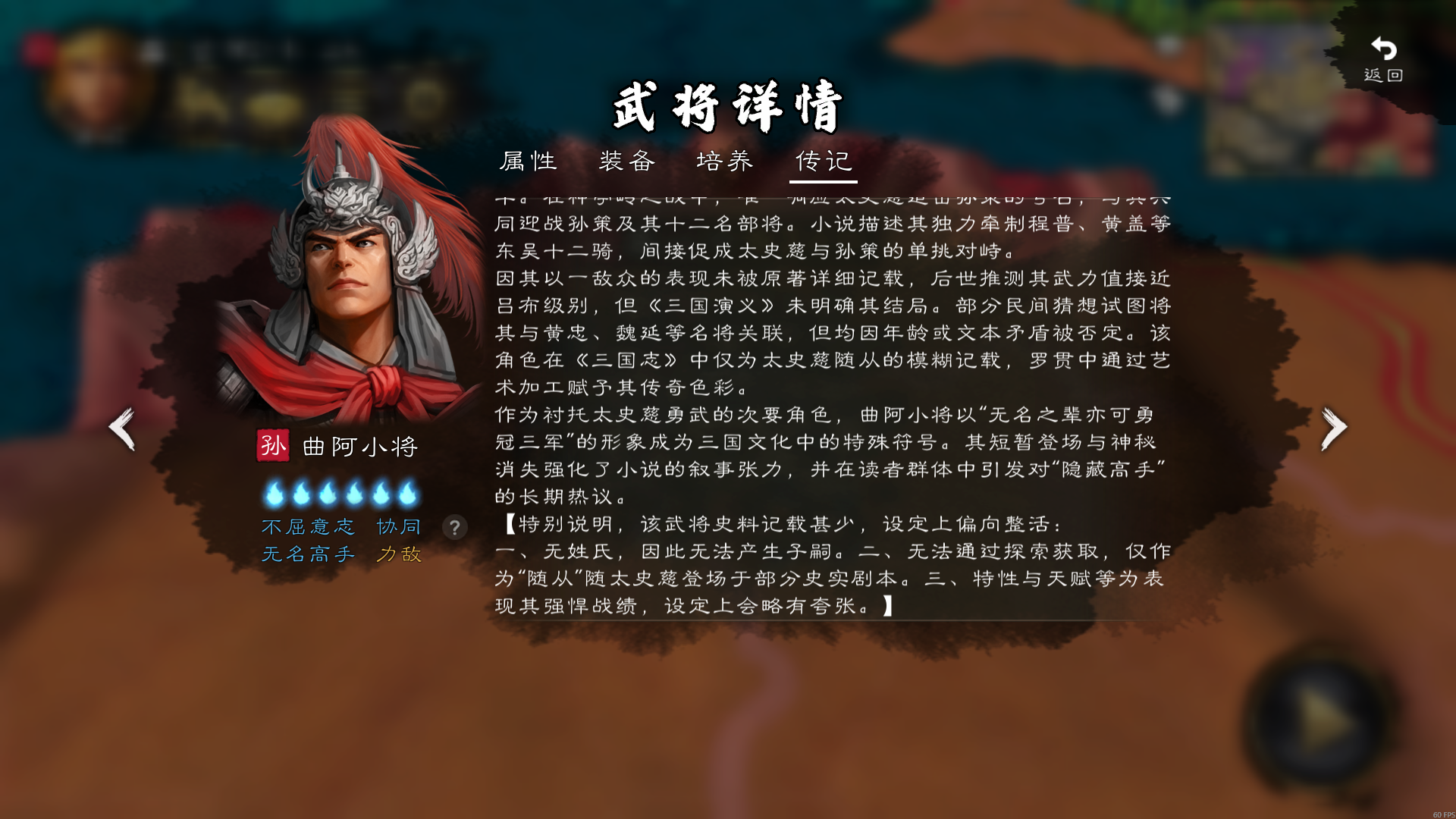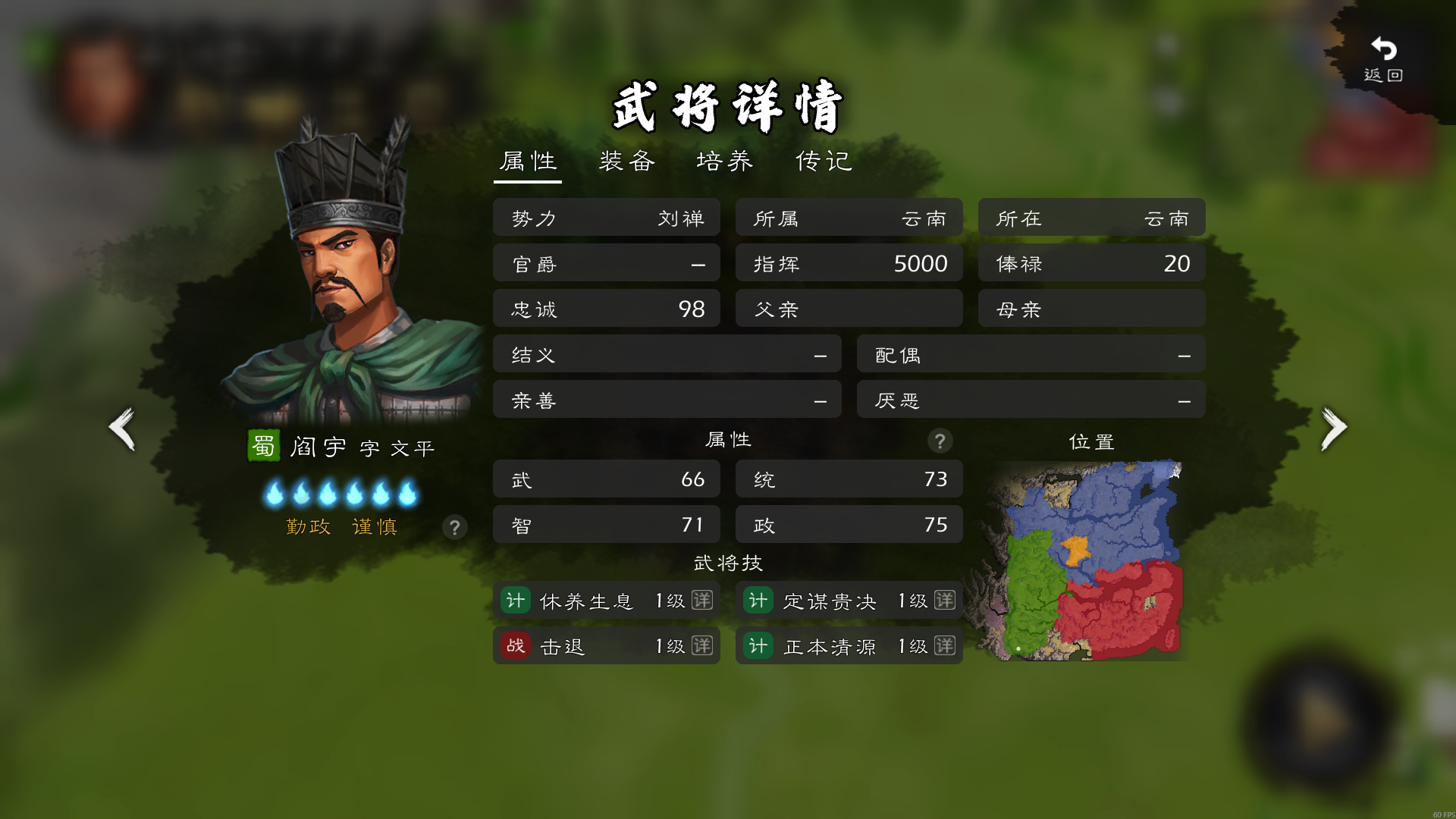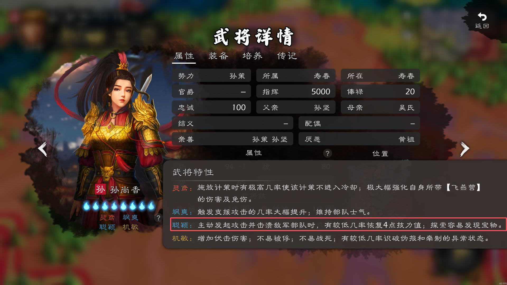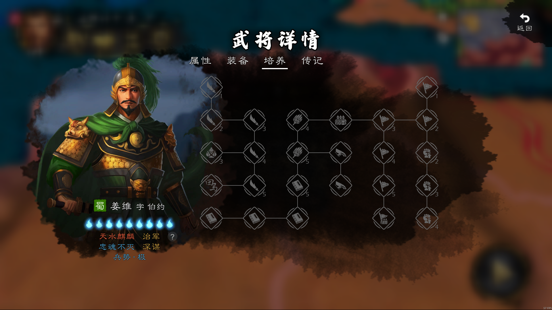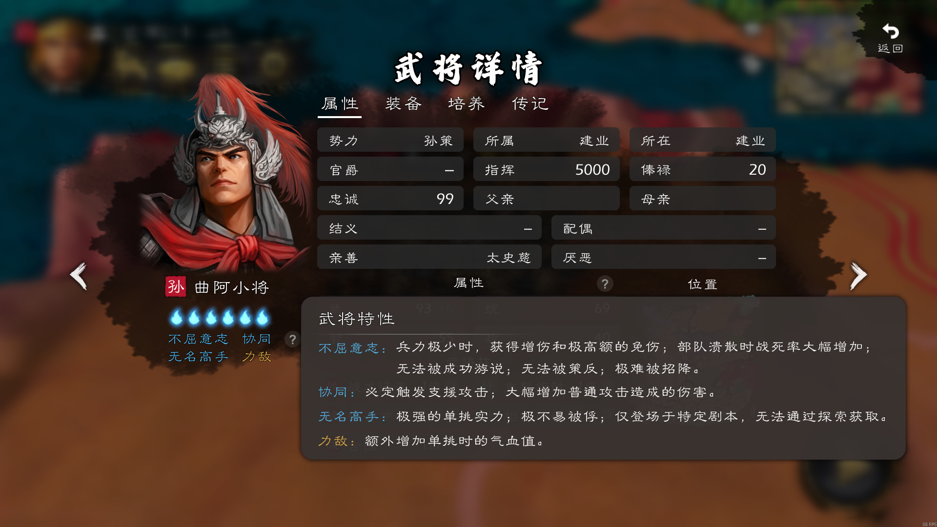 增加特性【治军】(黄):维持部队高昂的士气;减免设伏时的额外粮草消耗;
