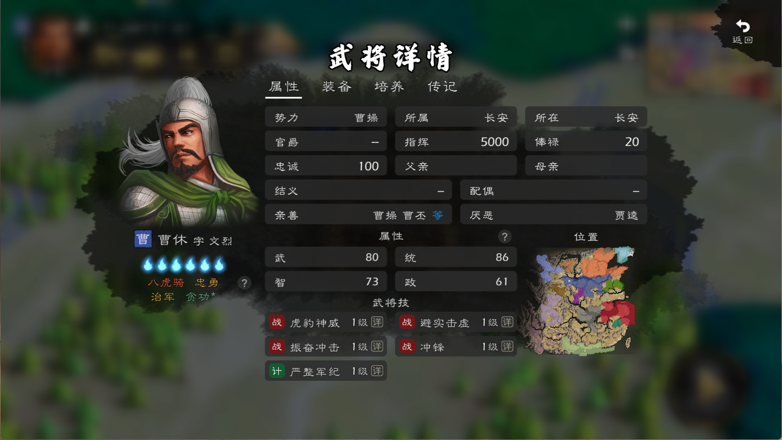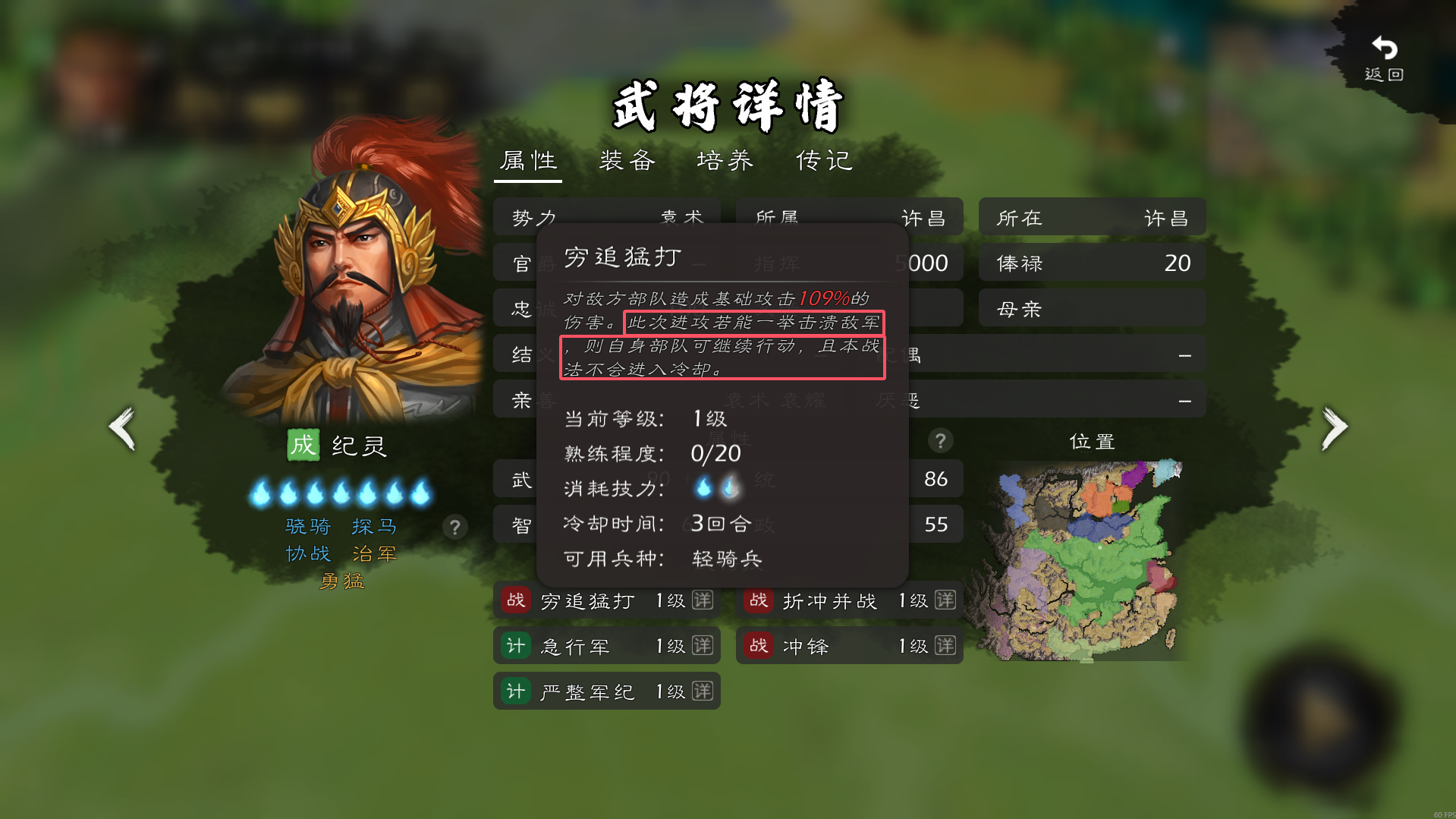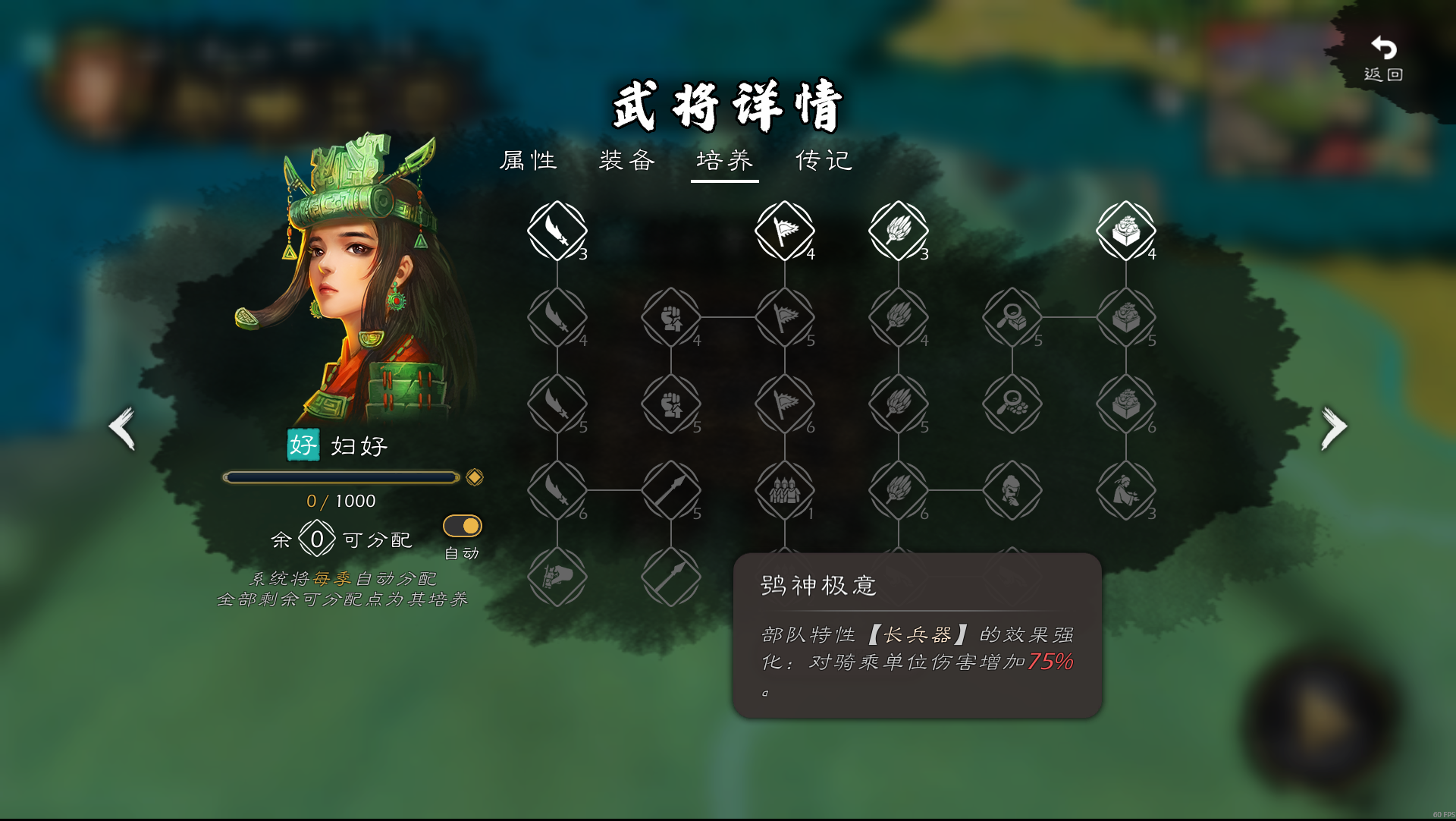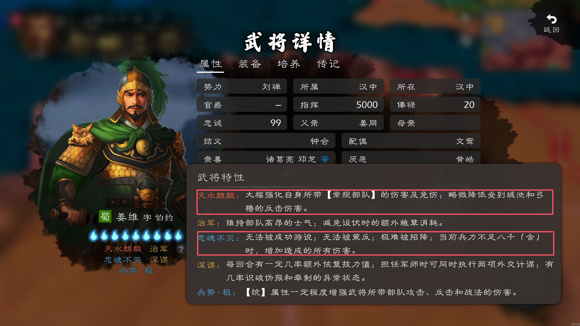 增加新特性【治军】(蓝):维持部队极高昂的士气;减免设伏时的额外粮草消耗;降低受到的所有伤害;