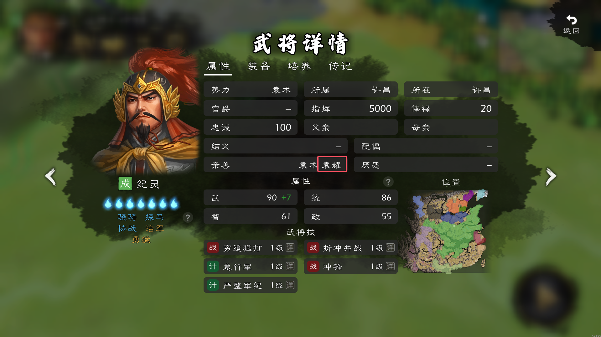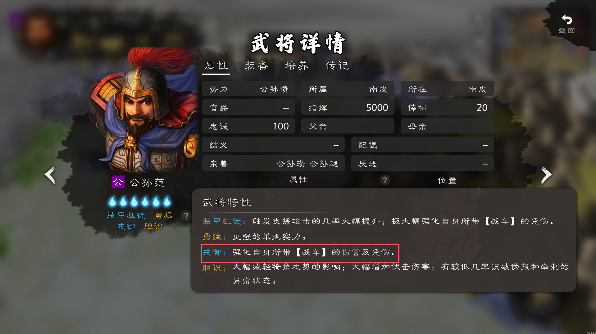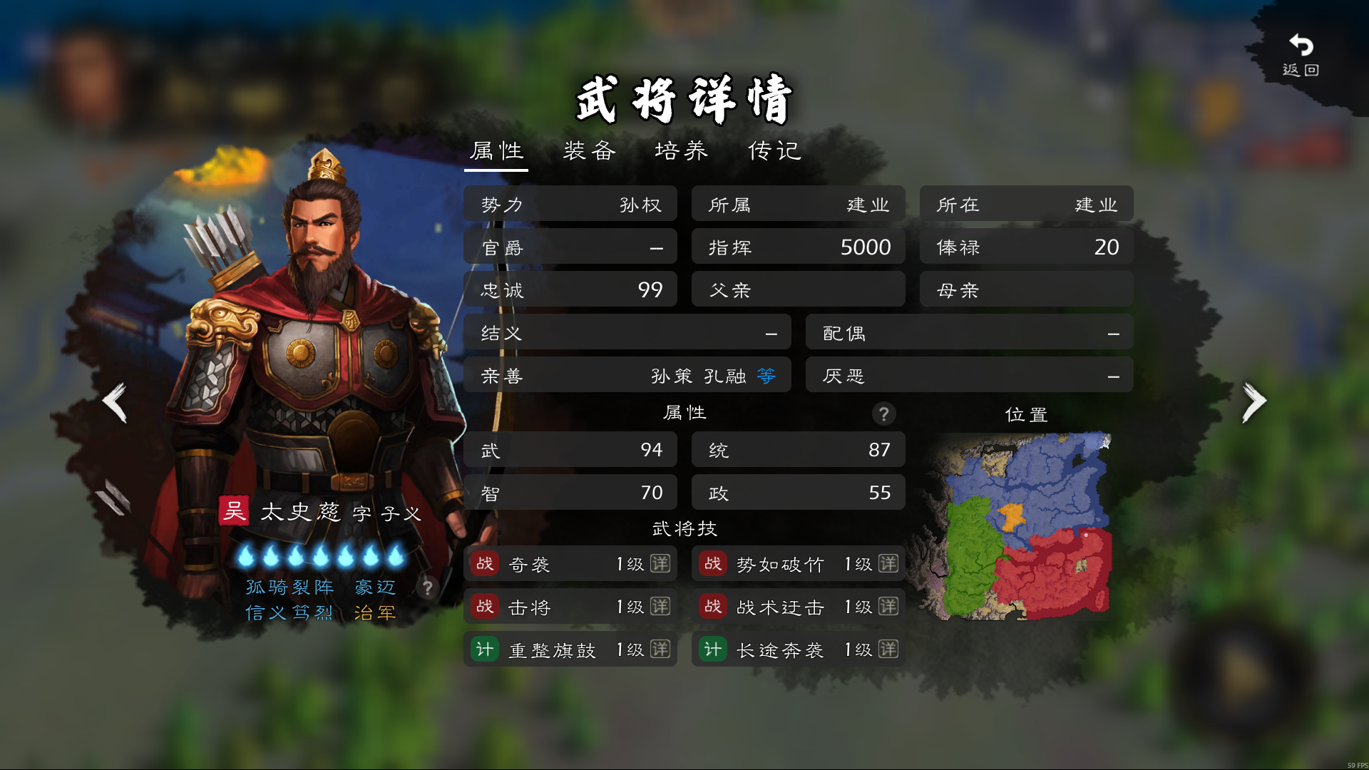 增加新特性【治军】(蓝):维持部队极高昂的士气;减免设伏时的额外粮草消耗;降低受到的所有伤害;