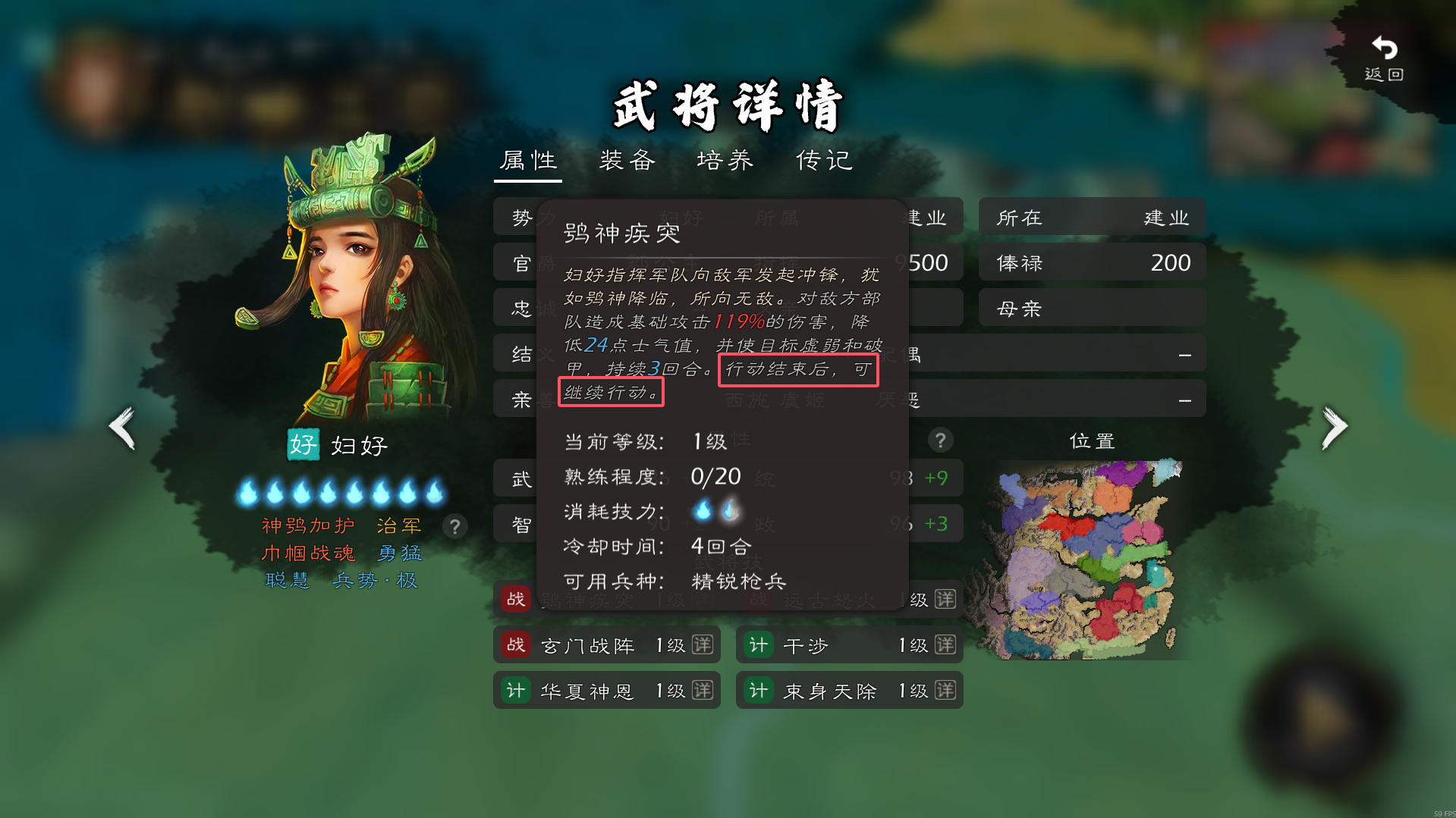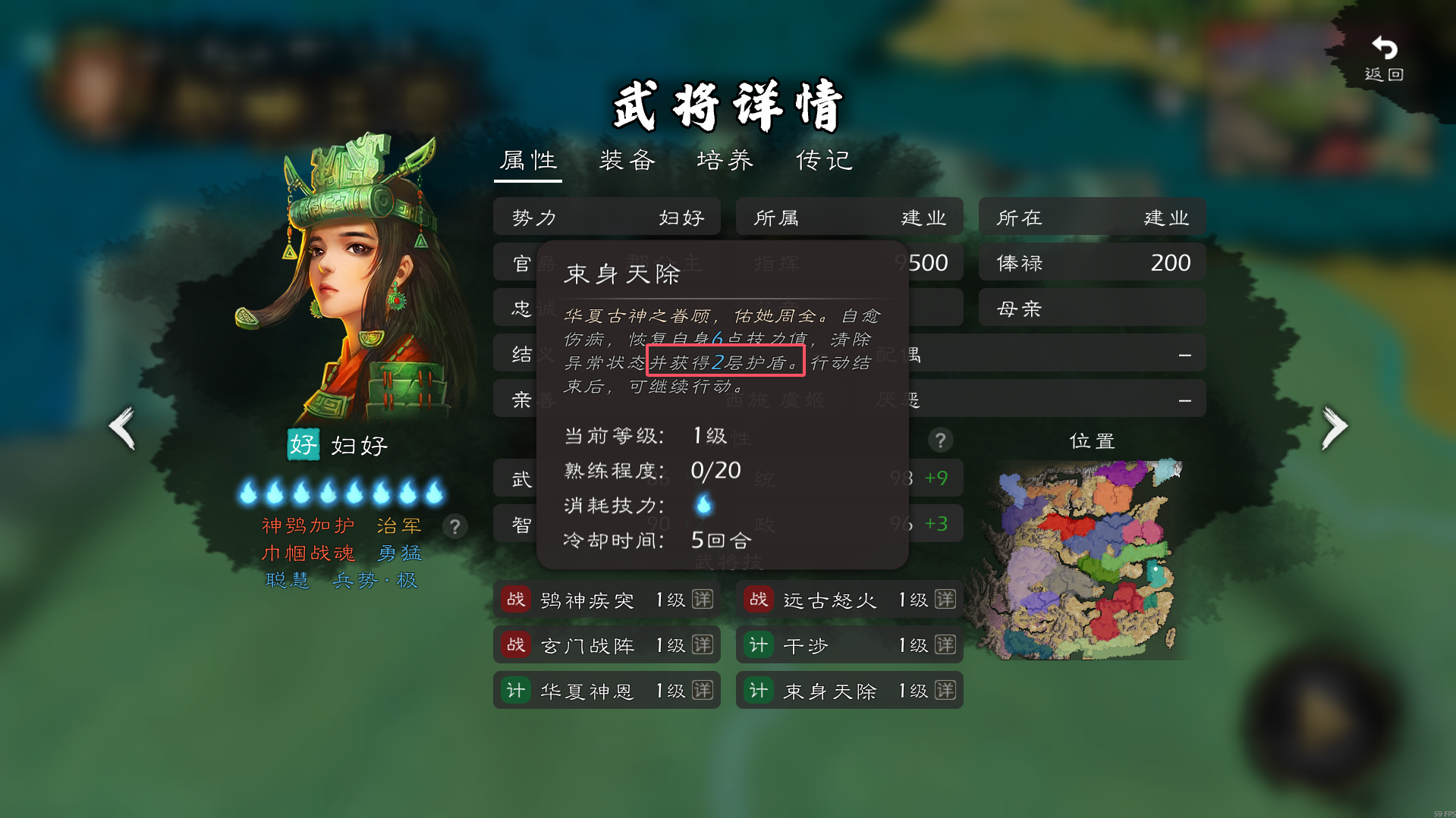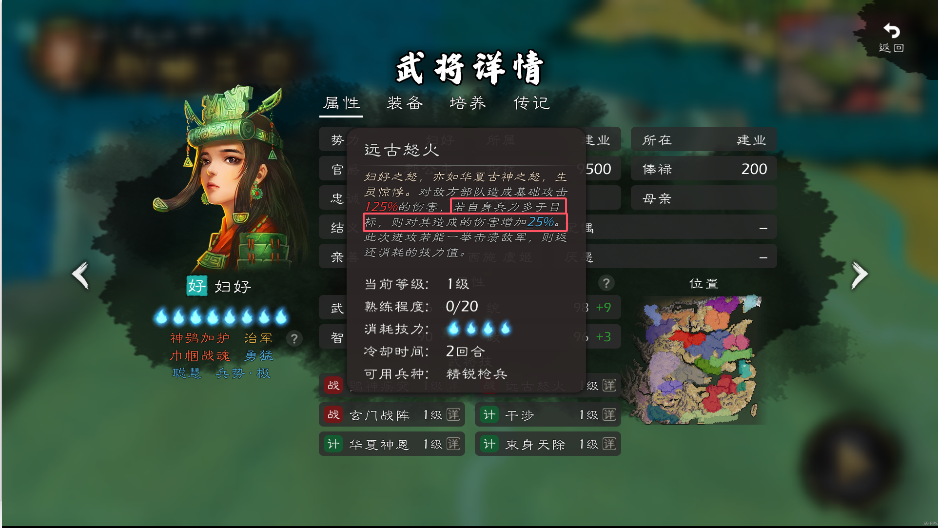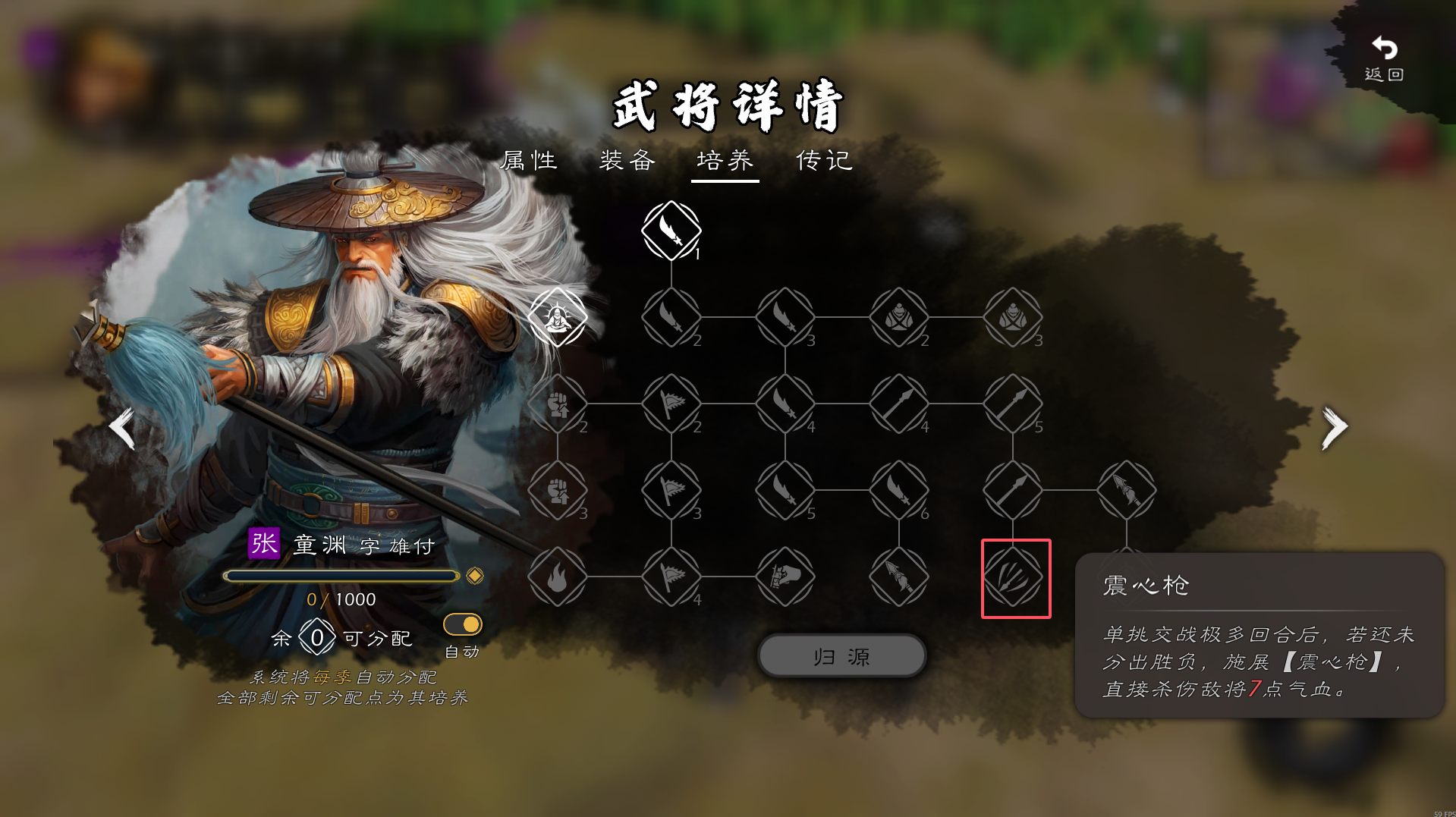1.新特性-万法归宗(蓝):自身位于【张盛】、【张璇】周围两圈范围内时,造成的伤害大幅提高;主动发起攻击并击溃敌军部队时,有较高几率恢复1点技力值。