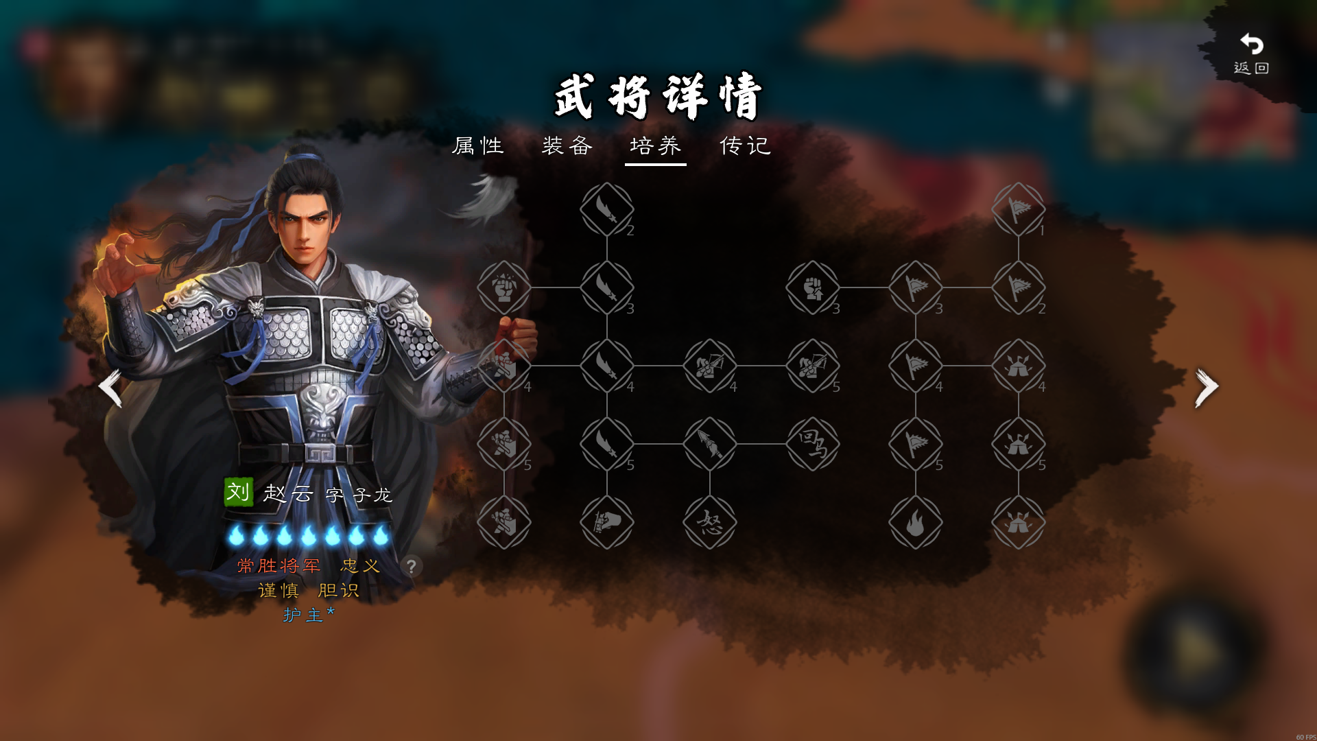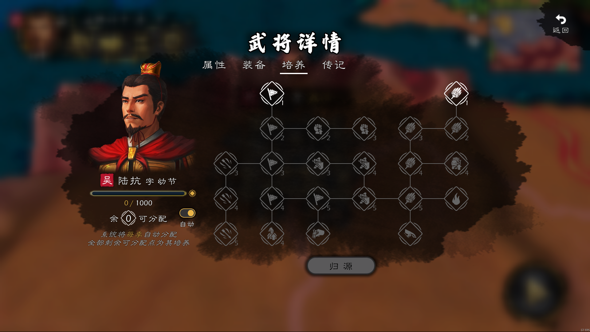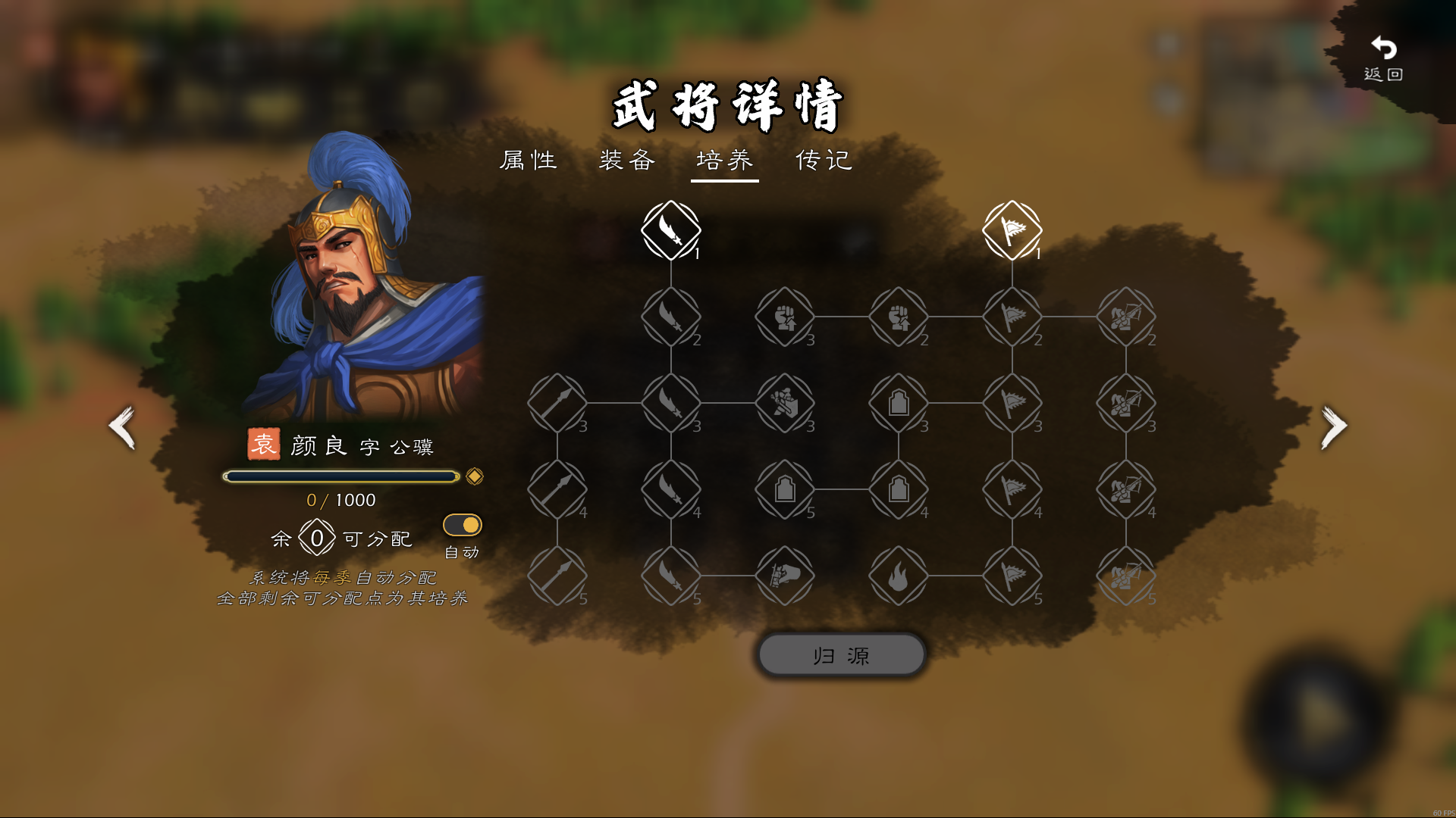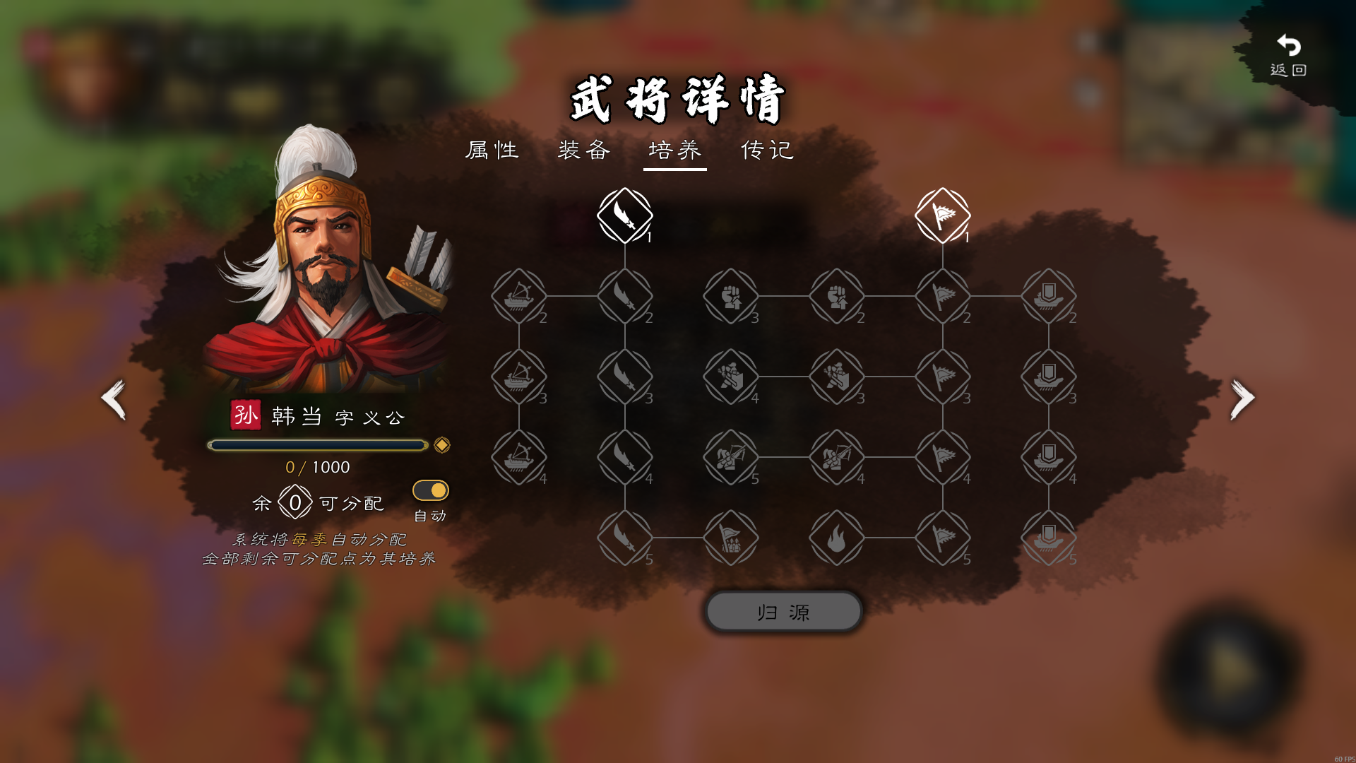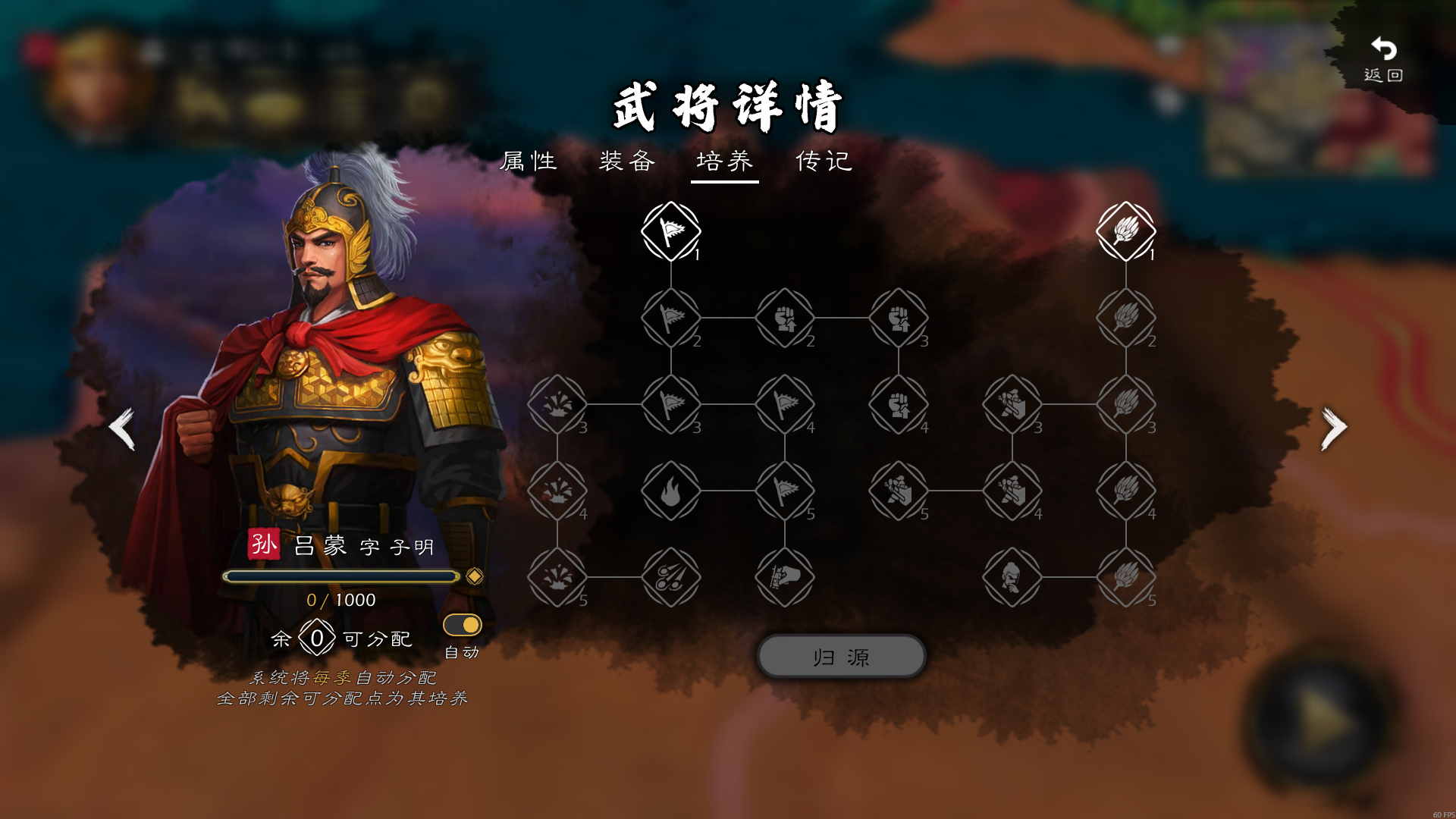 1.新特性-万法归宗(蓝):自身位于【张盛】、【张璇】周围两圈范围内时,造成的伤害大幅提高;主动发起攻击并击溃敌军部队时,有较高几率恢复1点技力值。