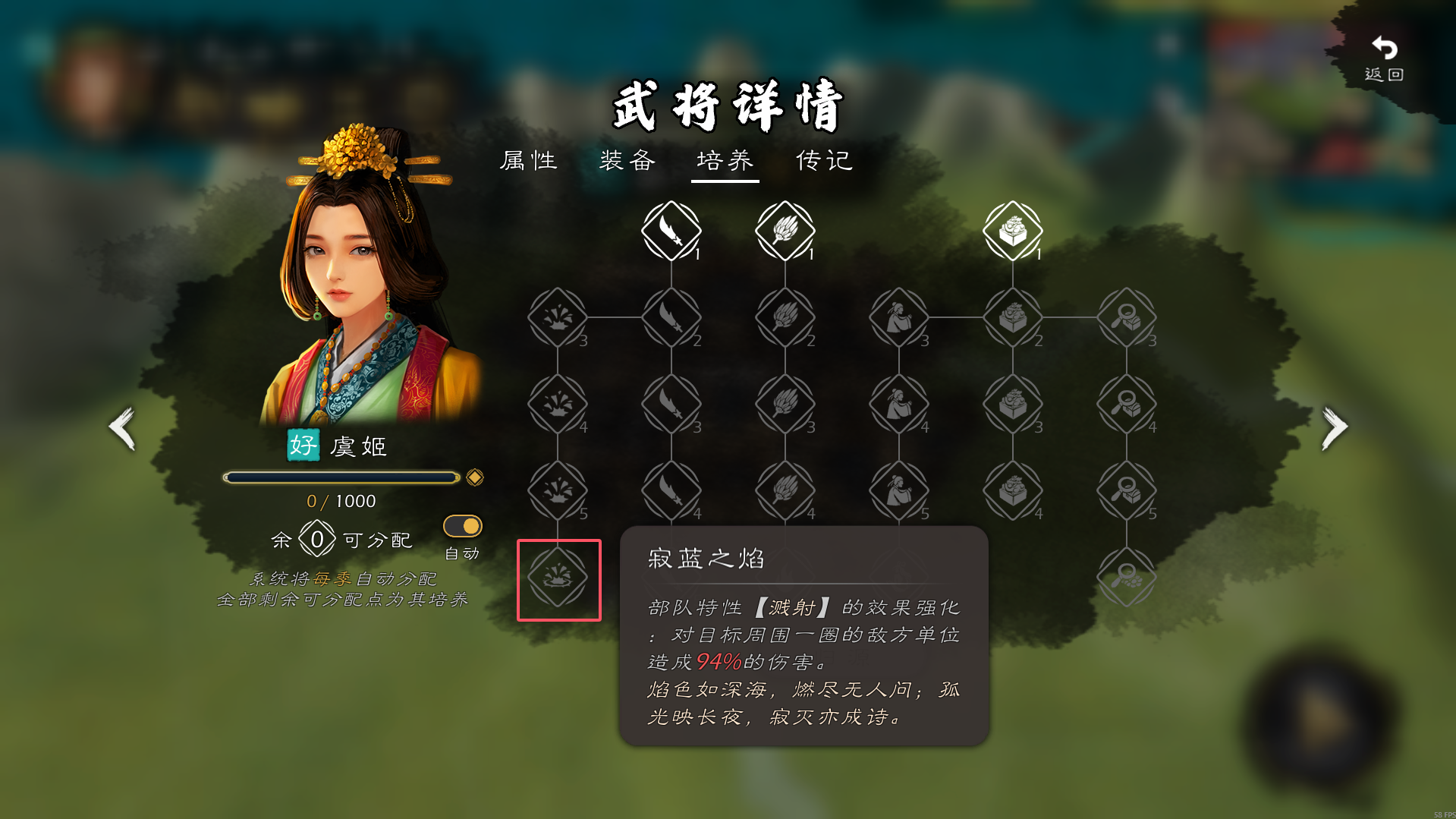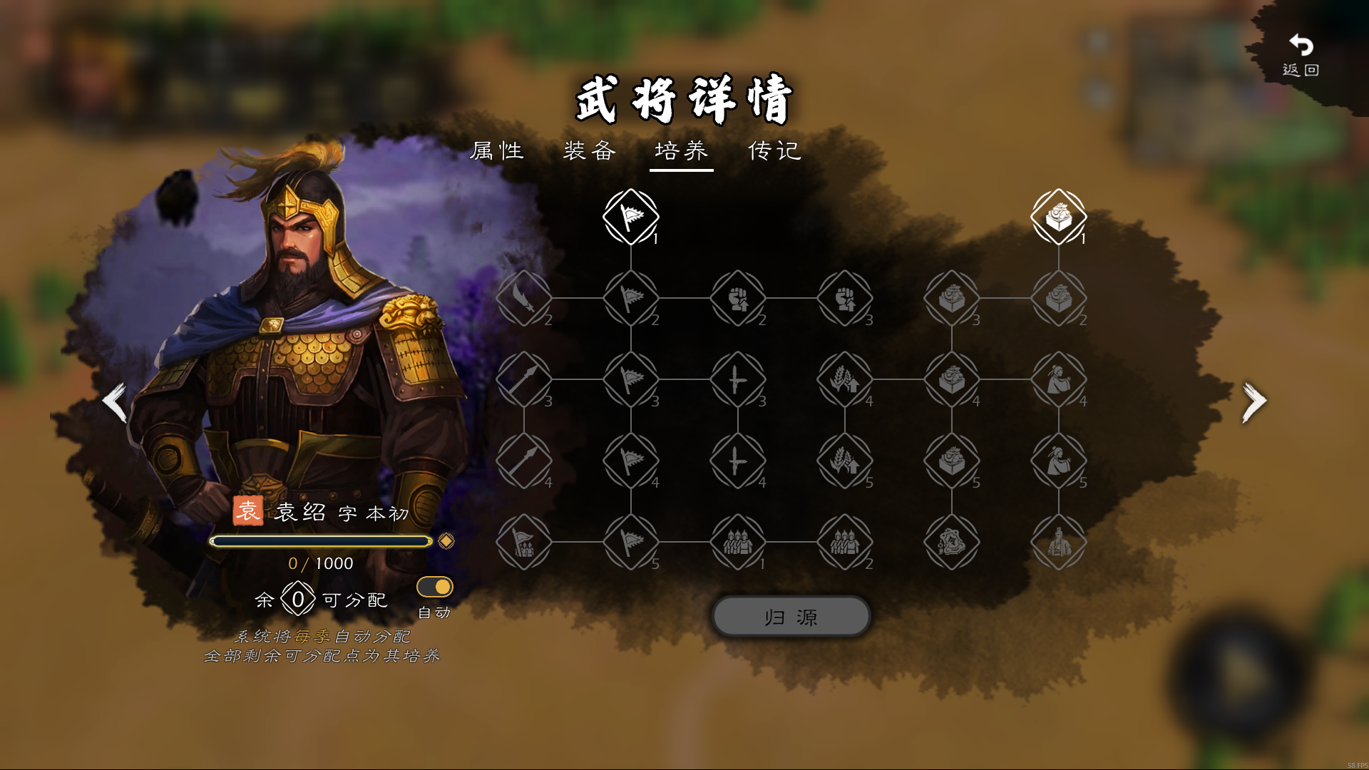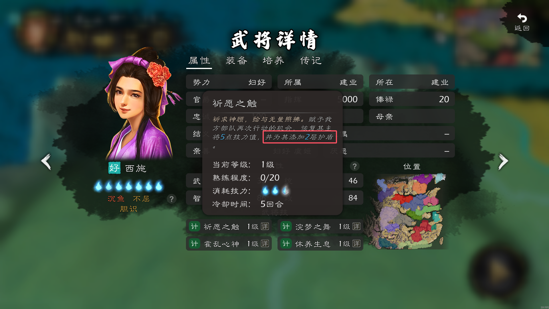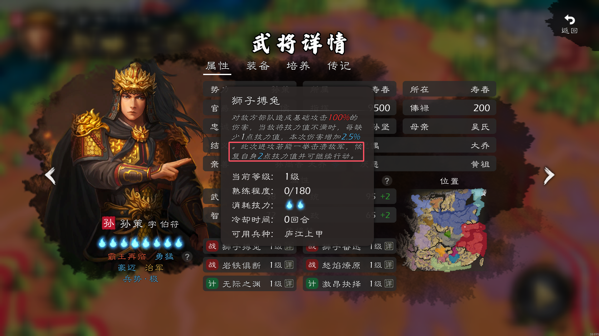 1.新特性-万法归宗(蓝):自身位于【张盛】、【张璇】周围两圈范围内时,造成的伤害大幅提高;主动发起攻击并击溃敌军部队时,有较高几率恢复1点技力值。