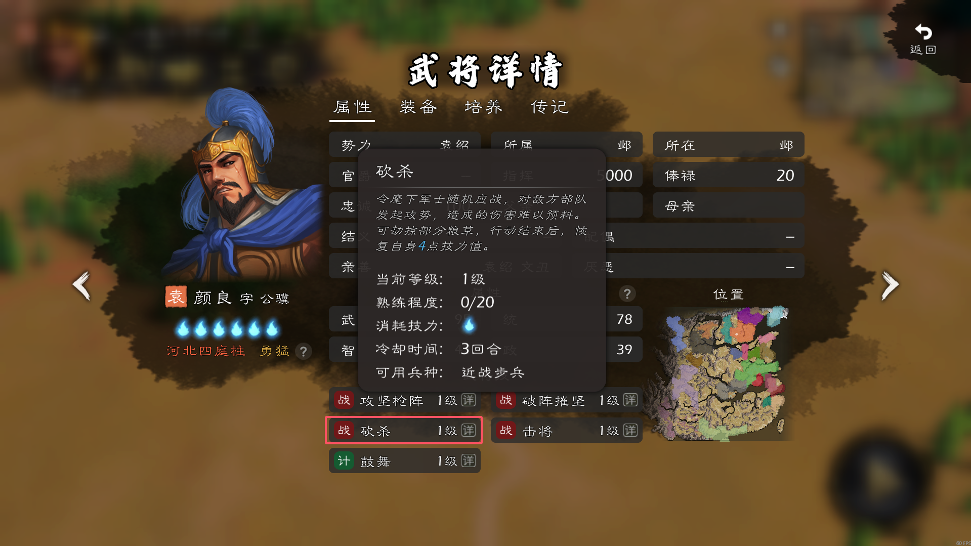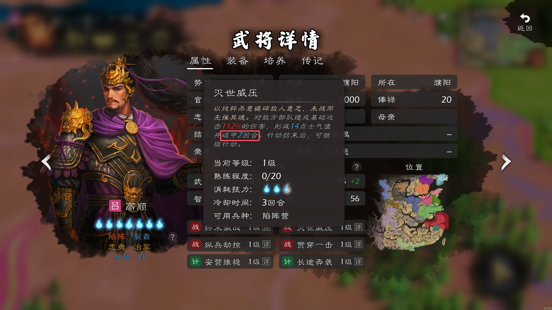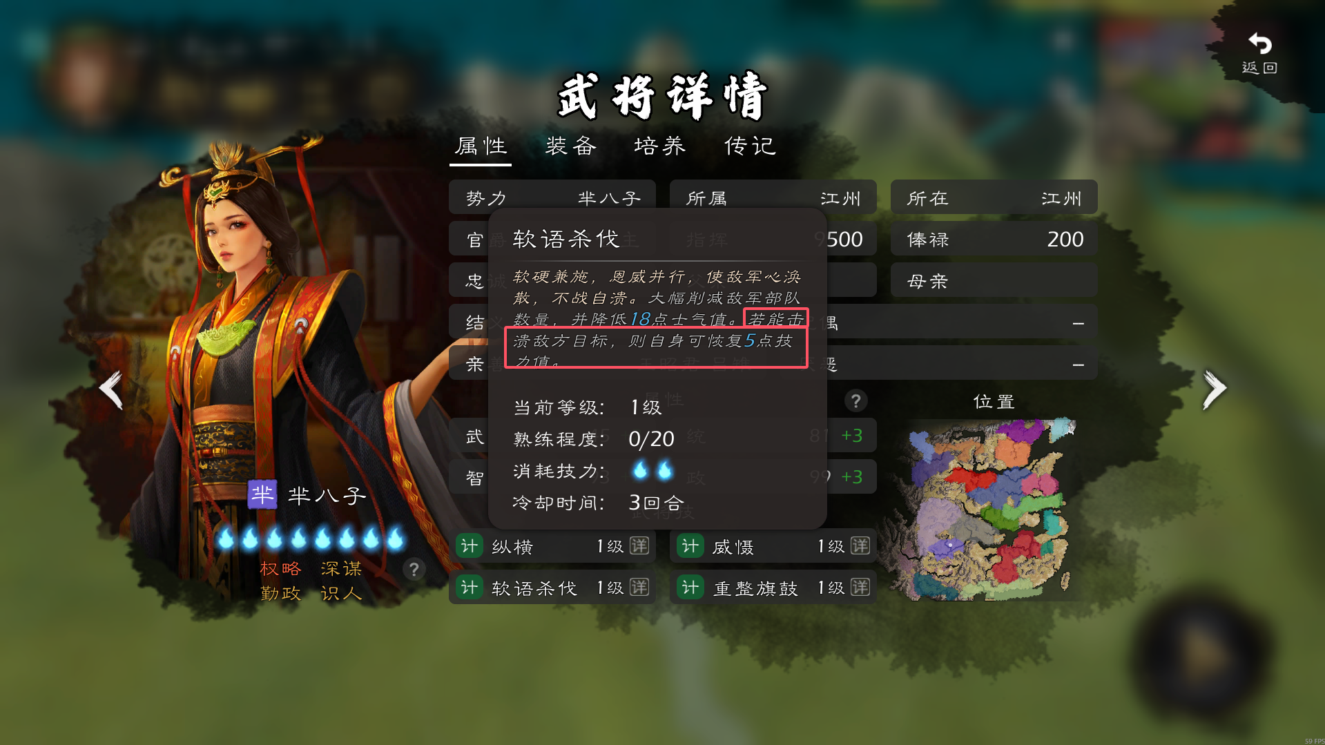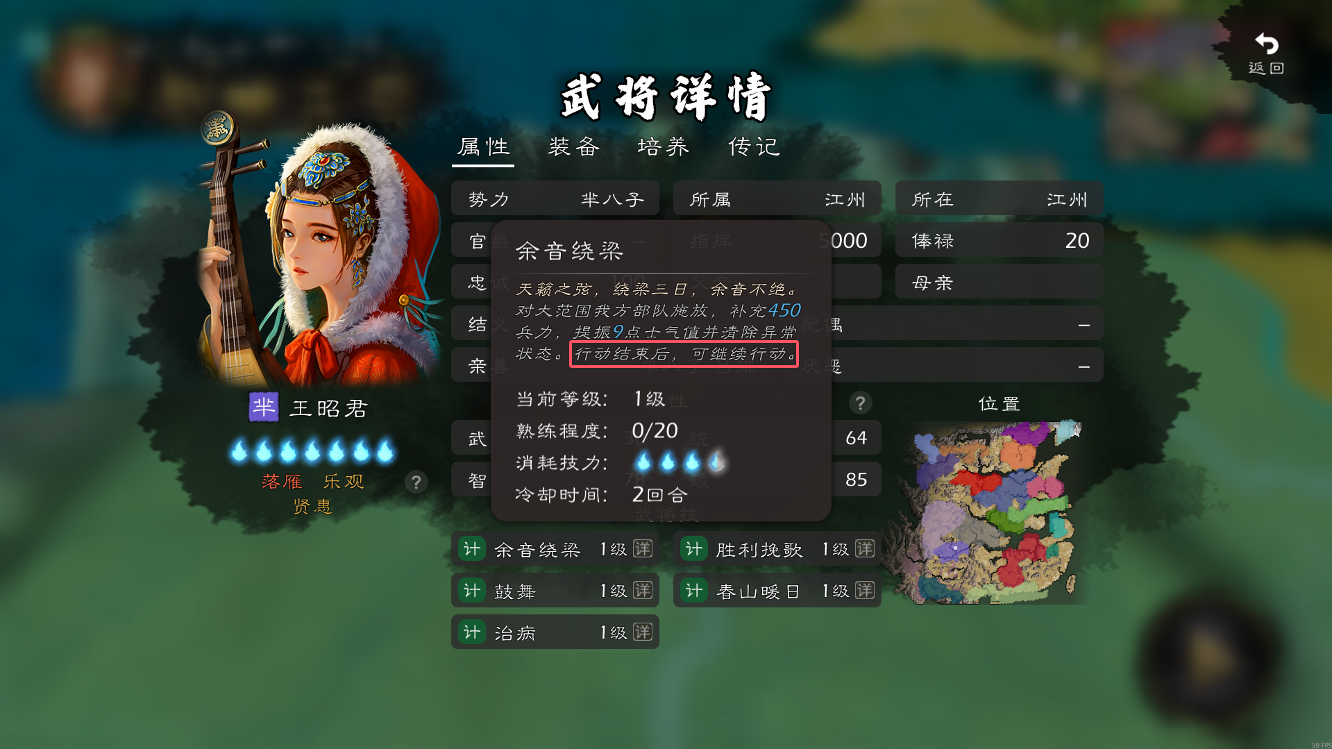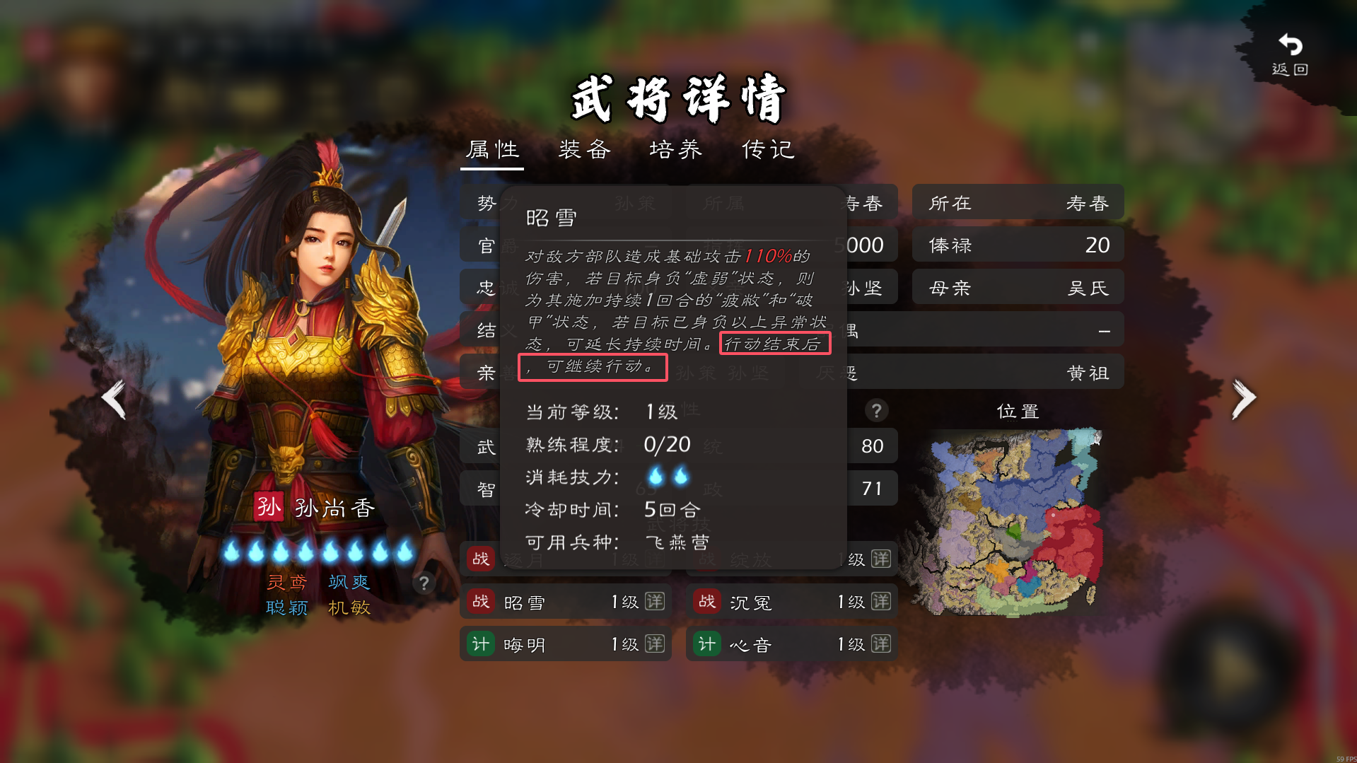 1.新特性-万法归宗(蓝):自身位于【张盛】、【张璇】周围两圈范围内时,造成的伤害大幅提高;主动发起攻击并击溃敌军部队时,有较高几率恢复1点技力值。