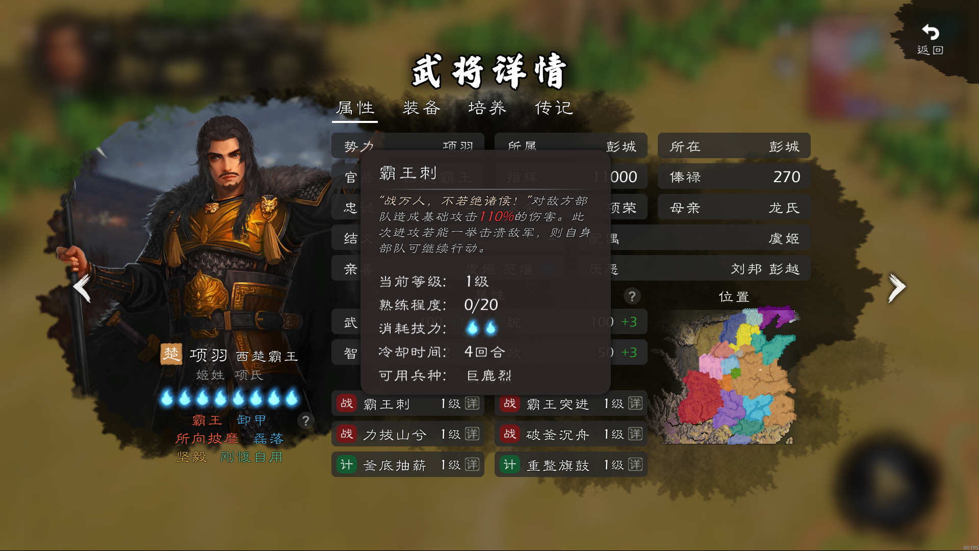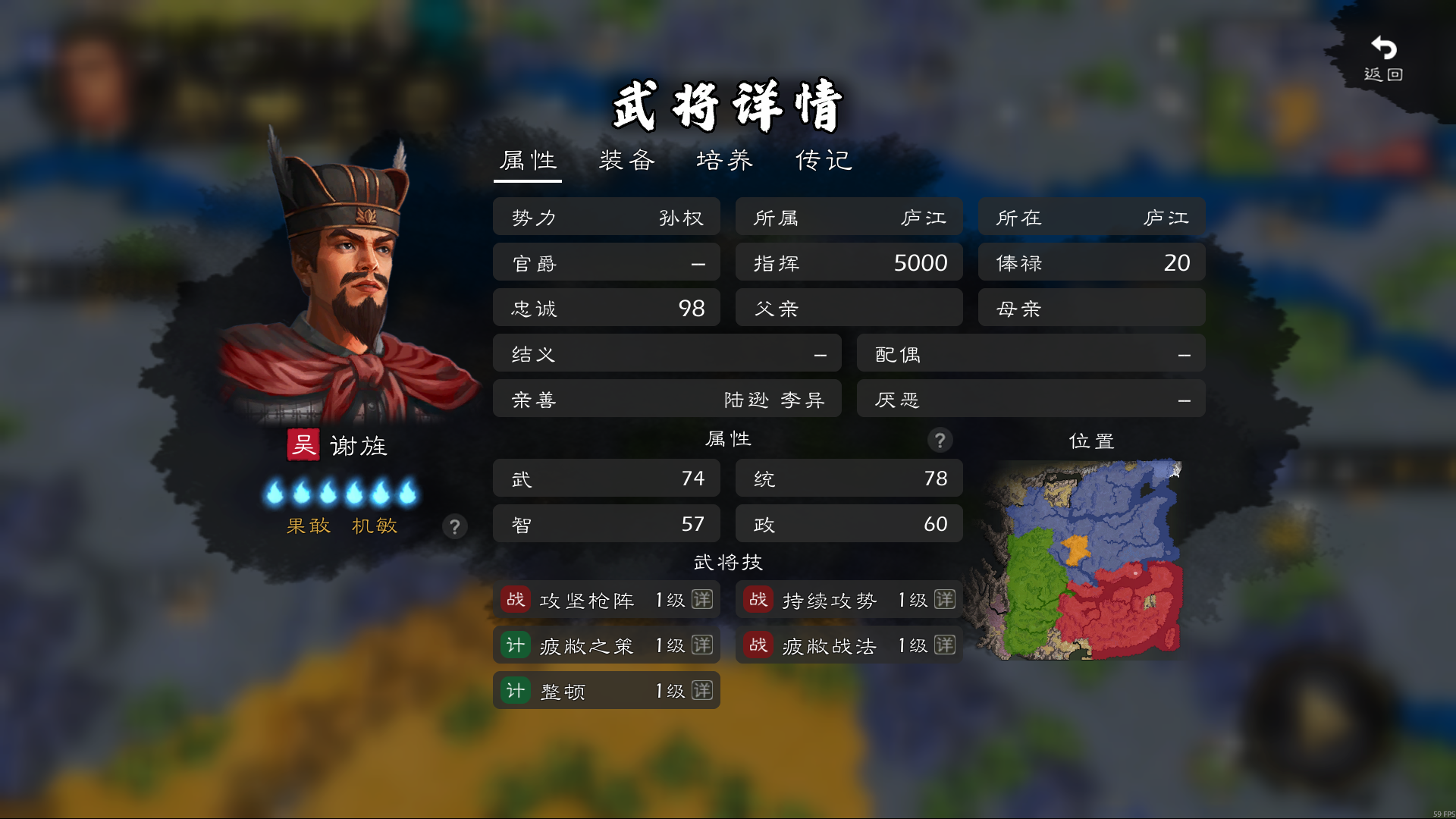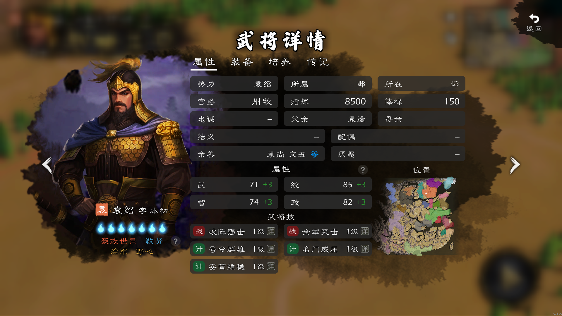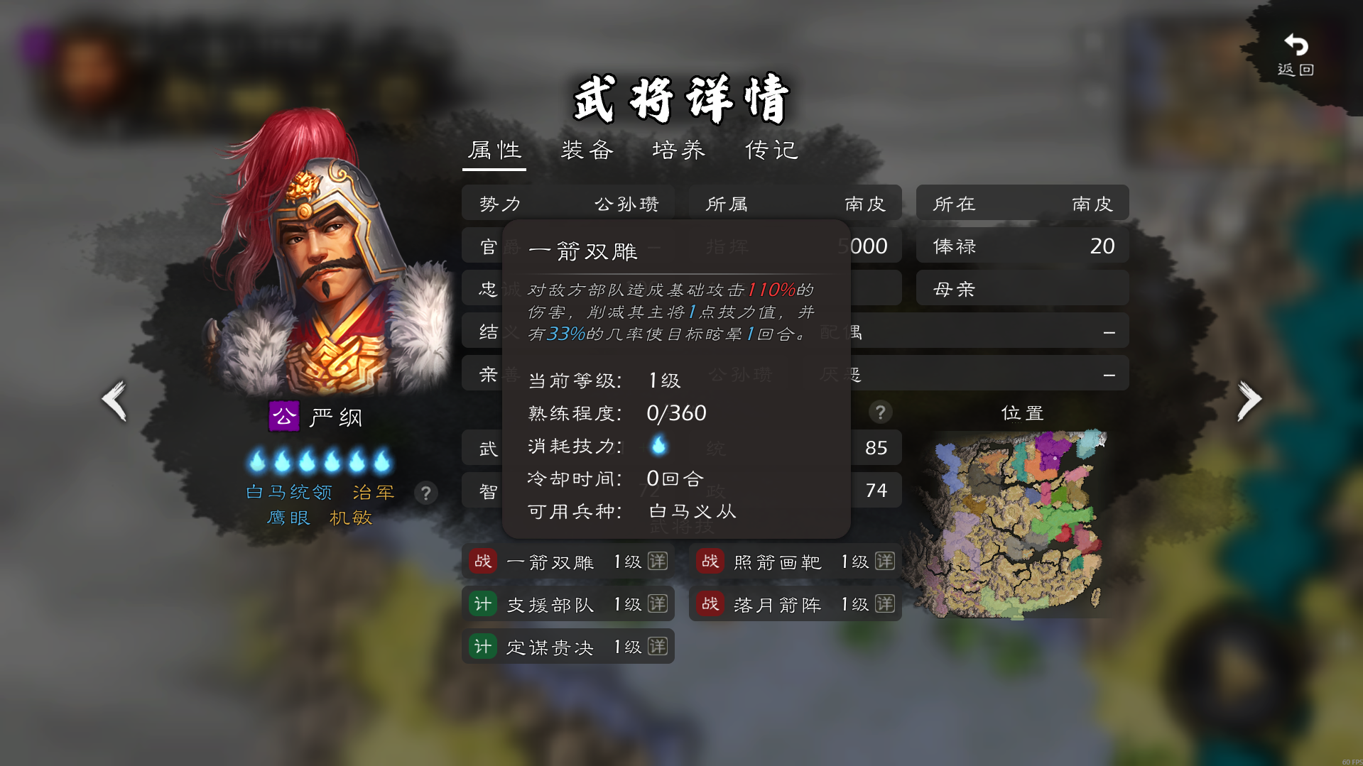 1.新特性-万法归宗(蓝):自身位于【张盛】、【张璇】周围两圈范围内时,造成的伤害大幅提高;主动发起攻击并击溃敌军部队时,有较高几率恢复1点技力值。