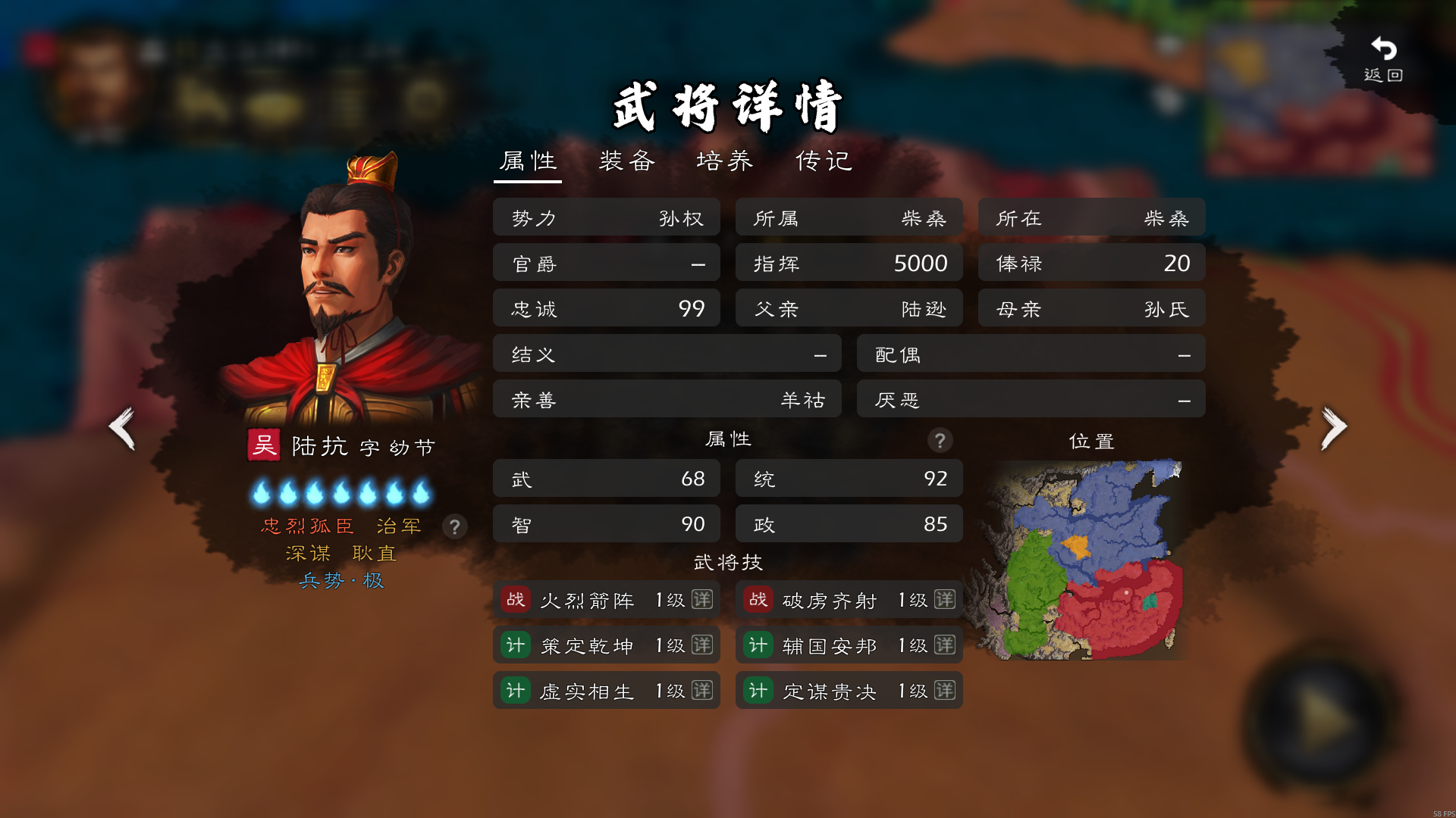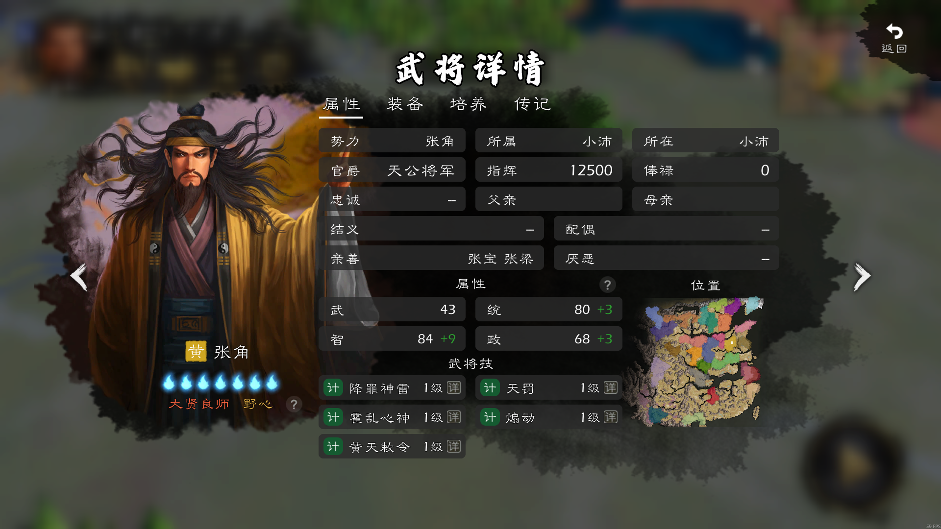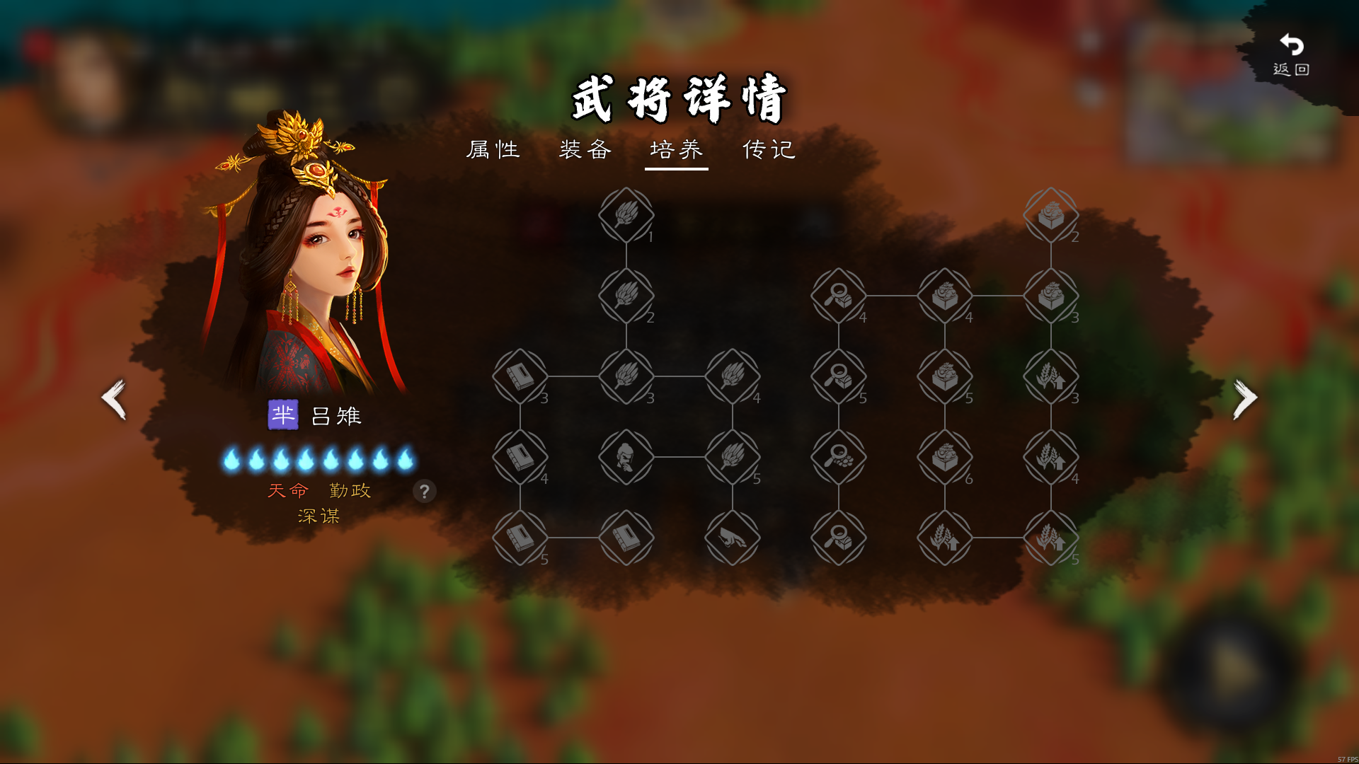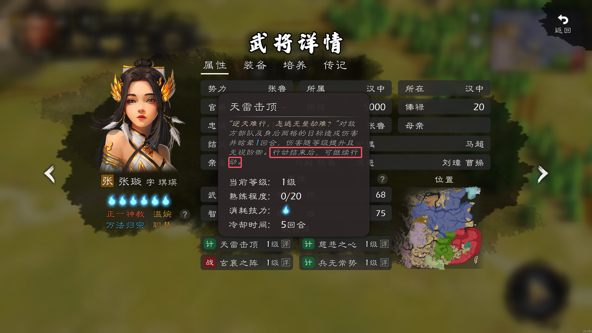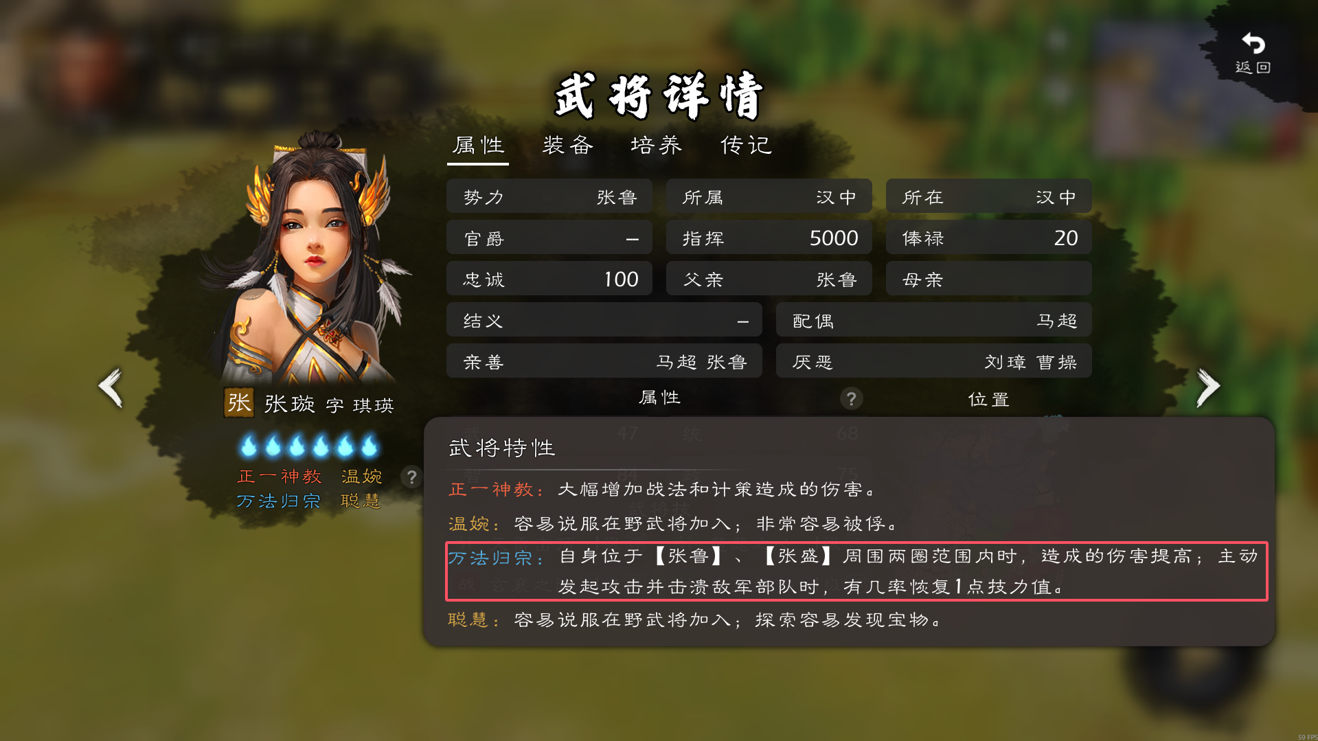 1.新特性-万法归宗(蓝):自身位于【张鲁】、【张璇】周围两圈范围内时,造成的伤害提高;主动发起攻击并击溃敌军部队时,有几率恢复1点技力值。