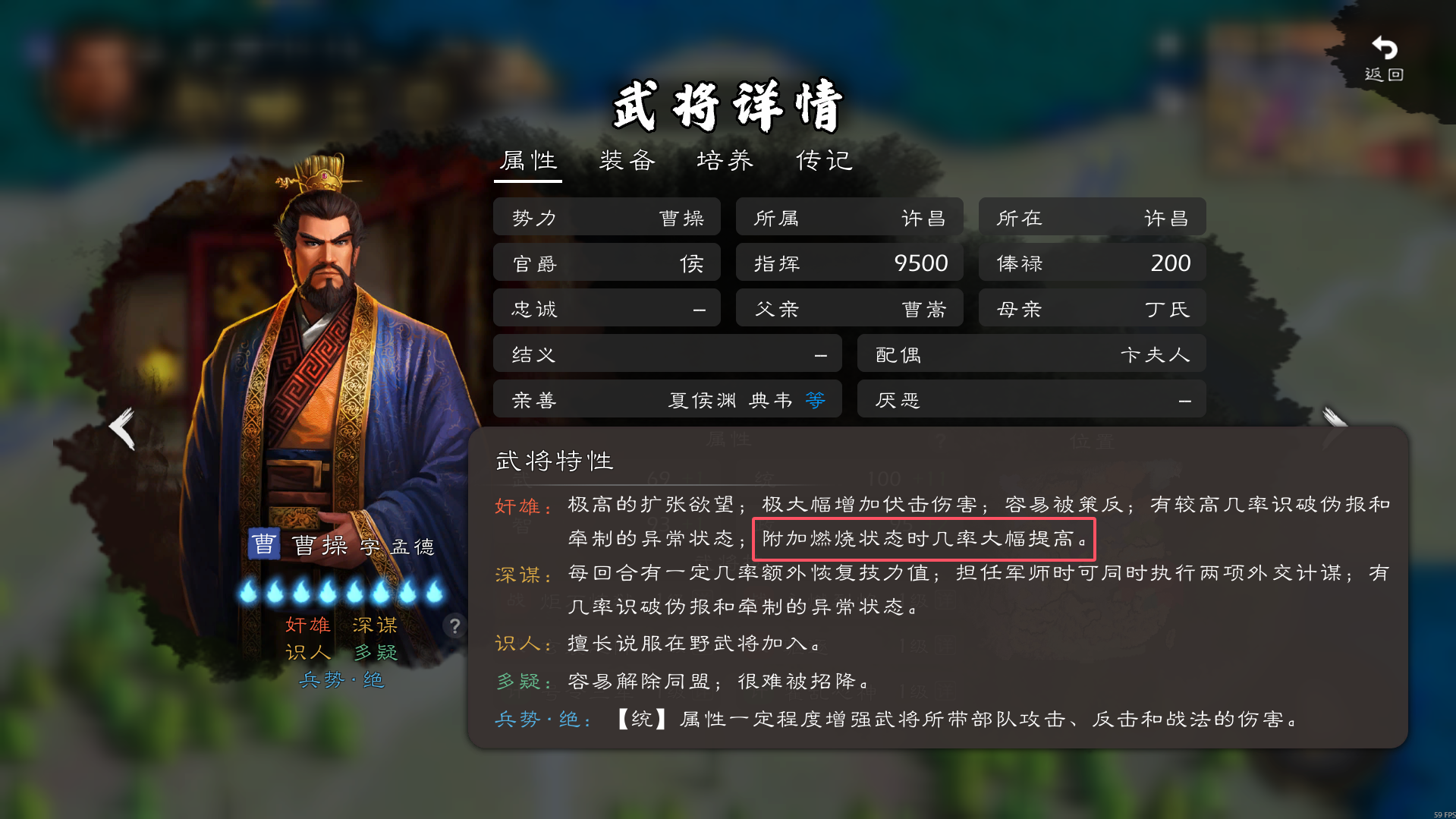 特性【奸雄】增加提高技能燃烧几率的效果;