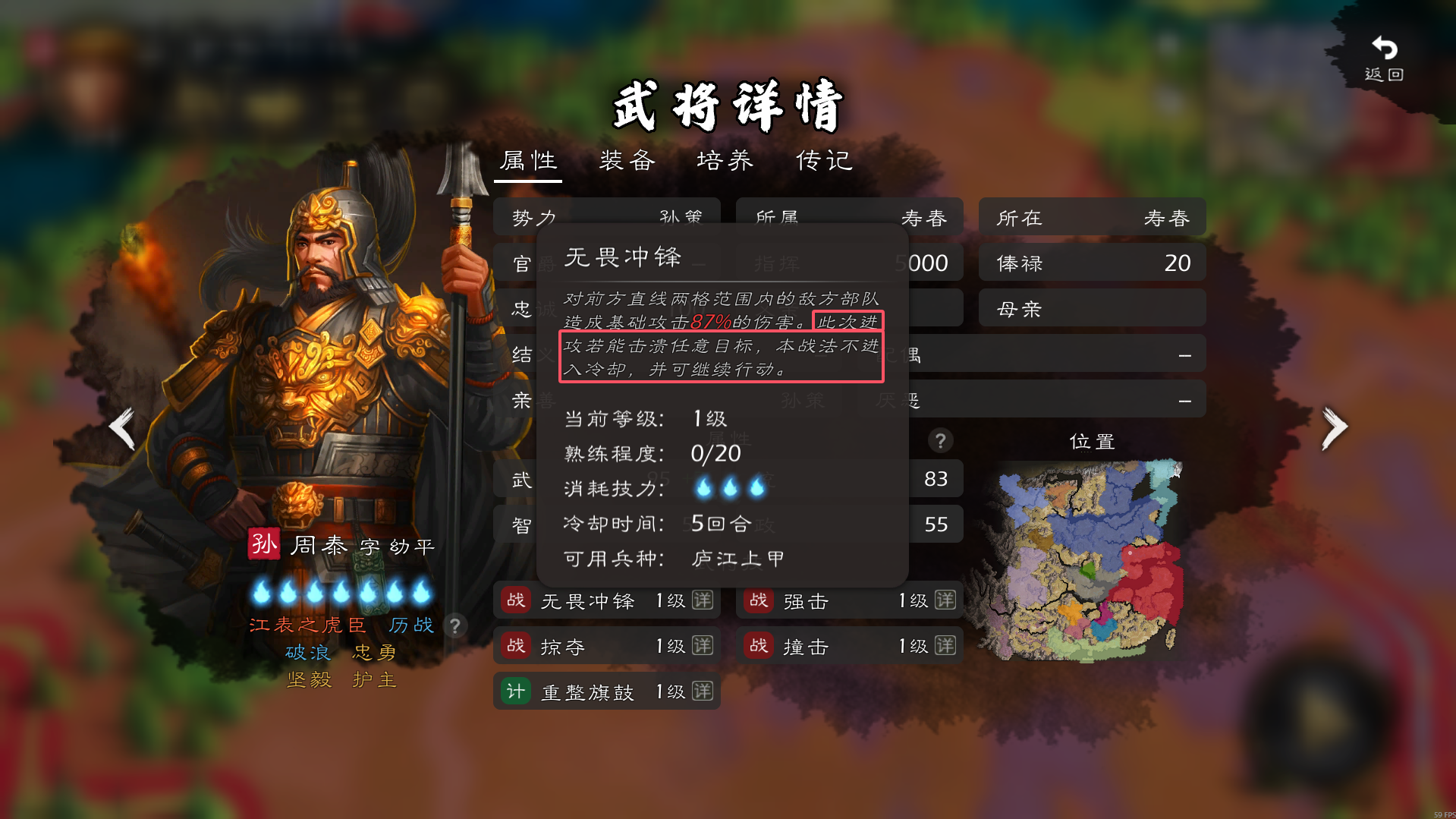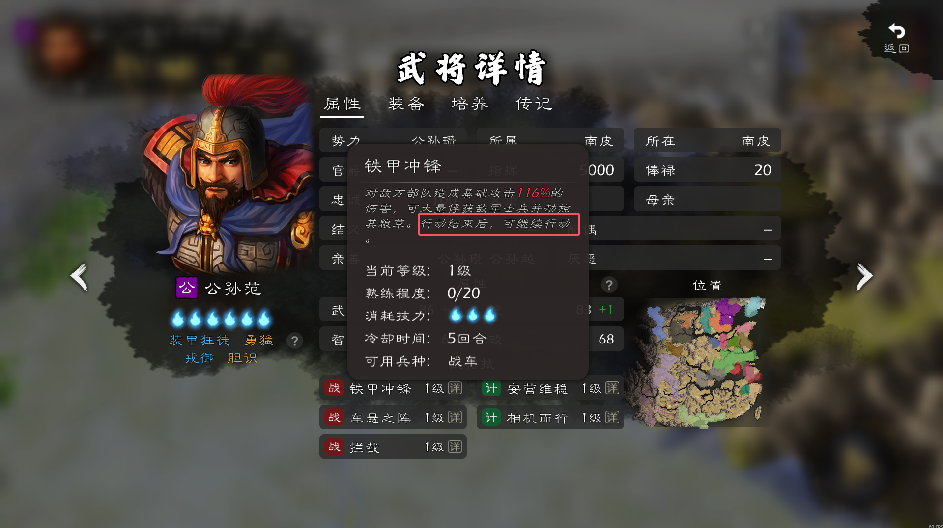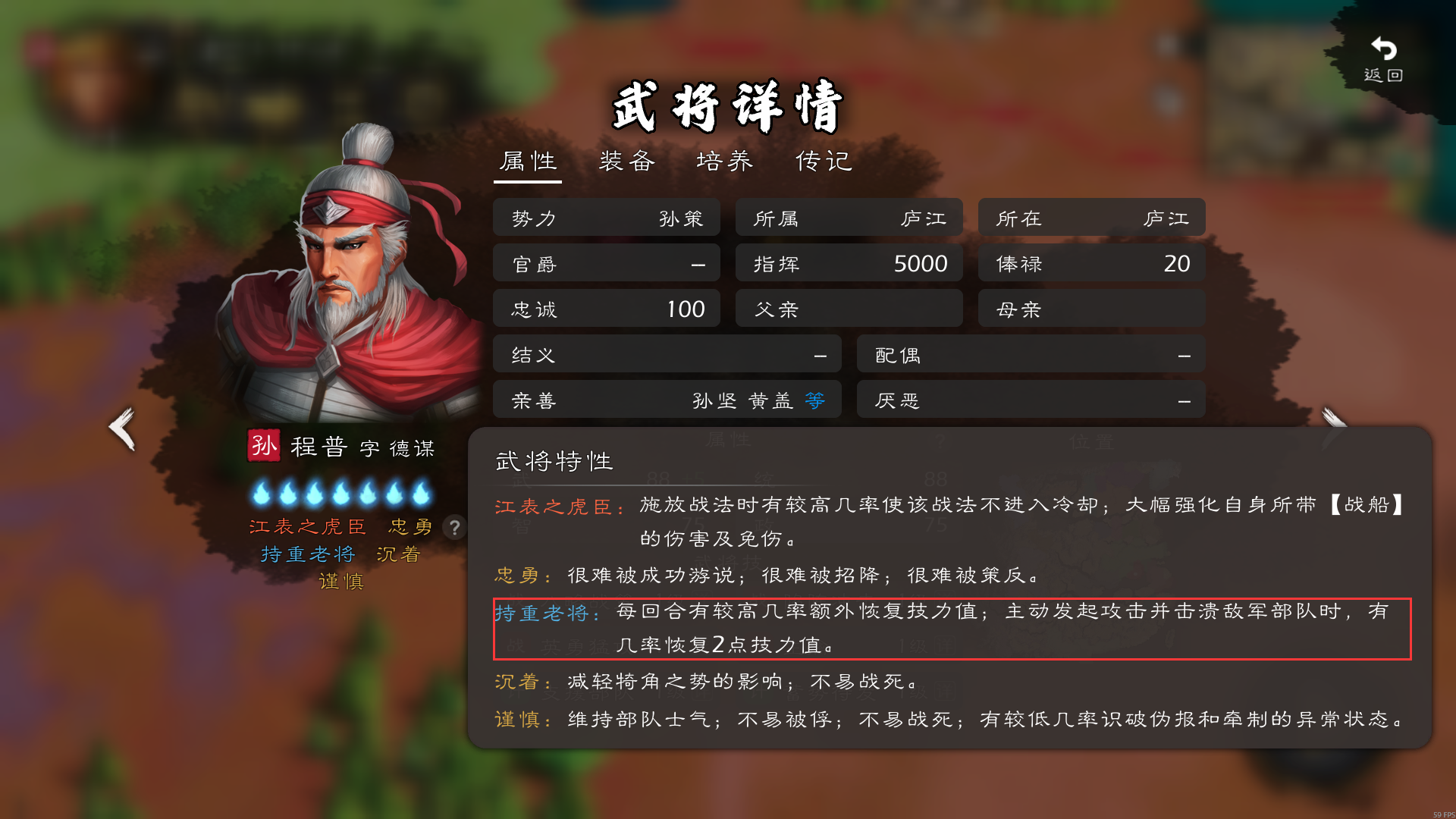增加新特性【持重老将】:每回合有较高几率额外恢复技力值;主动发起攻击并击溃敌军部队时,有几率恢复2点技力值。