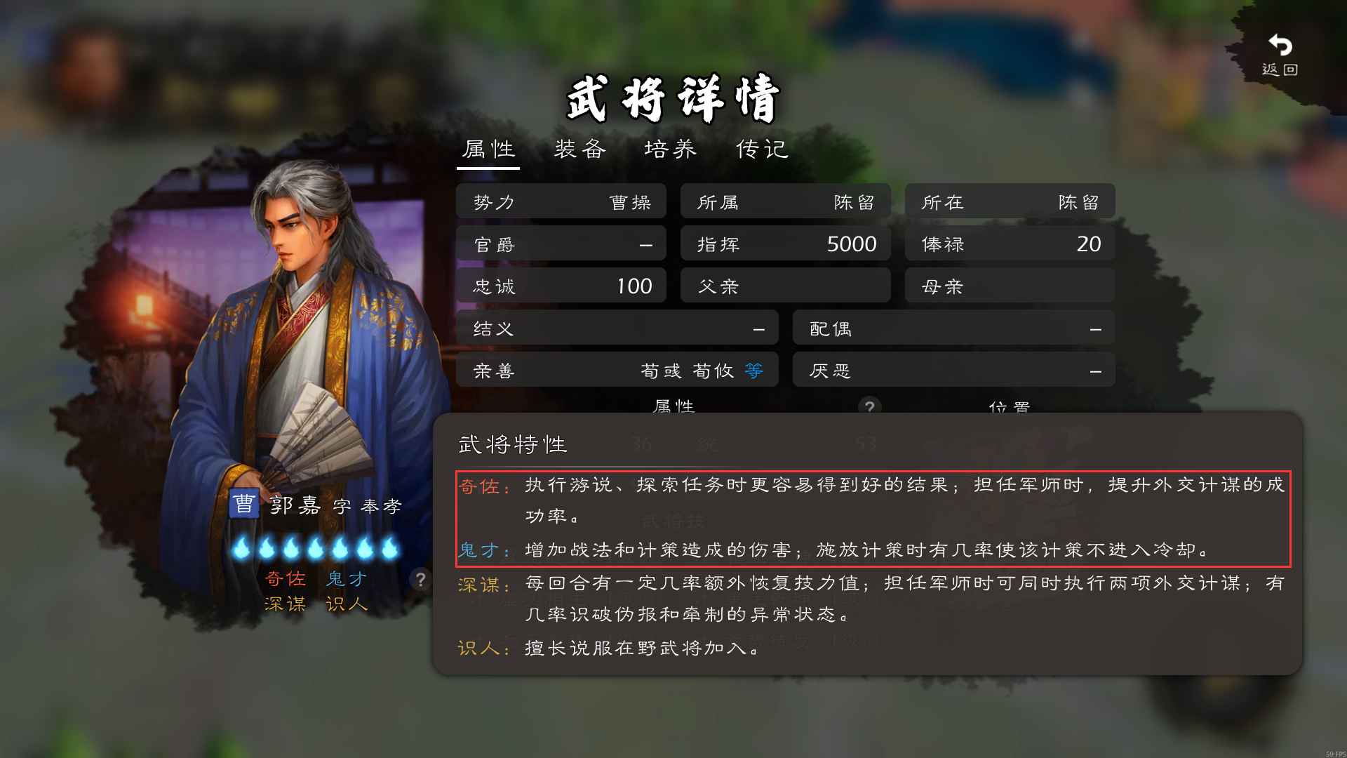 增加新特性【奇佐】(红):执行游说、探索任务时更容易得到好的结果;担任军师时,提升外交计谋的成功率。