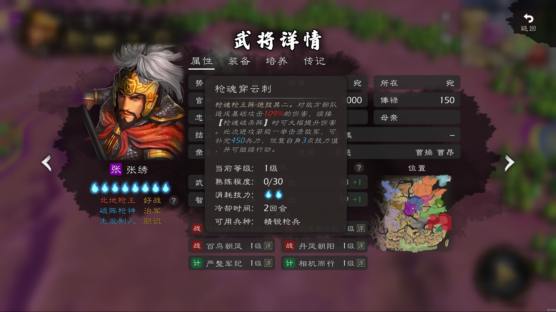 2.振奋冲击(战法)变更为->枪魂穿云刺(战法):对敌方部队造成基础攻击109%的伤害,续接【枪魂破杀阵】时可大幅提升伤害。此次进攻若能一举击溃敌军,可补充450兵力,恢复自身3点技力值,并可继续行动。