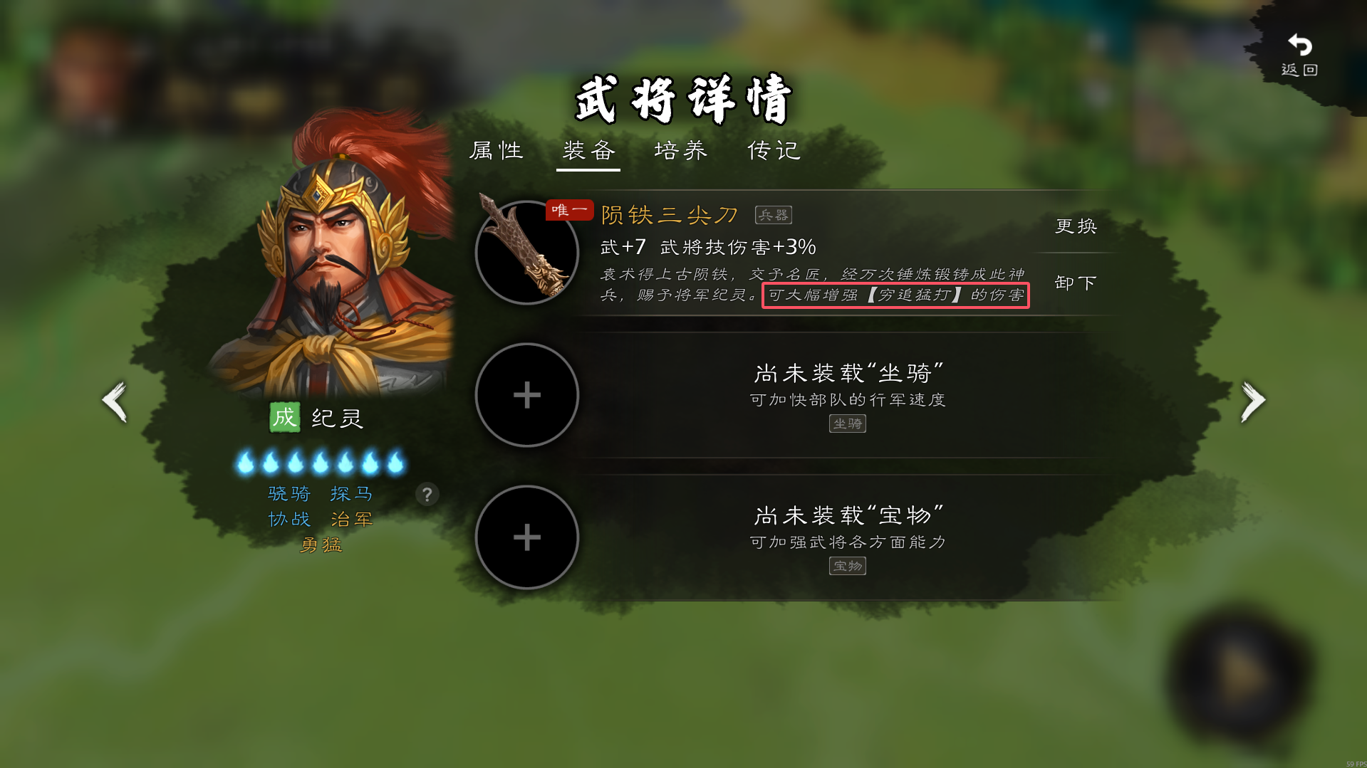 1.陨铁三尖刀:增加对战法【穷追猛打】的增伤效果。