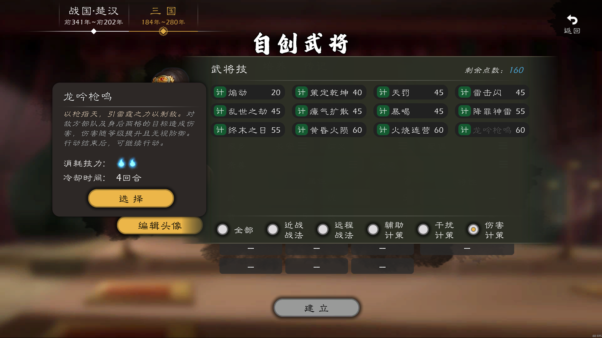 3.龙吟枪鸣(计策/三国可用):对敌方部队及身后两个的目标造成伤害,伤害随等级提升且无视防御。行动结束后,可继续行动。