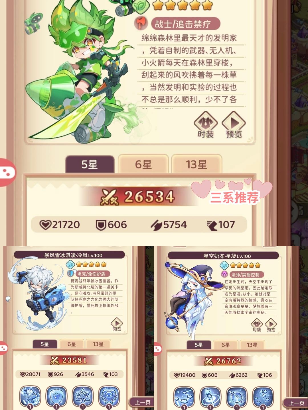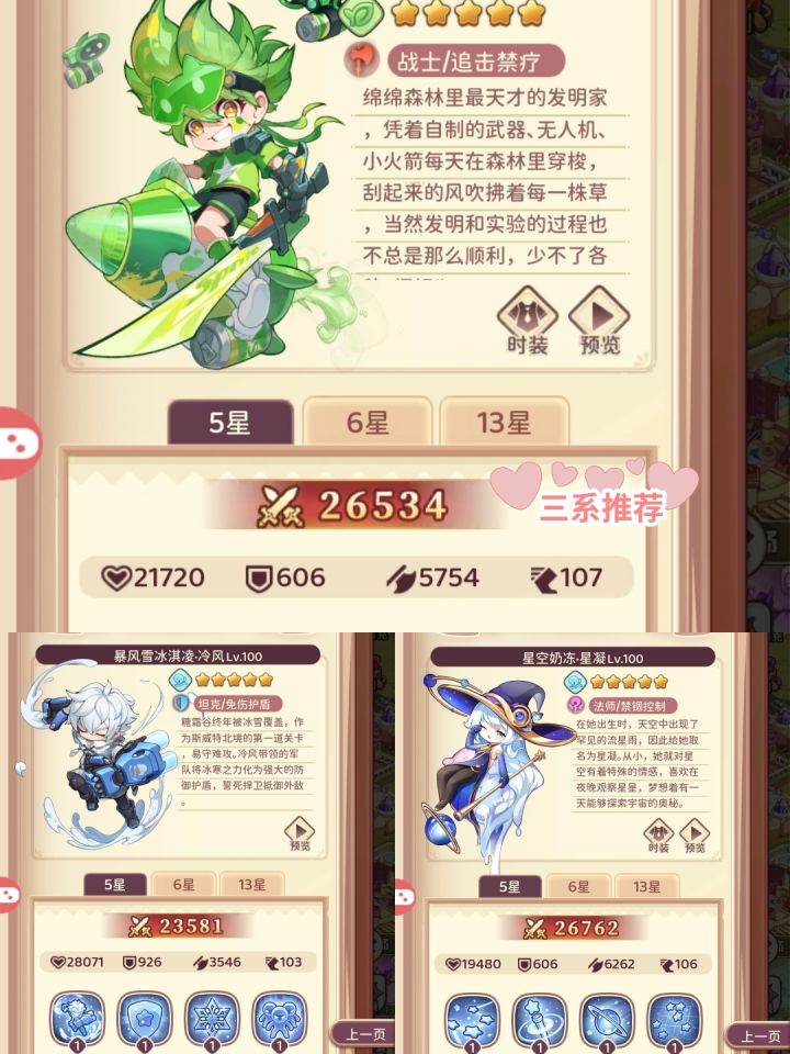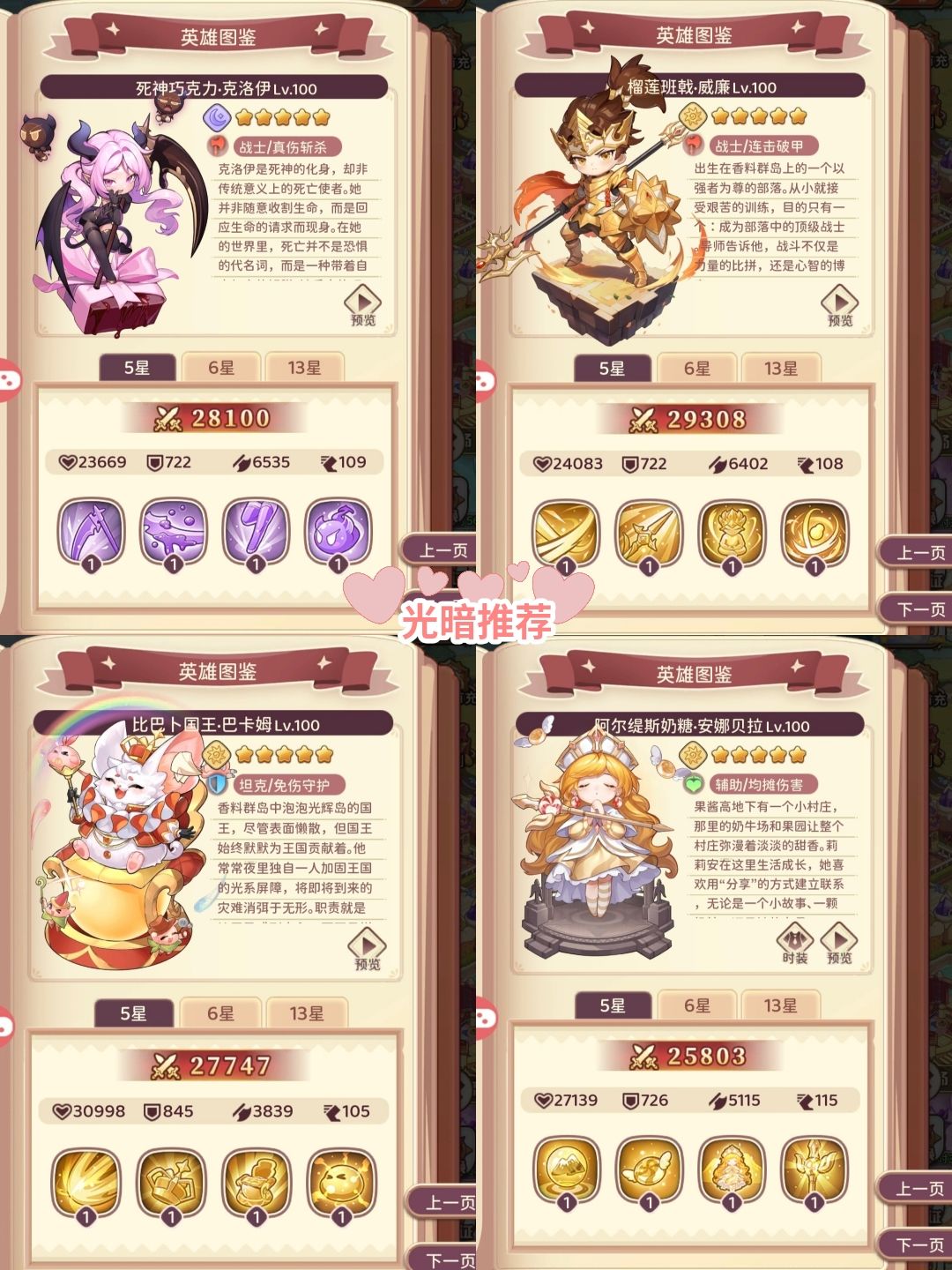 二、⭐传说英雄后续皆为狗粮 前期可以用来过渡,邮件领的传说宝箱建议选择糖葫芦升星过度。根据引导任务到心愿选择的时候,打架过关卡选择奶冻,打boss刷伤害选择雪碧,个人建议拿雪碧,前期用来打伤害刷榜,后面还可以用来打领主(周榜)比较保值。
