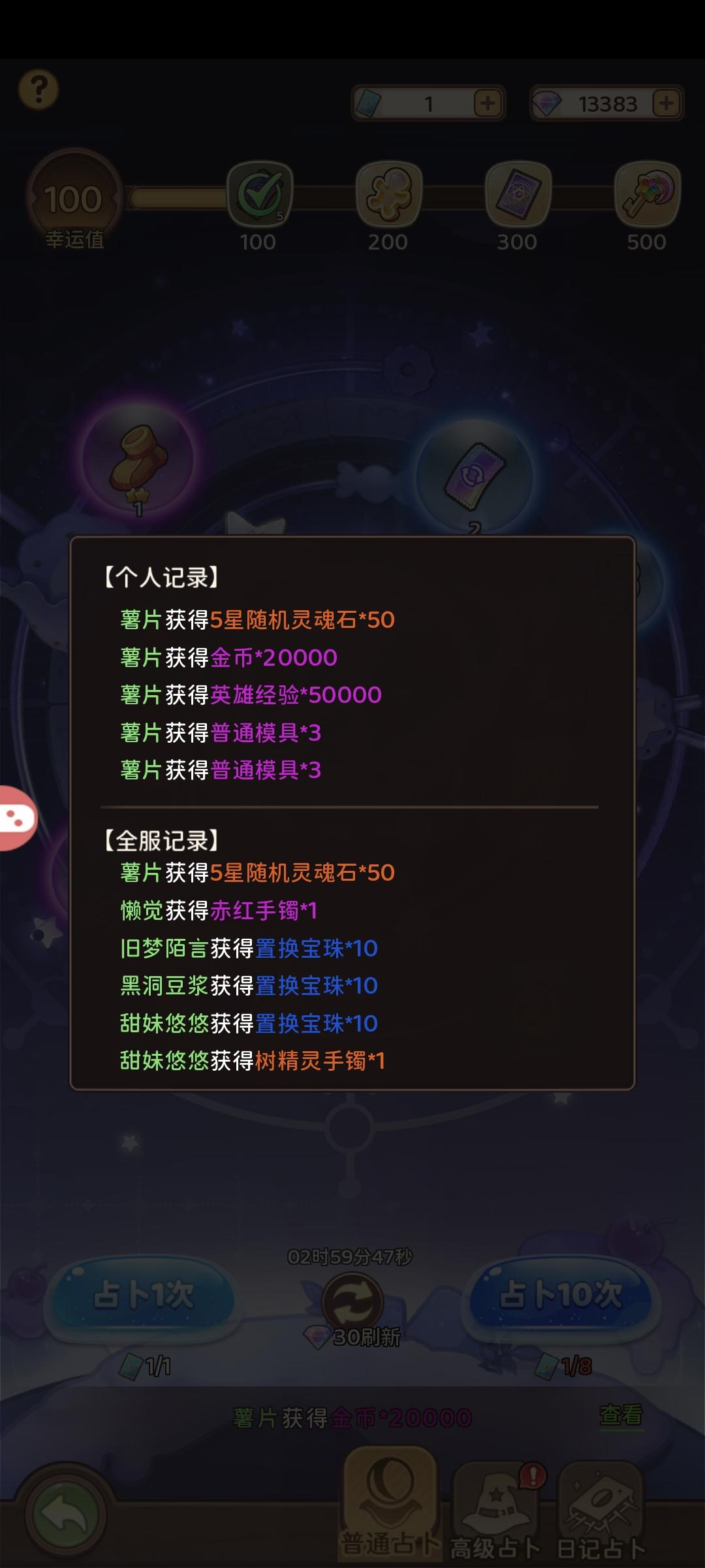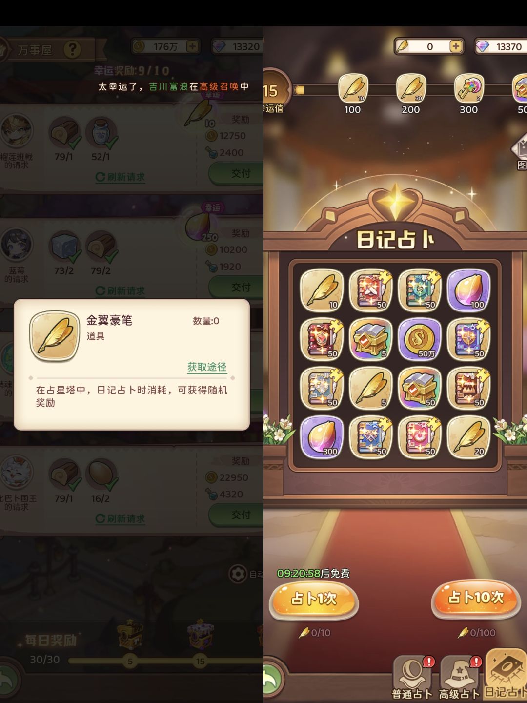 五、⭐万事屋是金币的主要获取来源,提交对应的物资即可获得金币和经验,前几天会有10次额外的幸运奖励,个人建议换羽毛,这个可以在占卜塔抽取日记有概率整本日记,解锁日记将获得大量战力提升。顺带一提普通占卜也可以刷出5星灵魂石,注意不要刻意用钻石去刷随缘就好。