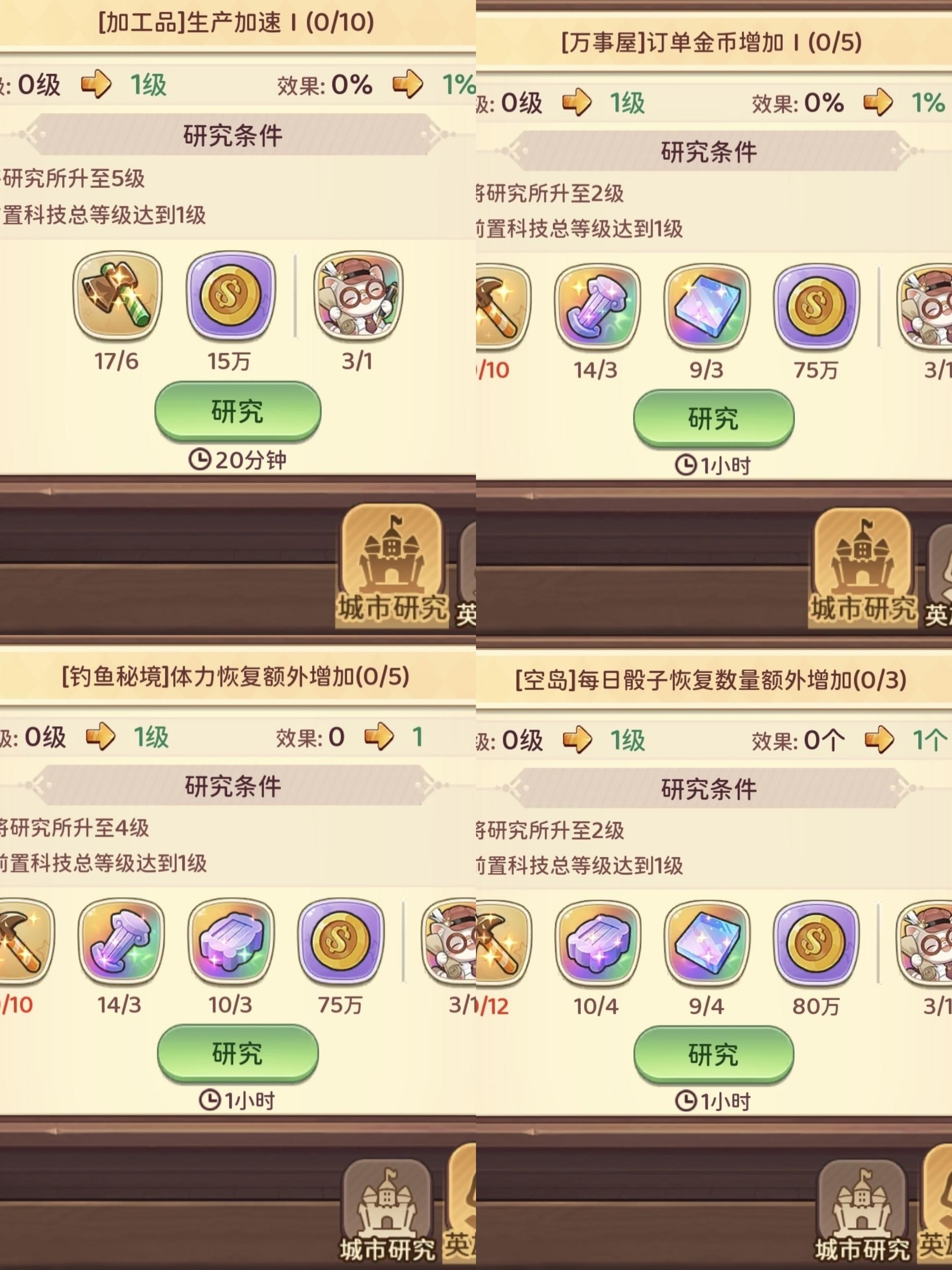 六、⭐根据引导任务解锁研究所后,⚠️不要随便升级研究,优先升级获得额外金币,增加骰子数量和加速生产这些,尤其是万事屋获得额外金币,这个一定一定最优先,不论是英雄升级还是狗粮获取都需要金币,后续几亿金币都不够,所以这个非常重要。