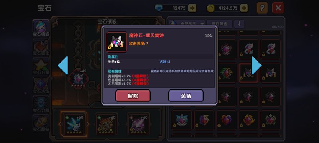 宝石系统非常重要,提供了大量的攻击强度,元素穿透,属性攻,爆伤这些基础属性之外,还有压制(水/火/木系压制),克制增幅,伤害增幅这些稀有属性,他的共鸣与聚合机制也是让很多萌新难以理解。