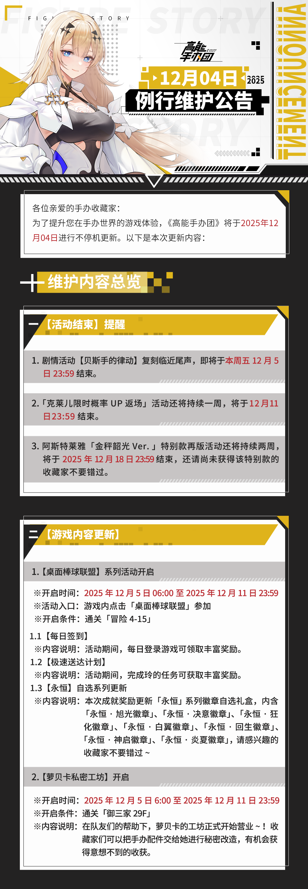 各位亲爱的手办收藏家:为了提升您在手办世界中的游戏体验,《高能手办团》将于2025年12月4日进行例行维护。详细公告内容请点击下方图片查看: