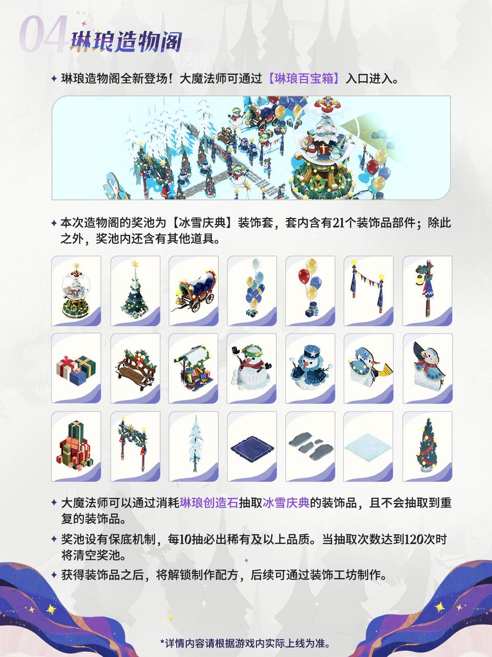 本次造物阁的奖池为【冰雪庆典】装饰套,套内含有22个装饰品部件;除此之外,奖池内还含有其他道具。喜欢【冰雪庆典】装饰套的大魔法师不要错过哦!