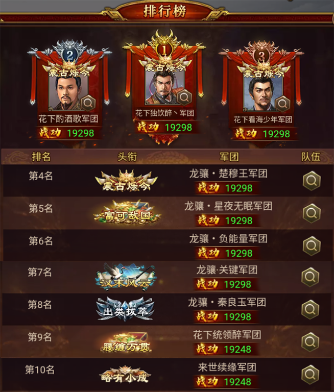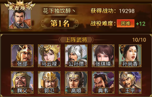 在本次战役中,花下独饮醉丶 军团以 19298 的战功摘得桂冠,攻克困难+12,拔得头筹,恭喜!