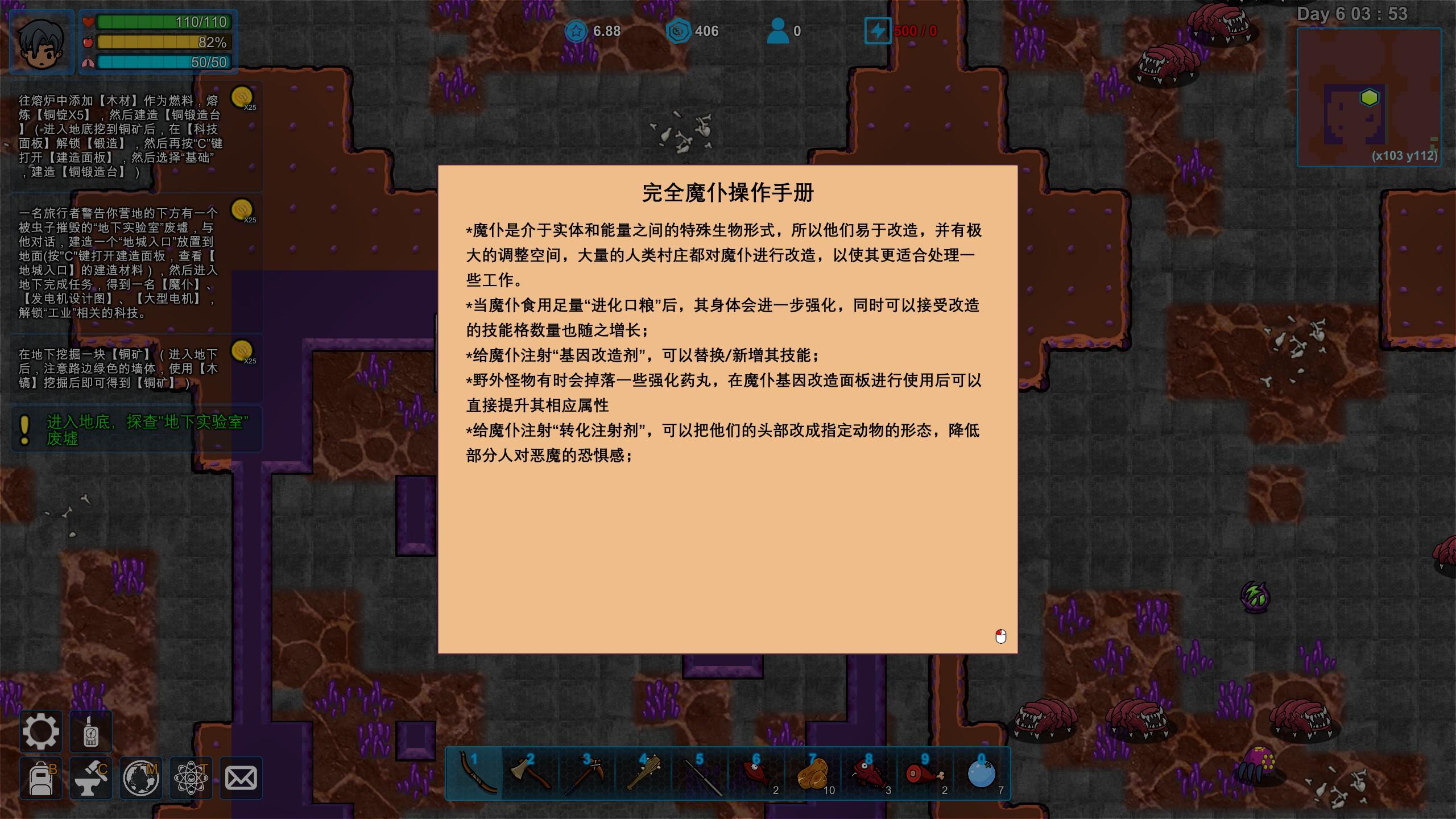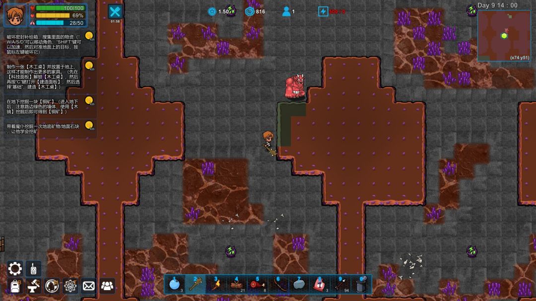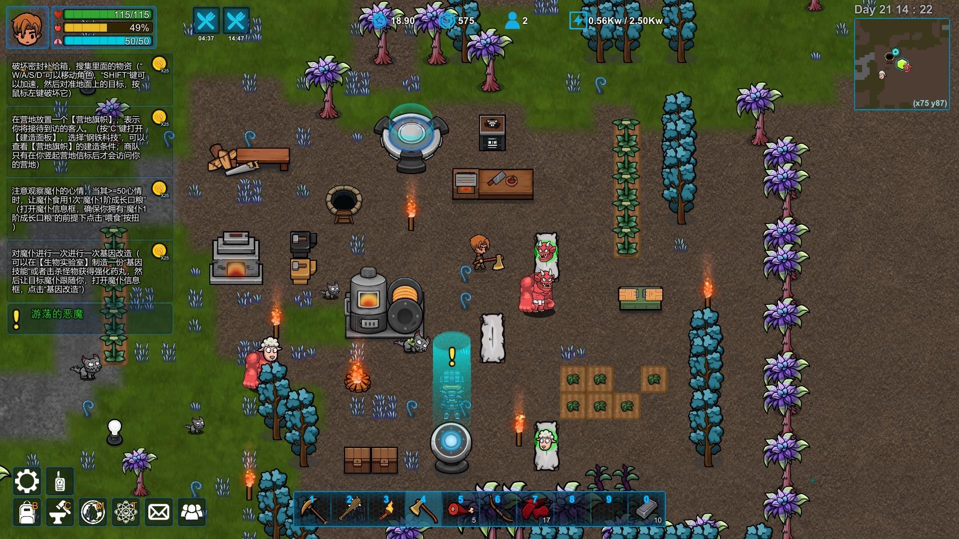 在地下城溜达到有机器的实验室,就可以契约那个旁边站着的红色大块头,然后能让它打架或干活都可以了。反正在成功契约了魔仆之后,我们就可以开始自由探索这个随机生成的异星球了,时不时再下去地下城冒险战斗,解锁众多有各种特效的装备,当然也少不了建基地招募更多的魔仆来干活,然后修建各种防御来抵御时不时过来破坏的外星虫潮。