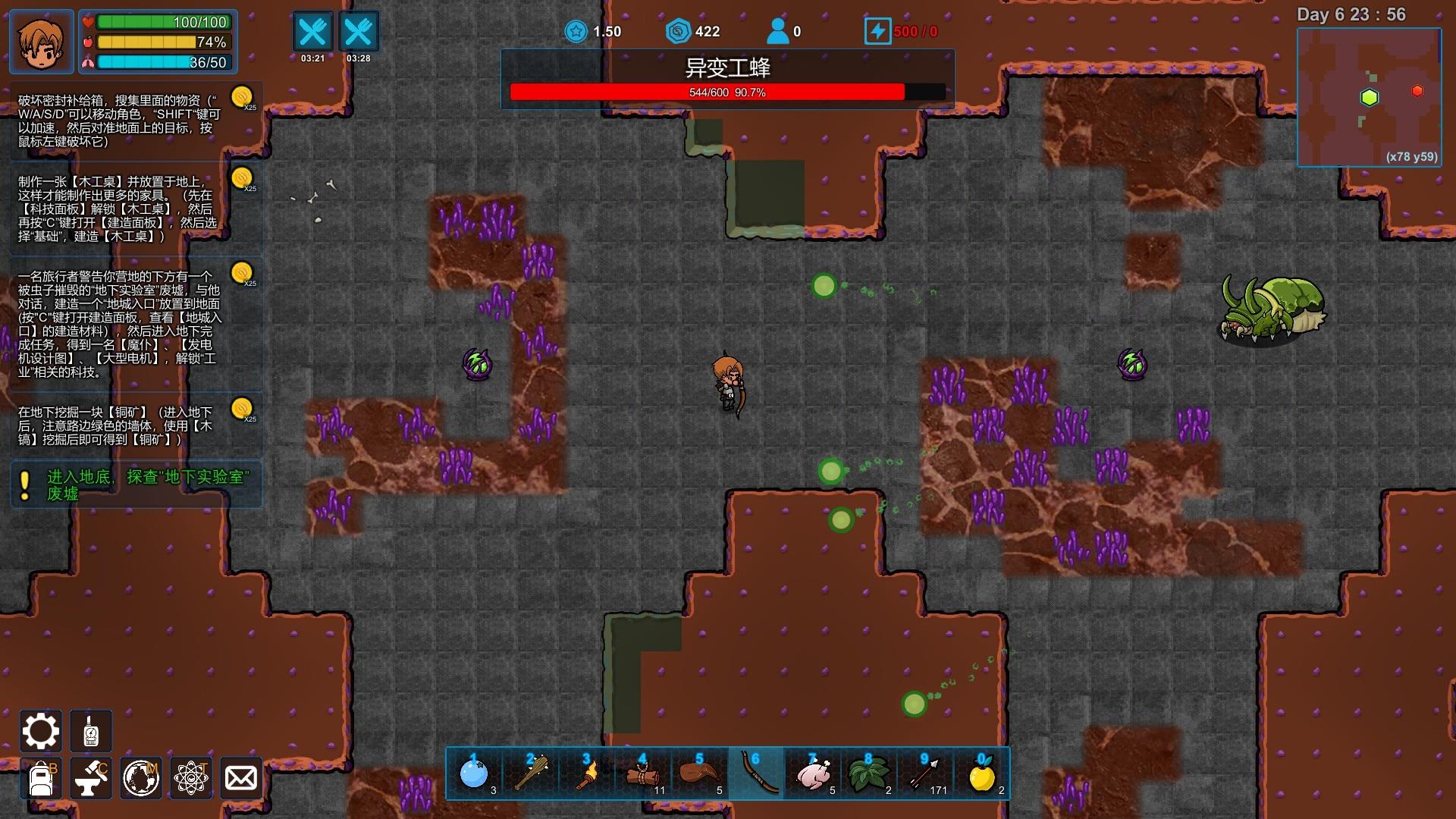 游戏虽然有不错的新手任务指引,但相信许多小伙伴是懒得去看那么多文字的介绍的,毕竟哪个小伙伴不是身经百战的“生存大师”呢!所以基本我们只需要熟悉一下操作,就一定会知道我们得先去把土豆找个地方种植下去,然后再拿起斧头和稿子开始伐木挖石,然后制作个木弓木棒用来教训那些时不时溜达到我们营地附近的外星怪兽,再顺便再搭个篝火用来烤这些怪兽掉落的肉用来充饥(其实食物主要的功能在这是补血),这一套行云流水的操作下来,基本上我们就算是在这异星球立足了!