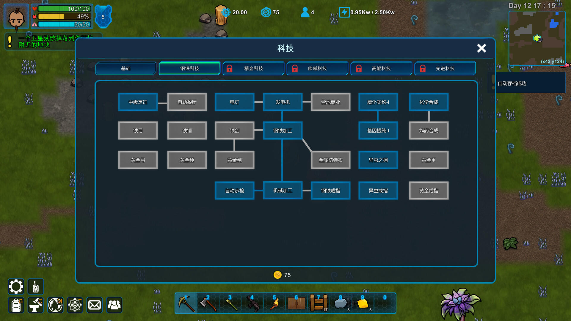 更何况游戏的科技树解锁只需要使用金币,而金币是我们杀怪必掉的,而且科技树也是按材料等级分门别类的相当清晰,只要钱到位,一切都不是问题!然后各种制作也是按材料分别的,木工桌做家具、熔炉烧矿、铜锻造台制作铜制品等等以此类推!