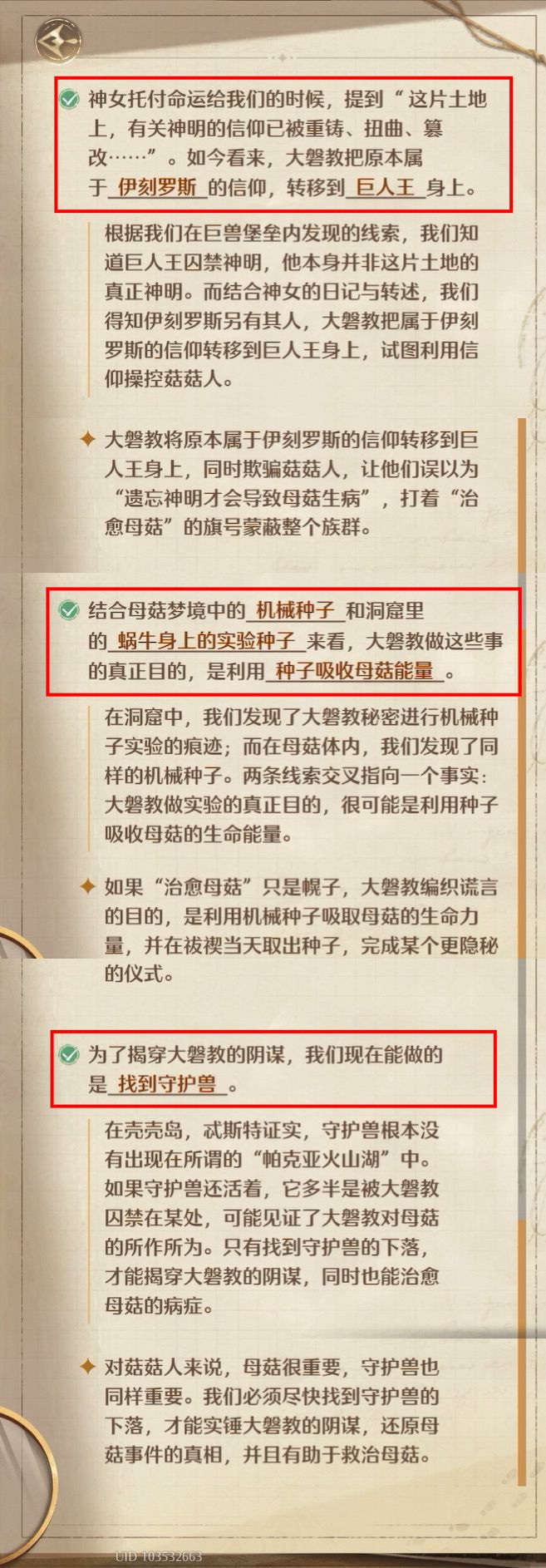 总结:大磐教欺骗了菇菇人,在母菇体内种下机械种子,并在祓禊当天取出种子,完成某个更隐秘的仪式。需要找到守护兽的下落,实锤大磐教的阴谋,并治愈母菇。