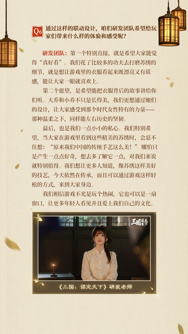 苏绣传心,谋定风华!我们相信,优秀的传承绝不只是存在于博物馆的展柜,它会活在每一个被重新讲述的故事里,也会在年轻一代的热爱里绽放新的光彩。 各位主公还希望在三谋看到哪些出乎意料的联动,欢迎在评论区畅所欲言,留下您的看法跟期望!