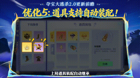 12.1 夺宝大逃杀2.0七大优化上线!新增保险箱,安全保护高价值道具!开放掠夺玩法,吞噬对手即可掠夺道具!道具支持自动装配、重复携带,搭配全新装备流派!兑换商店焕新,全新大金道具等你赢取!更刺激、更富有的夺宝之战!一触即发!