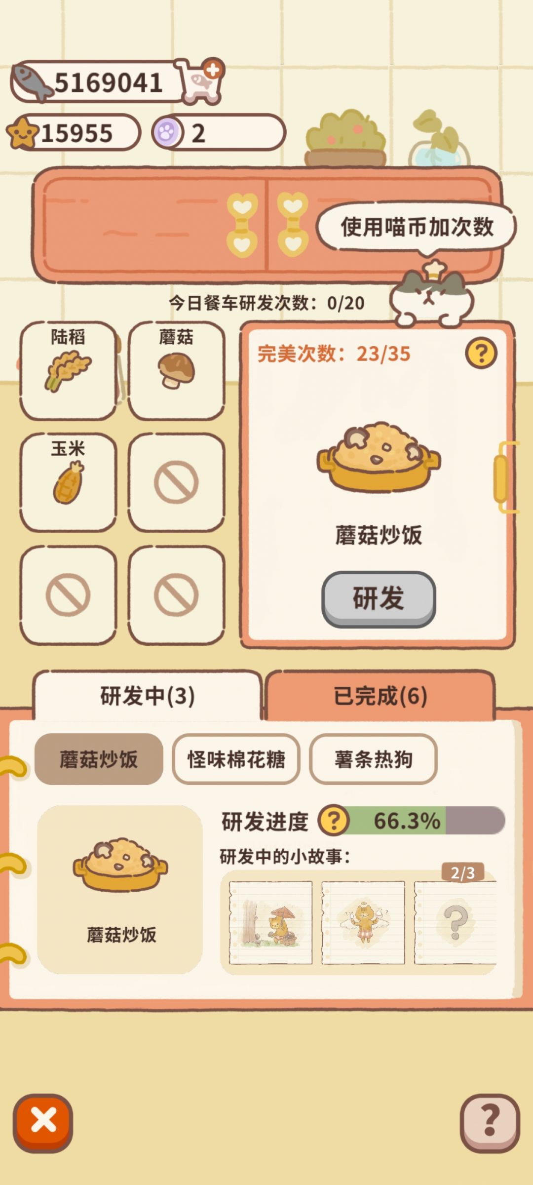 过了一个星期左右吧,现在已经达到可以参加二星评选的标准了,但看了攻略,要几千万鱼干,感觉好难攒就还没开。目前基本上前院的游戏机优秀类型的已经买完了,可能圣诞节看情况选择要不要买限定的。一天差不多能有两万多胶卷,要攒一段时间把三号前院开了,就可以买宠物互动道具加速升级宠物了。攒了好久的钻买了一个前院喇叭,超级好看嘿嘿。这次活动已经换了四个灶台了,不错不错。研究创意食谱也就剩下三个没研究完了,倒数第三个差不多明天就能研究完,就是攒纽扣币真慢,到现在也只买了一个眼镜,后面要买全还要攒五万纽扣币。铃铛大部分都被我用来买招租广告牌了。剩下的一些买头饰但点赞量不够也没买多少。还有就是去换季节了。大雪纷飞的时候我的餐厅还是春天嘿嘿。