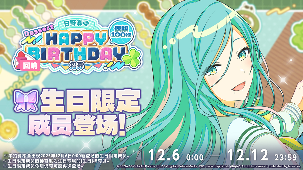 12/6 00:00起将举办「[日野森雫] HAPPY BIRTHDAY 2025招募」、「[回响][日野森雫] HAPPY BIRTHDAY Dessert招募」、「[回响][日野森雫] HAPPY BIRTHDAY Stamp招募」、「[回响][日野森雫] HAPPY BIRTHDAY Flower招募」🎉
