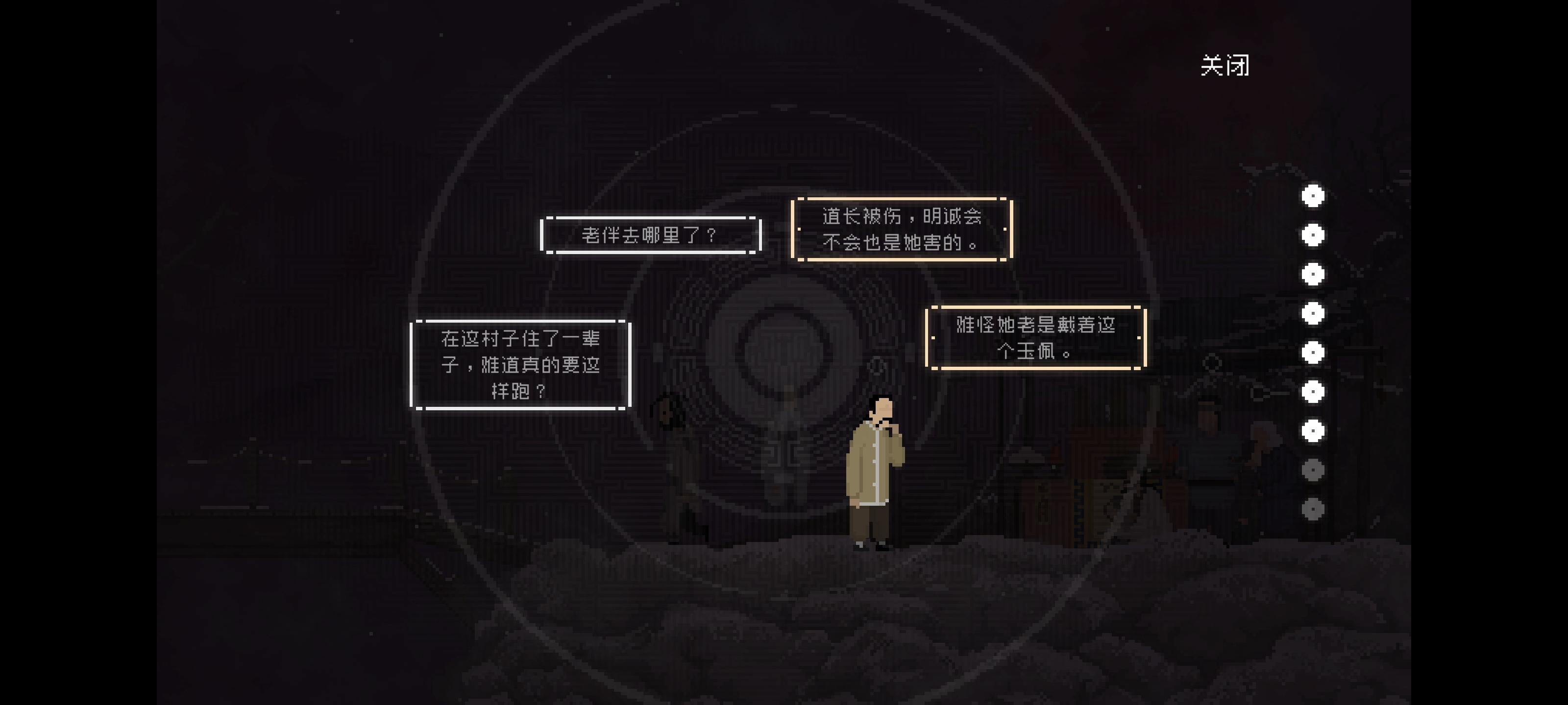 长按岳老六的想法“这个疯女人居然伤了道长士”和“这玉佩果然不是什么好东西”或者长按黄衣服(忘记他叫啥了)的想法“道长被伤,明诚会不会也是她害的”和“难怪她老是戴着这个玉佩”均能获得感知“叶瑛伤道长”和“玉佩是邪物”