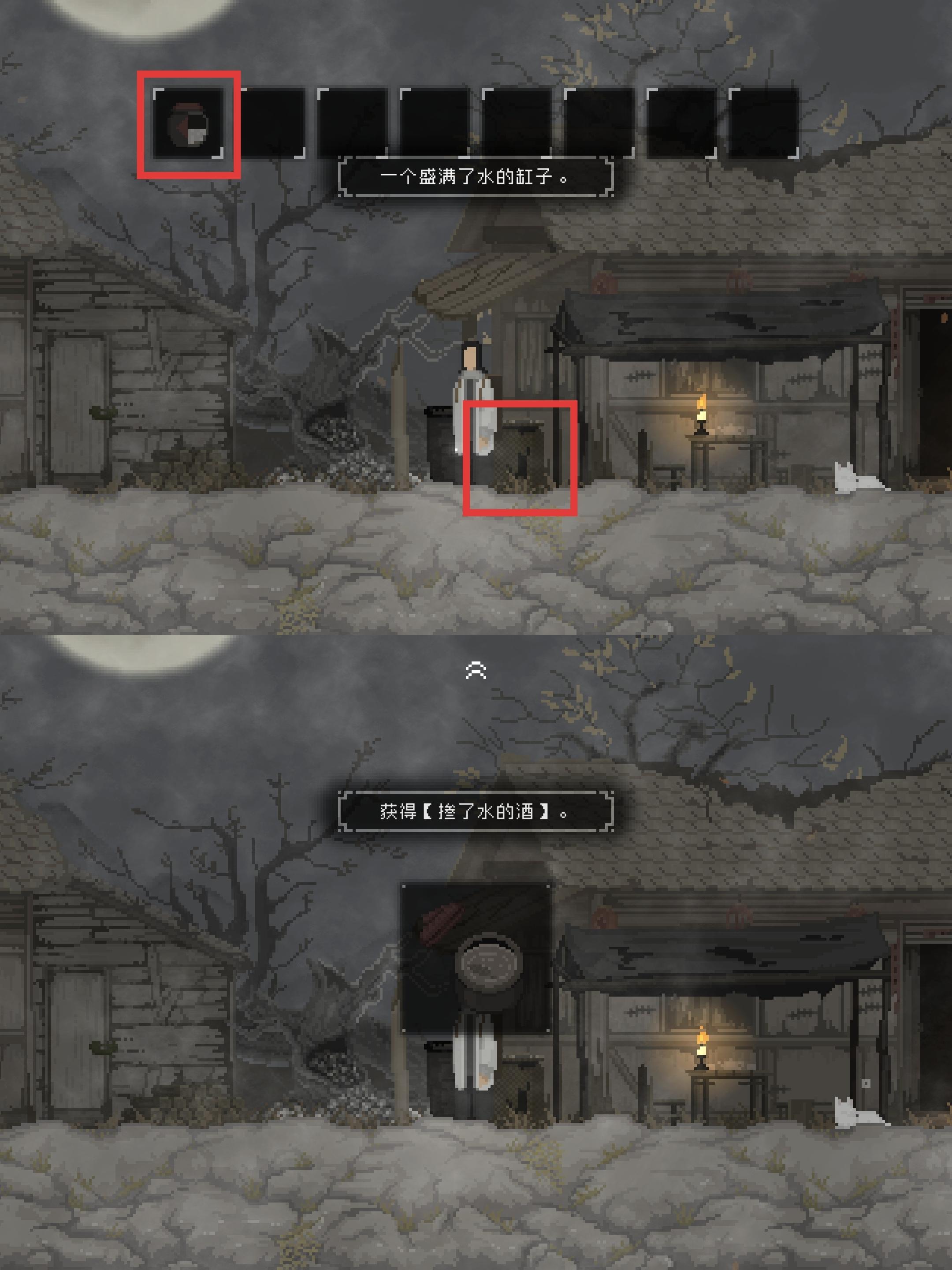 分支:前往茶水摊外的院子 将半坛酒倒入水缸 获得“掺了水的酒”(剧情虽然能继续推进 但会被土地公吐槽这酒怎么掺了水)