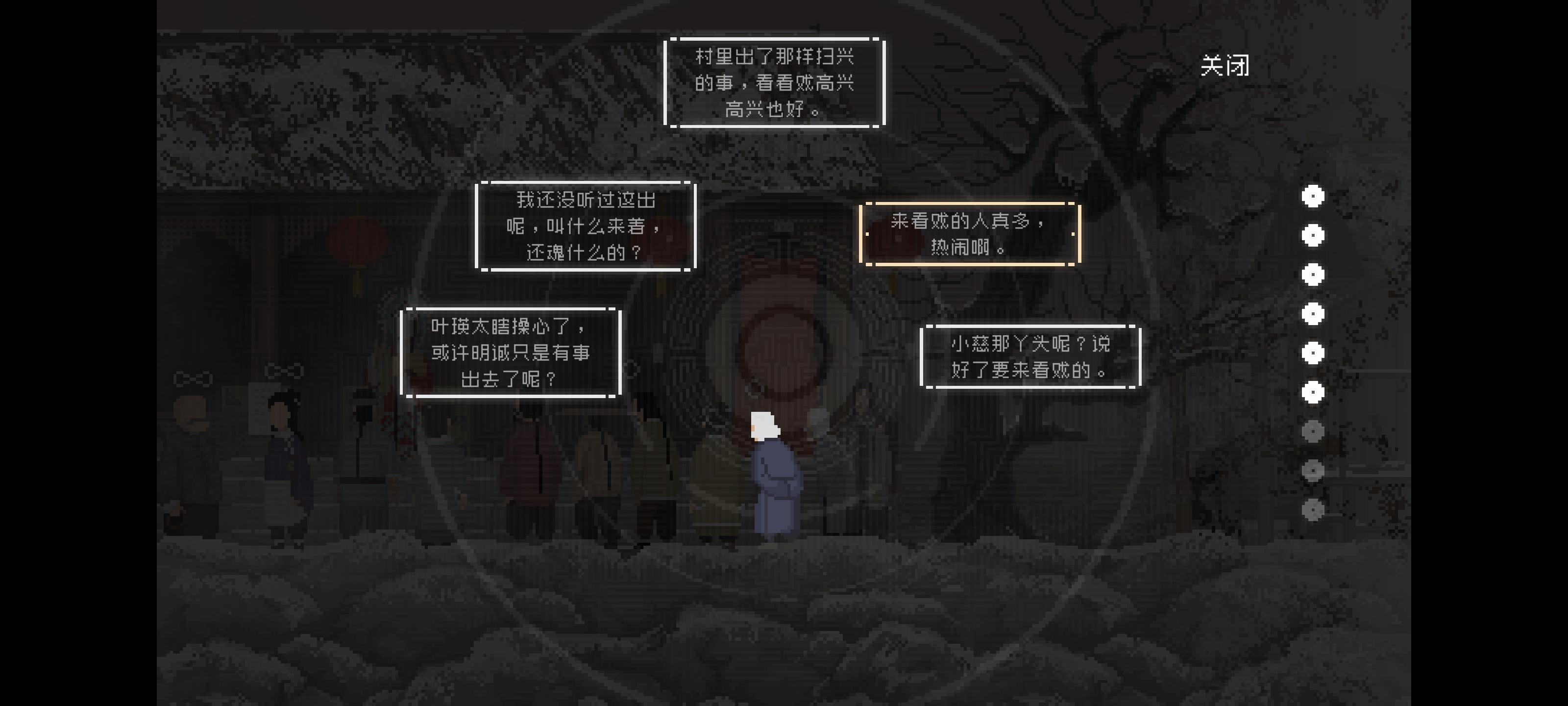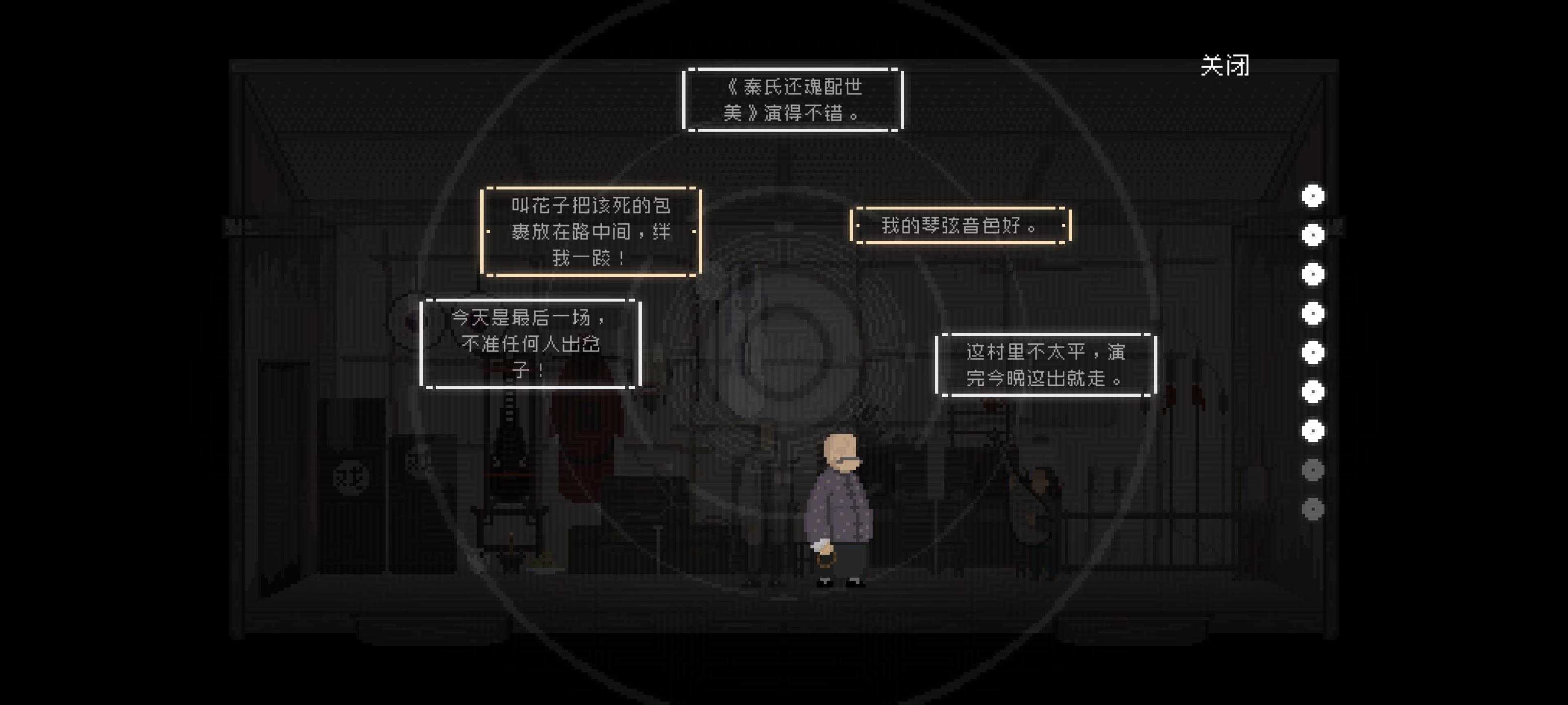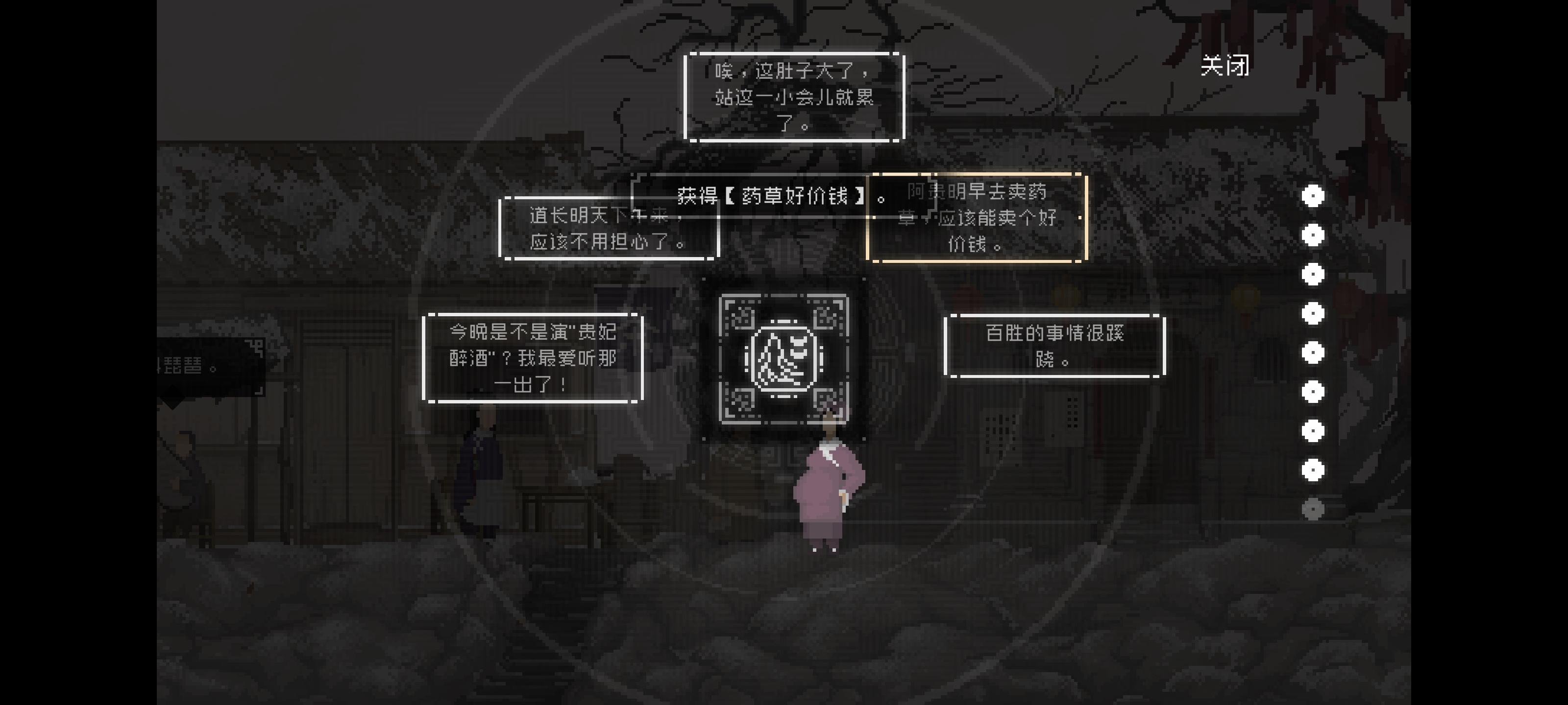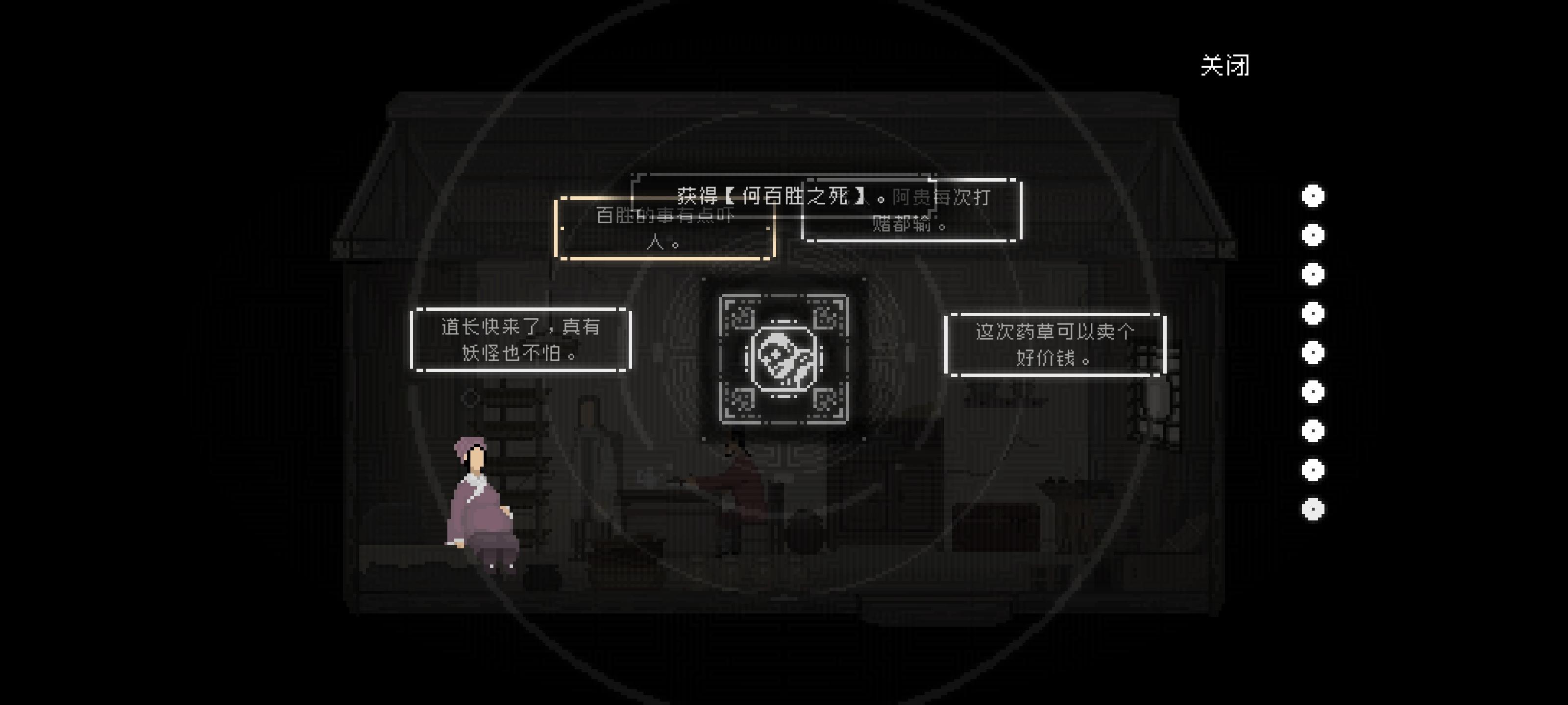 长按班主的想法“我的琴弦音色好”和“叫花子把该死的包裹放在路中间,绊我一跤”获得感知“班主的琵琶”和“遗落的东西”