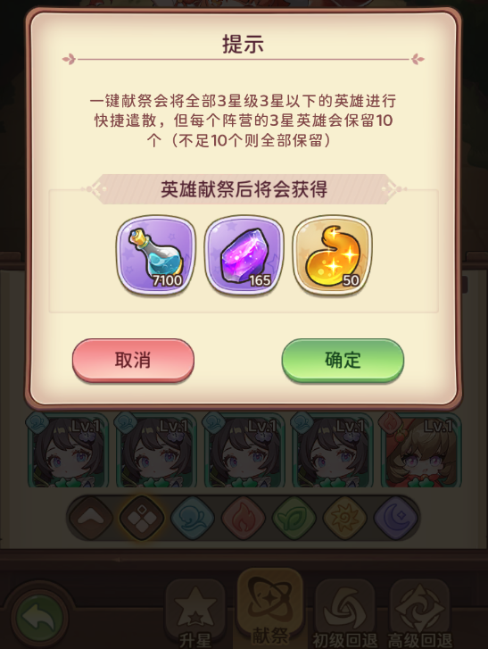 这里可以献祭多余的英雄/2星英雄噢,献祭可以获得英雄经验和进阶石