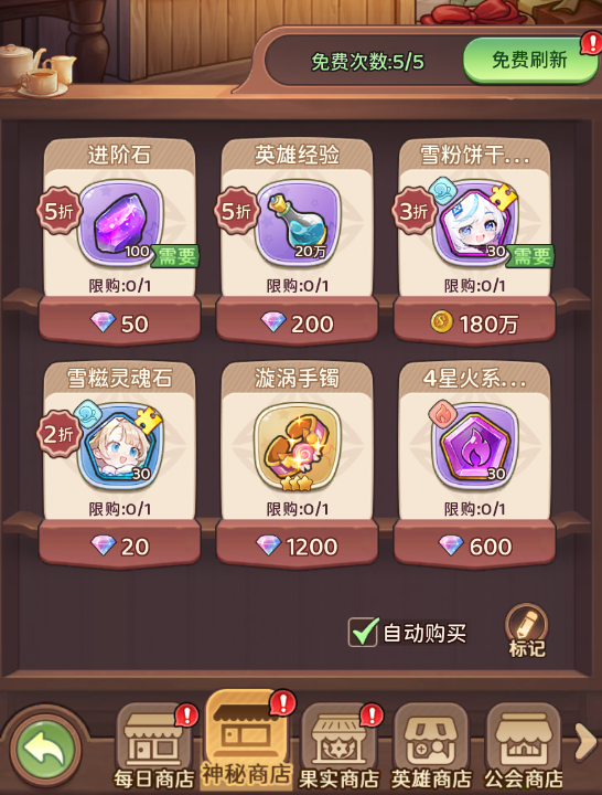 神秘商店每天免费刷新5次,钻石刷新100次,大家刷商店的时候主要勾选进阶石、英雄经验(如果金币不够的情况下不建议大家用金币购买资源噢,金币要留给升级英雄哒!)