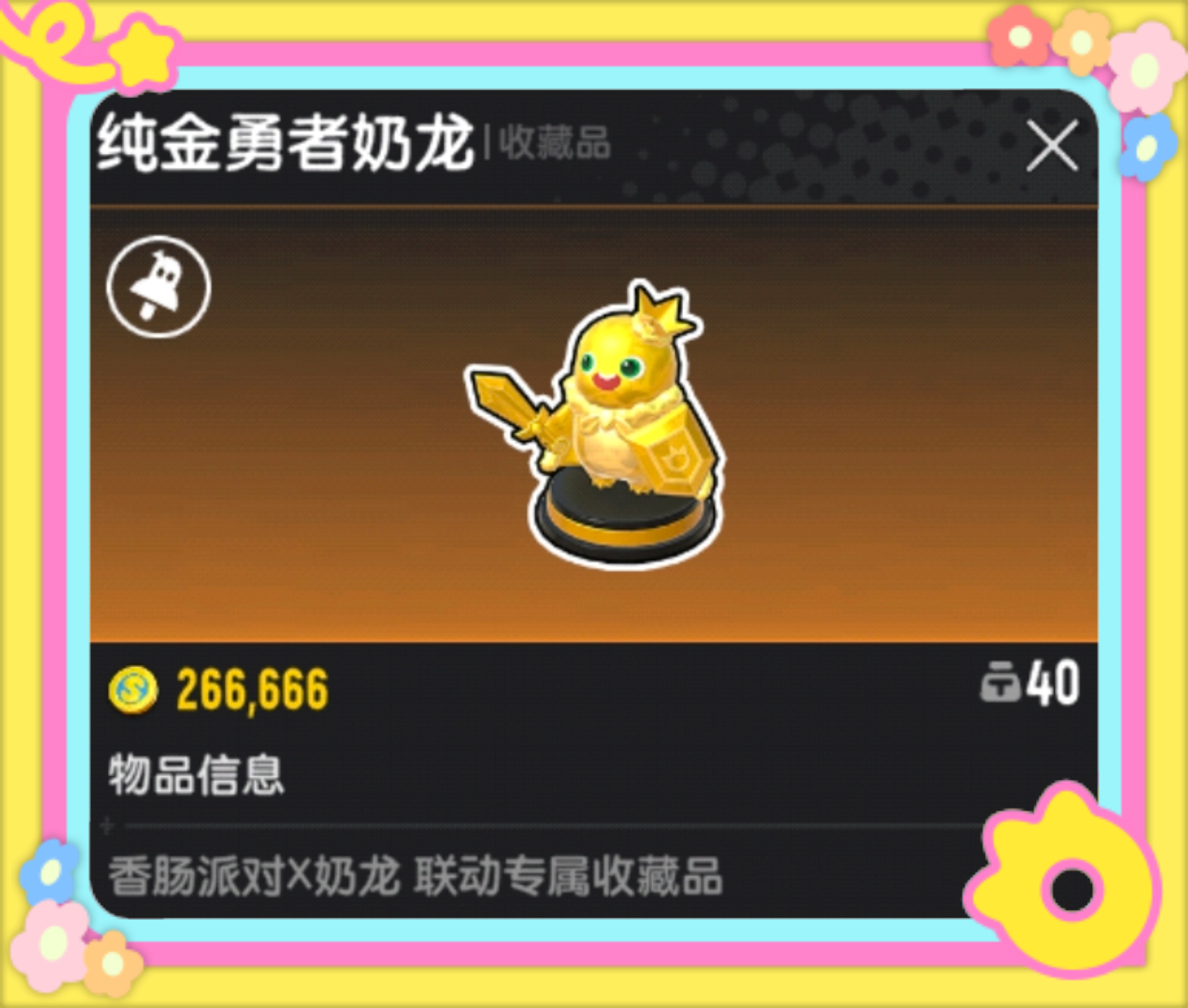 以上就是本期香肠派对×奶龙联动传说品质收藏品的情报!快快「转发」分享给好肠友,一起加入摸金派对把这份闪亮亮的勇者收藏品带回家吧!