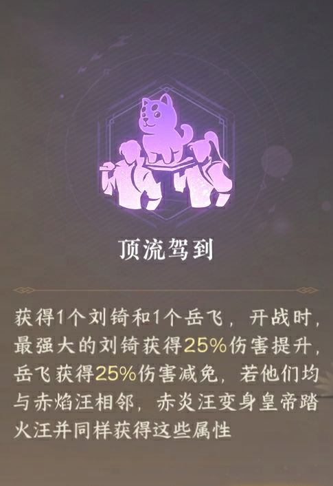 【顶流驾到】:获得1个刘锜和1个岳飞,开战时最强大的刘锜获得25%伤害提升,岳飞获得25%伤害减免,若他们均与赤焰汪相邻,赤炎汪变身皇帝踏火汪并同样获得这些属性
