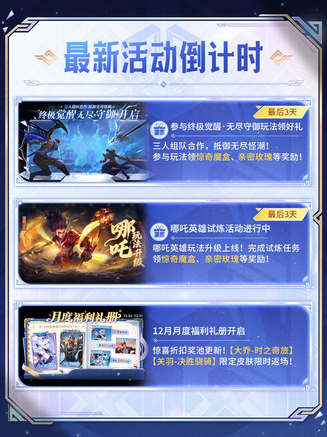 12月月度福利礼册开启!【大乔-时之奇旅】、【关羽-决胜骁骑】限定皮肤限时返场!