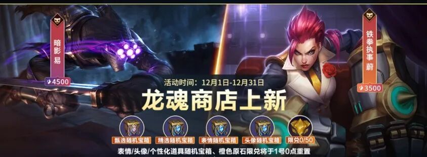 即日起至12月31日活动期间,暗影 易和铁拳执事 蔚轮换上架龙魂商店,还有新一轮橙色原石*50可供兑换~