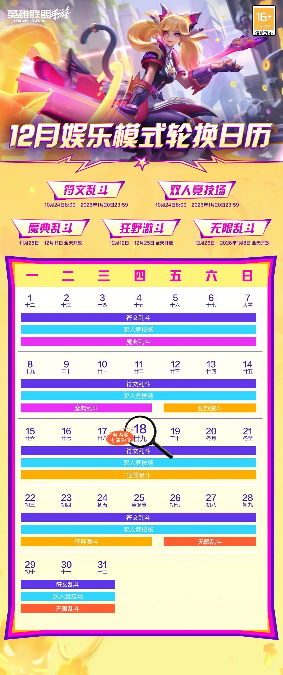 12月娱乐模式轮换日历新鲜出炉!符文大乱斗、魔典大乱斗、双人竞技场模式限时全天开放中,更有狂野激斗、无限乱斗模式即将轮换开启~12月18日新内容专属彩蛋等你解锁!