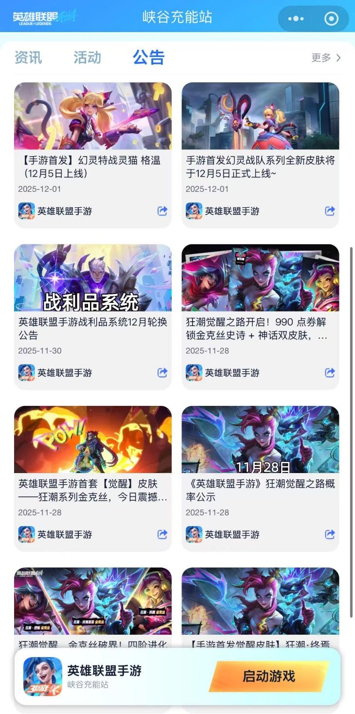 召唤师还可通过小程序首页的资讯、活动、公告,来了解最新发生的峡谷要闻。