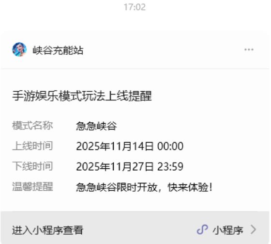 《英雄联盟手游》峡谷充能站小程序,订阅测试现已开启,召唤师们可点击下方【小程序卡片】,跳转至峡谷充能站小程序,订阅自己喜欢的娱乐模式与心愿皮肤,通知信息会及时通过微信“服务通知”提醒,精彩尽在掌握!