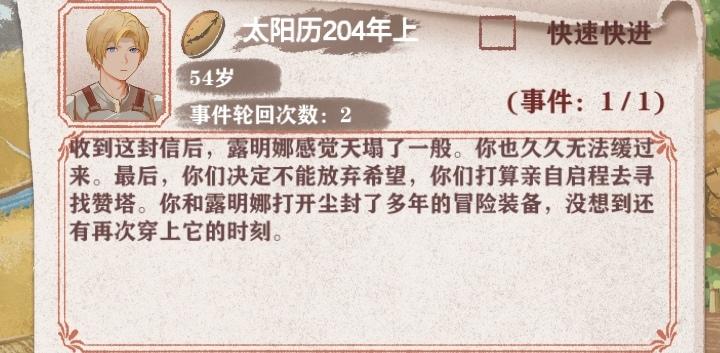 · 收到这封信后,露明娜感觉天塌了一般。你也久久无法缓过来。最后,你们决定不能放弃希望,你们打算亲自启程去寻找赞塔。你和露明娜打开尘封了多年的冒险装备,没想到还有再次穿上它的时刻。