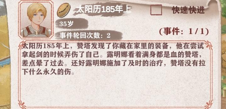 · 赞塔发现了你藏在家里的装备,他在尝试拿起剑的时候弄伤了自己。露明娜看着满身都是血的赞塔,差点晕了过去。还好露明娜施加了及时的治疗,赞塔没有拉下什么永久的伤。