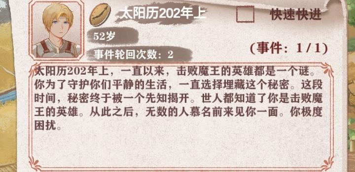 · 一直以来,击败魔王的英雄都是一个谜。你为了守护你们平静的生活,一直选择埋藏这个秘密。这段时间,秘密终于被一个先知揭开。世人都知道了你是击败魔王的英雄。从此之后,无数的人慕名前来见你一面。你极度困扰。