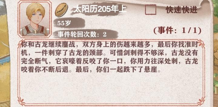 · 你和古龙继续鏖战,双方身上的伤越来越多,最后你找准时机,一剑刺穿了古龙的颈部。可惜剑刺得不够深,古龙没有完全断气,它哀嚎着反咬了你一口,你用力往深处刺,古龙咬着你不断后退。最后,你们一起跌下了悬崖。